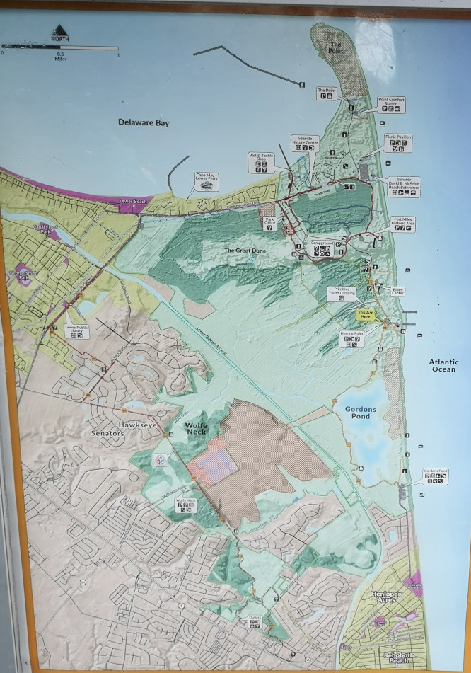 For our last day at Cape Henlopen SP we did a 30 km bike ride to the Biden Centre (being restored), Battery Smith (had to see that one), Herring Point, along the Gordons Pond trail to whiskey beach, then on the bike trail through Rehoboth Beach and returned through the Wolfe Neck area of the state park along the Junction and Breakwater trail which was an old rail line. There had been a marathon race that morning and we did see several stragglers, especially in Rehoboth Beach. The bike trails were a combination of gravel, composite boardwalks, and paved bike lanes. Once in Lewes we saw the location of the old swing bridge and then saw where they had relocated it to as a historic artifact. Once back in the SP we rode by one more of the Observation towers.