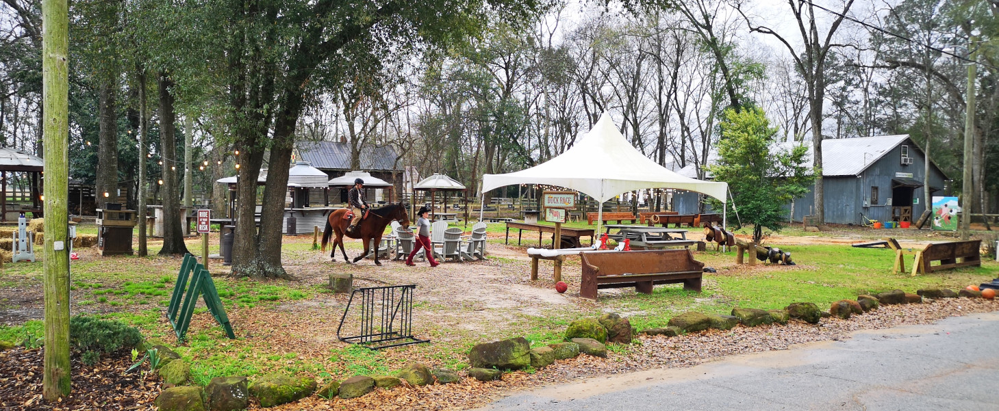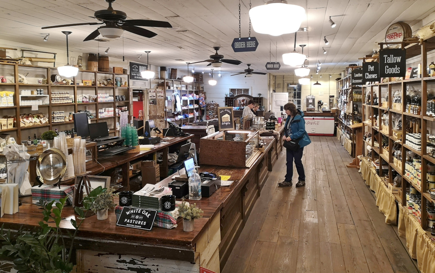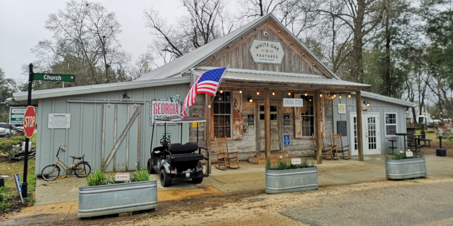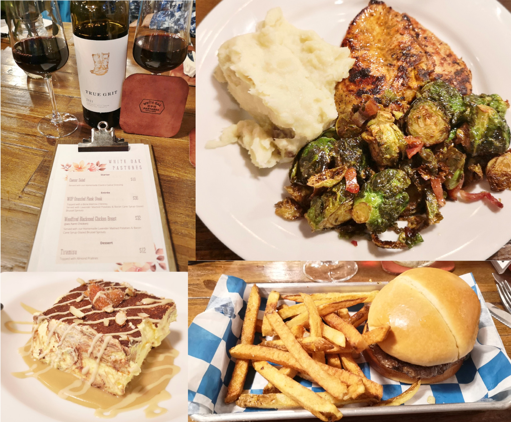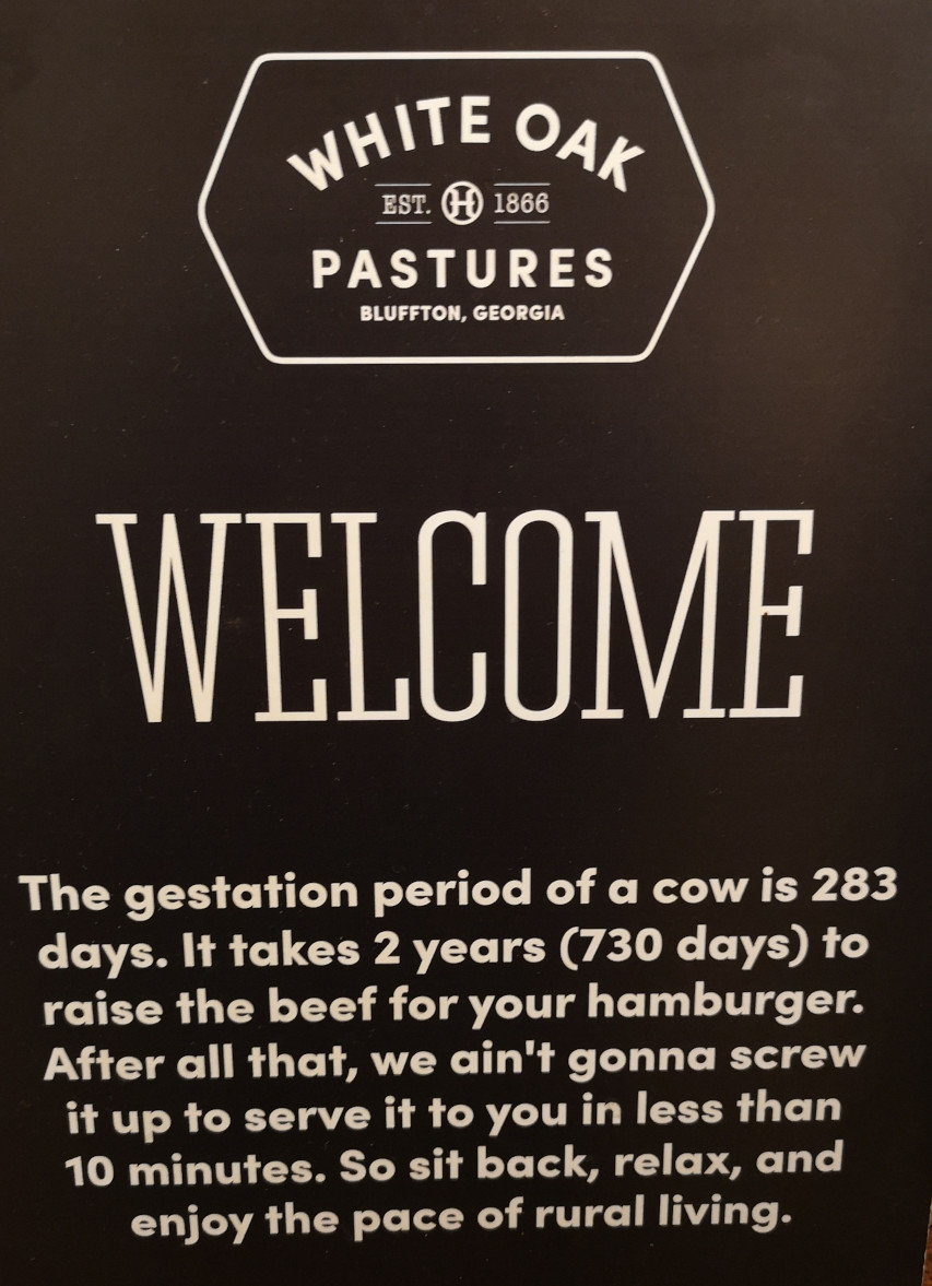 Our harvest host for the next night was White Oak Pastures which is a cattle farm that uses humane and regenerative farming practices. The livestock are grass fed and raised without the use of antibiotics or added growth hormones. The operation was quite large and employs a lot of people. It almost seemed like the owners controlled everything in the small community. We checked in at the general store and then went to the pasture where we would be camped for the night. There was just one other camper staying that night. Attached to the store was a restaurant so we went there for dinner that night, a treat for us as we’re usually going out for lunch enroute to our next park. We had True Grit wine (you could just go pick your bottle from the store), Sharon had the Woodfired Blackened Chicken Breast with Brussel sprouts, I had the Black and Bleu Burger, and we had homemade Tiramisu for dessert, all very good. They had horse back rides and farm tours, but it was raining the next morning, so we opted out.