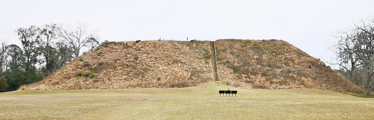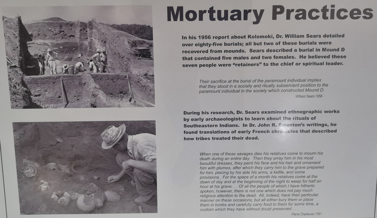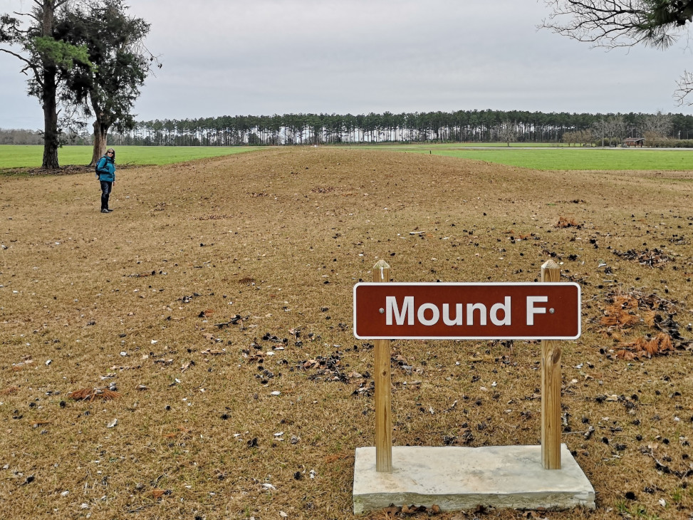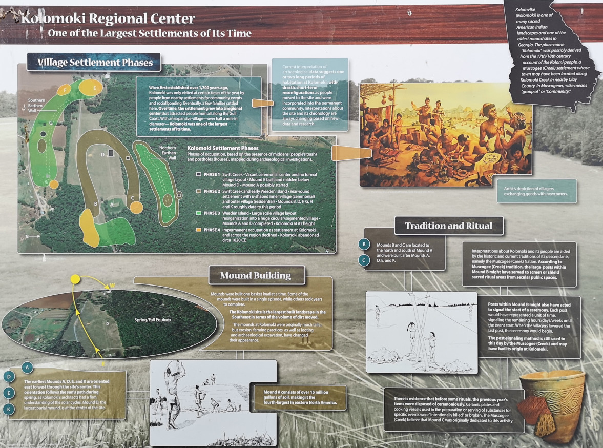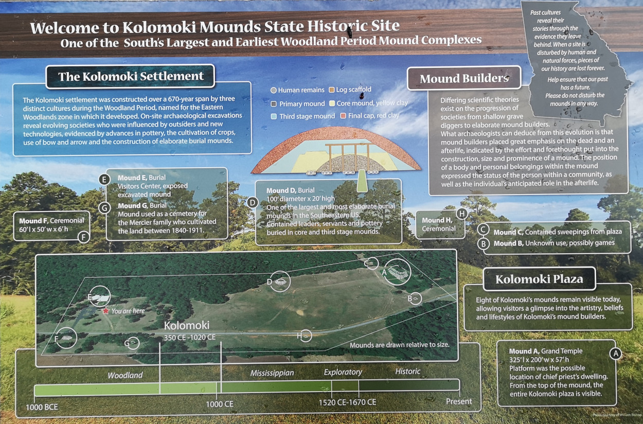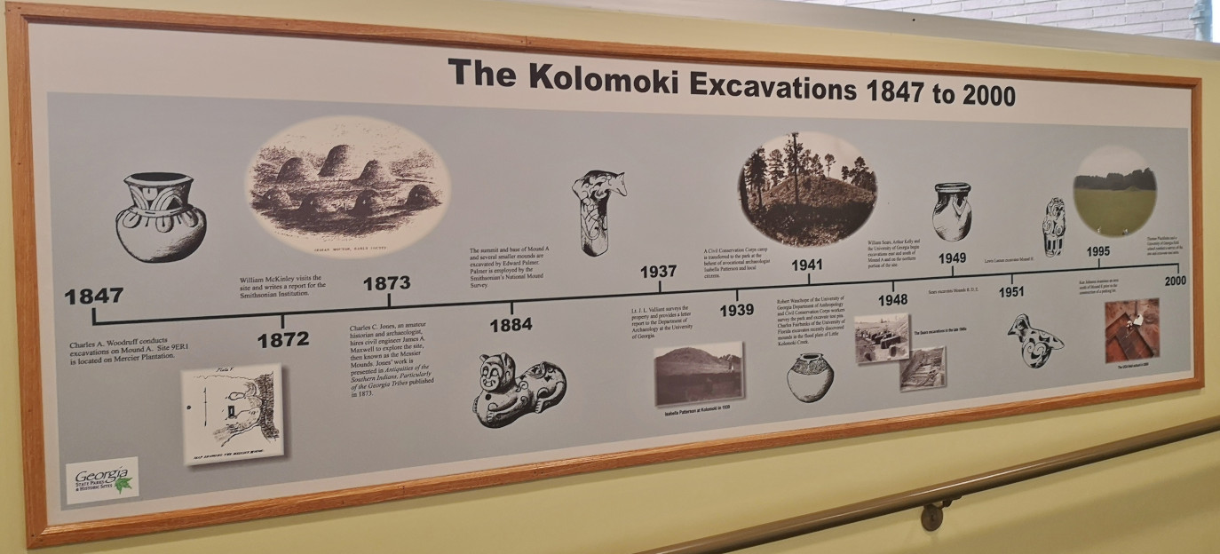 Our next stop was Kolomoki Mounds SP for 2 nights. Although we had to call the Georgia SP call centre to book it because on weekends, they have a 2-night minimum and the online booking wouldn’t let us book 1 site for Saturday night and a different site for Sunday night (which was all that was available). This historically significant park is the oldest and largest Woodland Indian site in the southeastern US, occupied by American Indians from 200 to 900 AD. The site is 197 acres and contains 9 mounds and a village. The park has Georgia’s oldest great temple mound, standing 56’ high, with 2 smaller burial mounds nearby and several ceremonial mounds in the area. The park’s museum is built around an excavated mound, providing an unusual setting for learning who these people were and how they lived. The museum has several pottery artifacts and a film with one of the head archaeologists talking about the history. Since we arrived before the official check in time, we visited the museum first. Here are some of the key facts we learned: