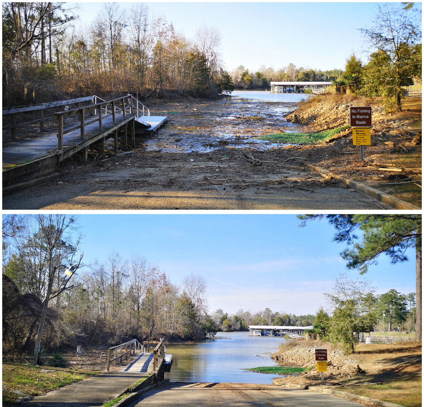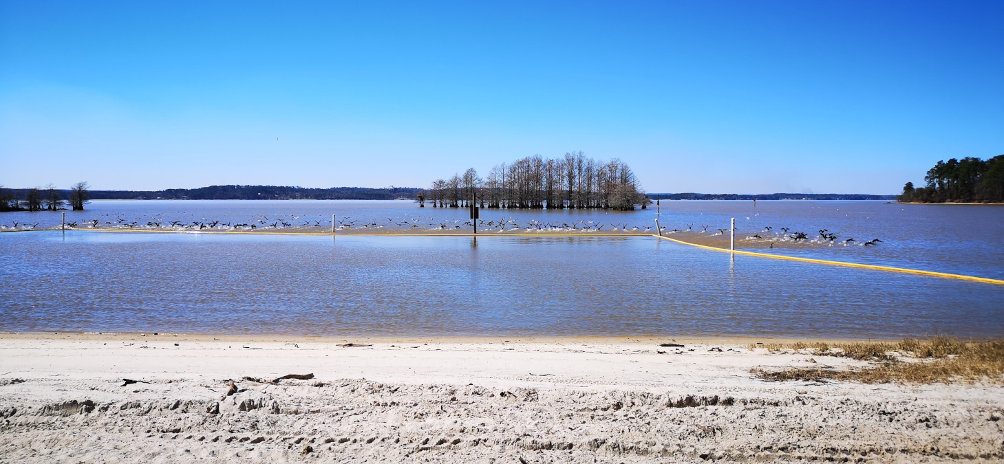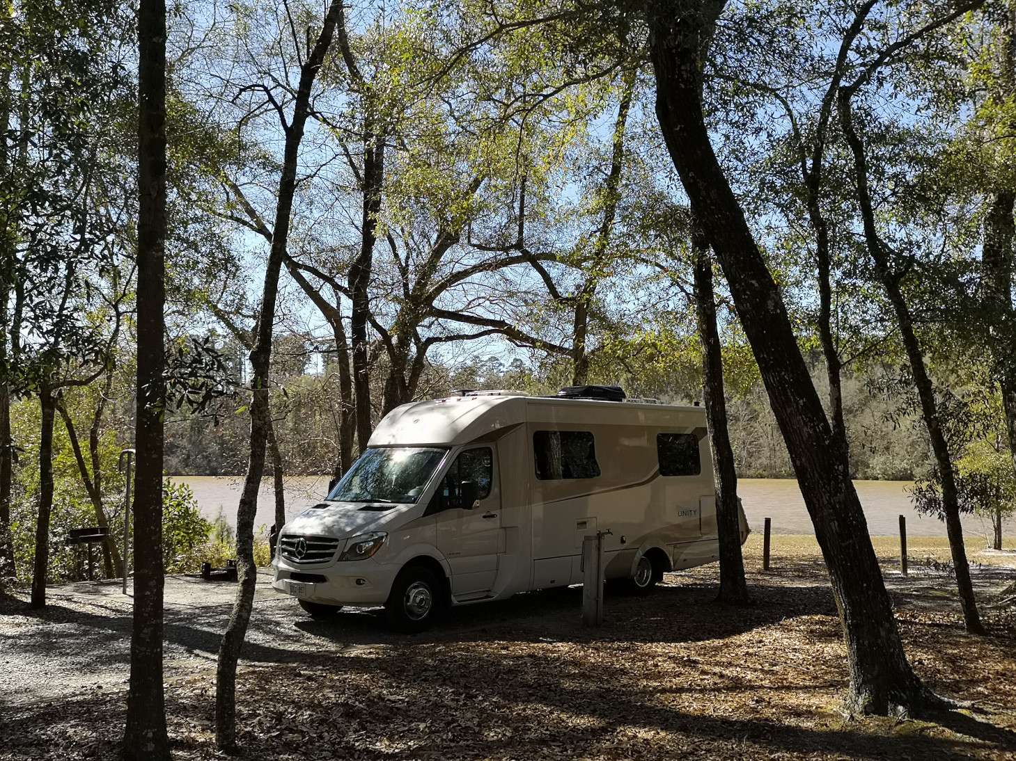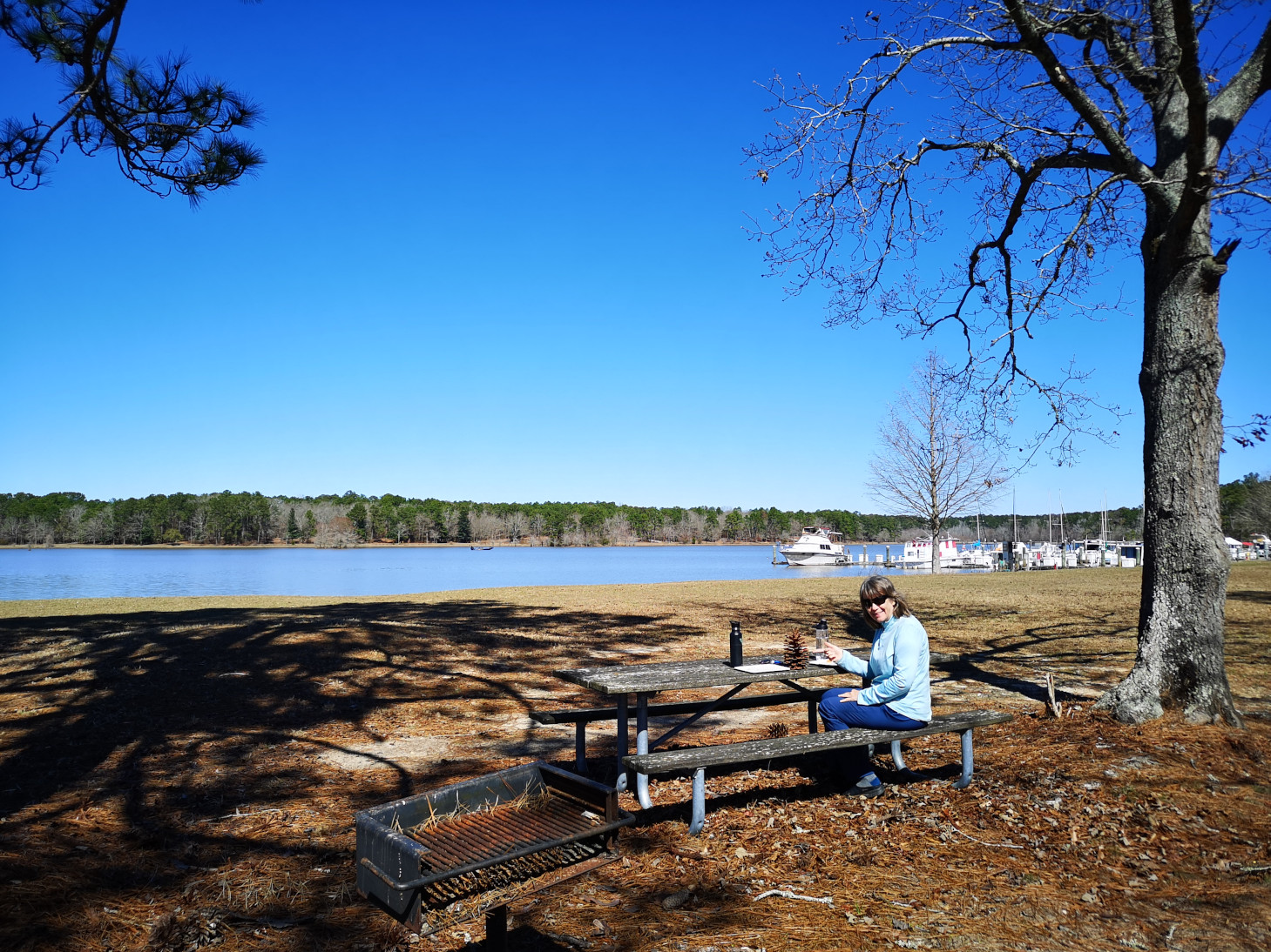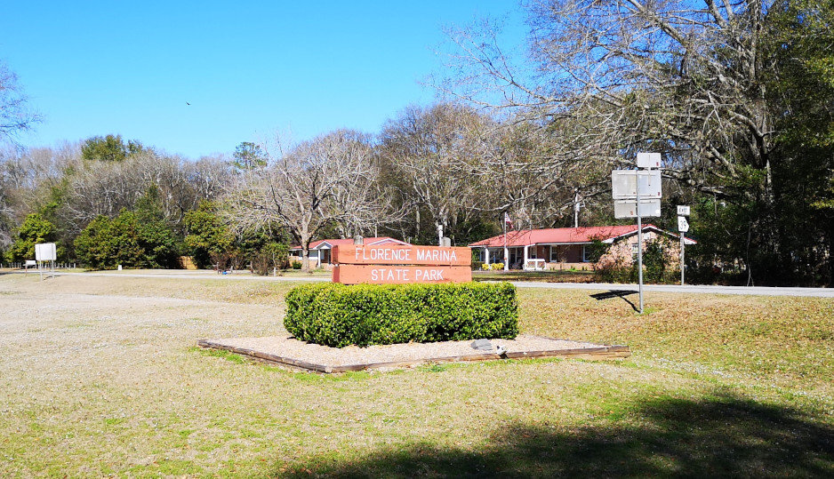 We were successful in getting a 2-day booking in St. George Island SP in Florida for Feb 28-29, so we worked to fill the days to match with that booking. Unfortunately, this is what you have to do because it’s so difficult to get bookings in Florida State Parks. So, we decided to head north to Florence Marina SP along the Georgia/Alabama border for a 4-night stay. On the way we stopped in George T. Bagby SP for lunch, this park doesn’t have any camping. We found a picnic table by the marina where we could eat lunch and watch the bass fisherman out on the lake. As we drove out of the park we saw a huge number of turtles in a swampy area, a huge number of cormorants resting on the swimming area markers, and we also saw 4 white tailed deer, but we couldn’t get a photo.