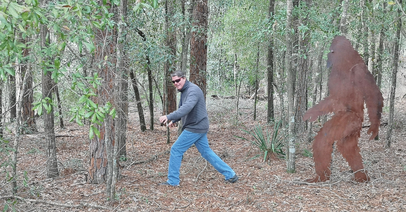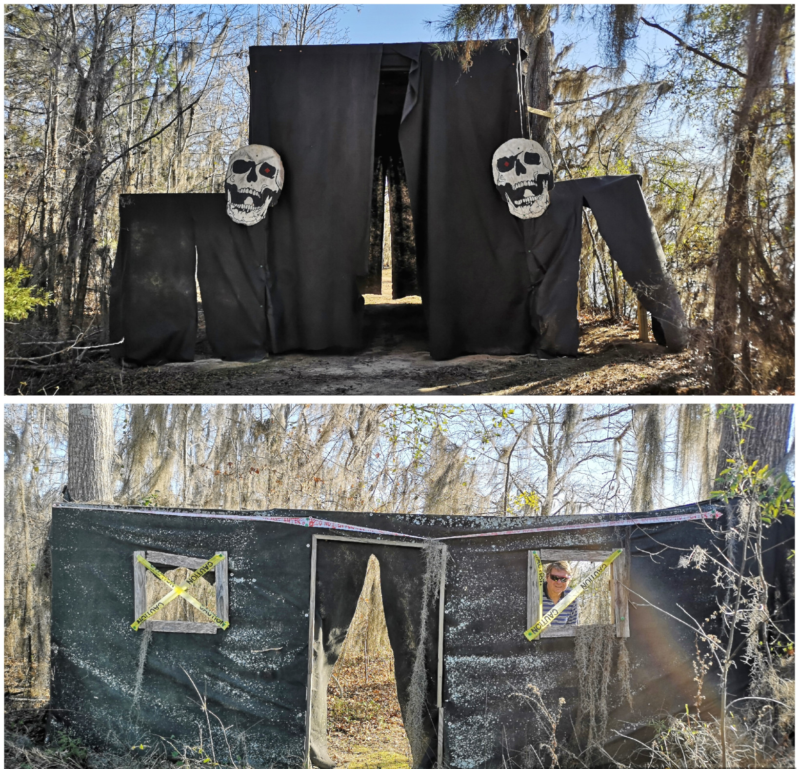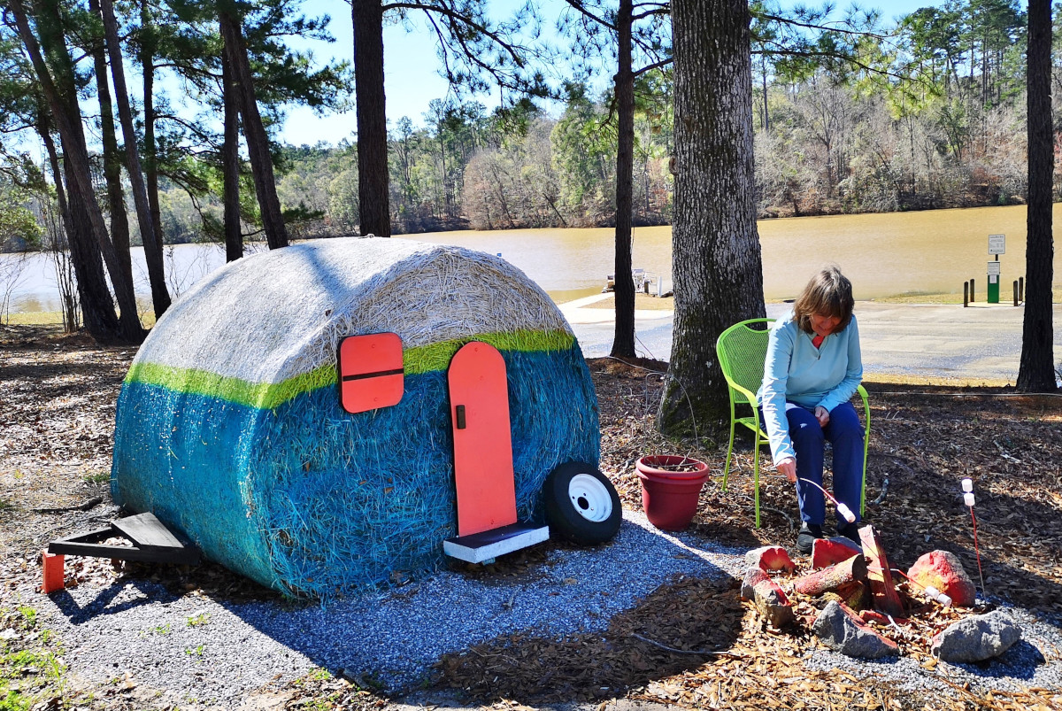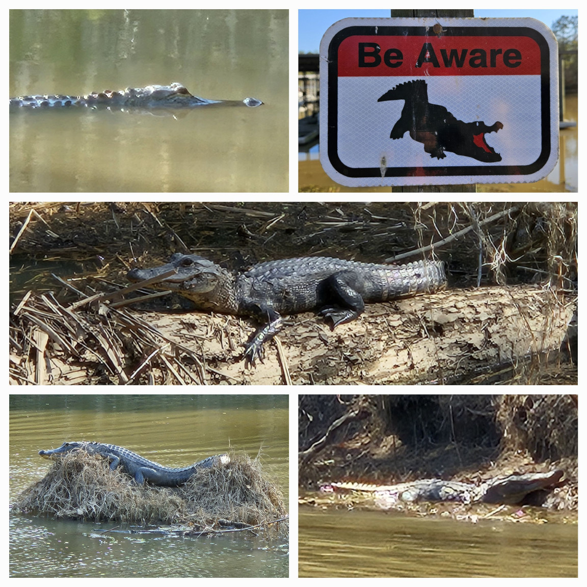 Florence Marina SP is unique in that it has a deep-water marina with boat slips right in the park. However there had been a a really bad rainstorm before we arrived, and all kinds of debris had floated down the Chattahoochee River and filled up the marina area. The park volunteers were under way with a big cleanup to pull the debris out into the river to clear the marina. After we got setup in our site, we went for a 7 km hike on the few trails in the park and also one in the Eufaula Wildlife Refuge. On the trails in the park there was a weird setup with skulls, and we found out later it was for Halloween festivities. We also got to see the largest Alligators we’ve seen on this trip with a 6’ and what looked like an 8’ one. We also saw an Anhinga bird (we learned later) and it was really bizarre to watch him swim as he looked like a snake sticking his head out of the water. He swam over to the island the 6’ alligator was on and was squawking at the alligator.
