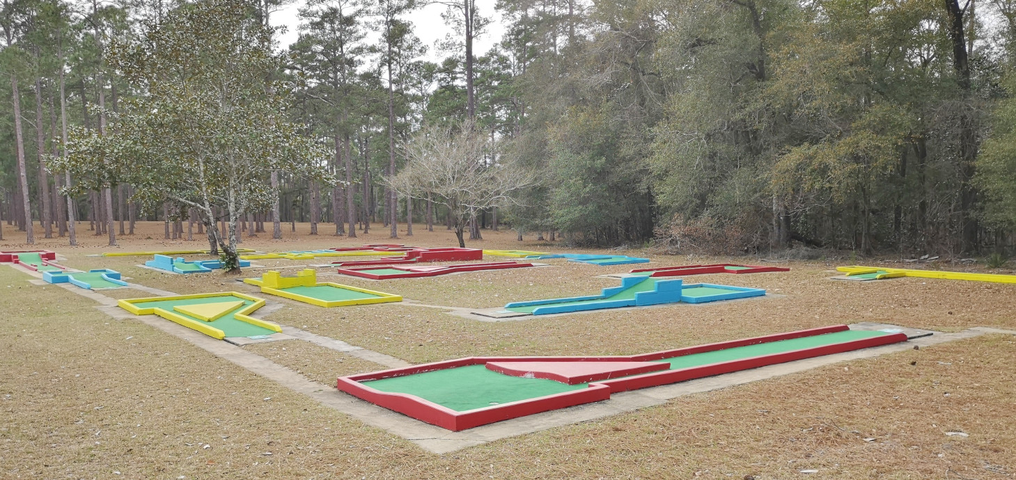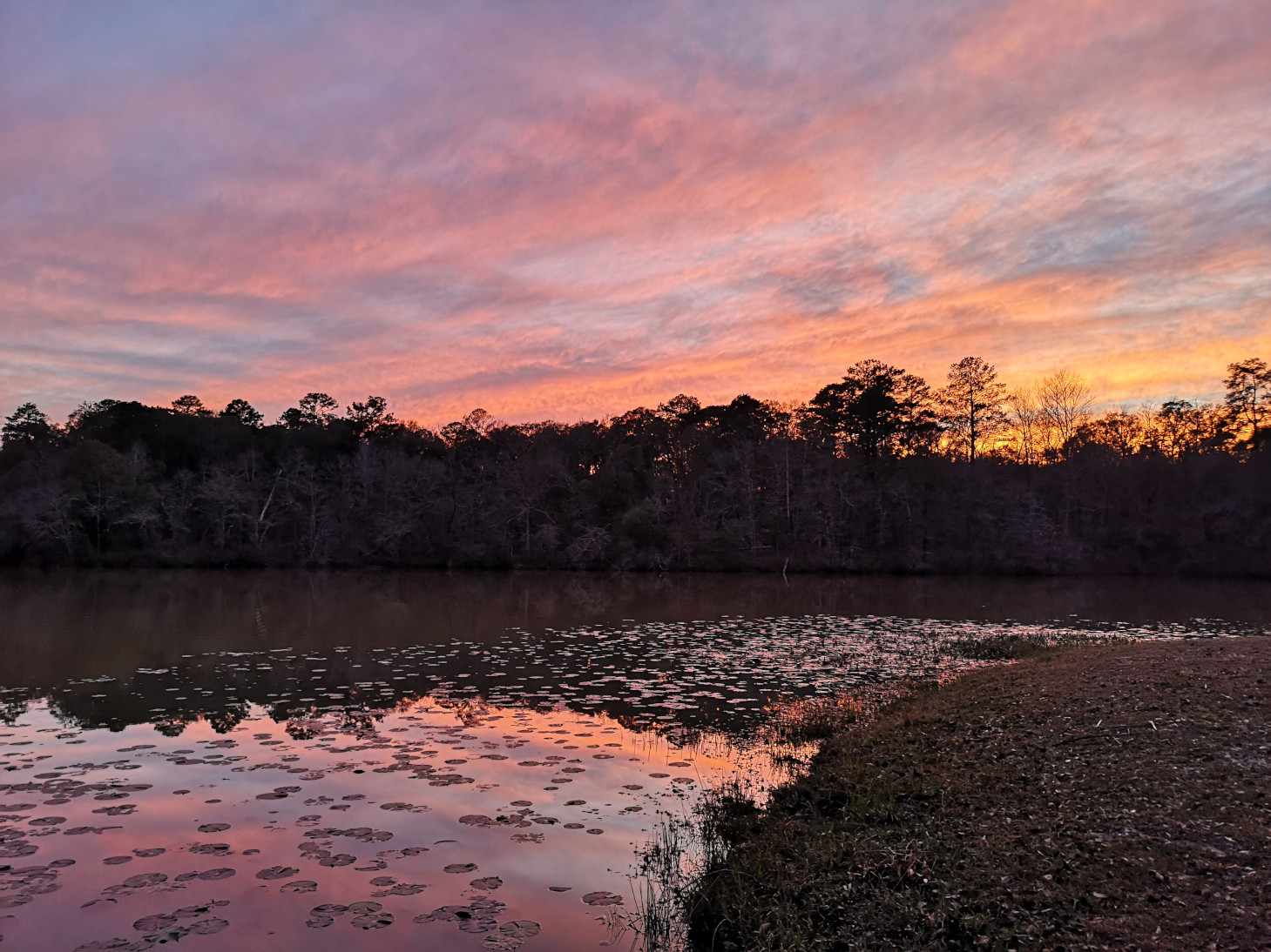 The following day we had to wait for the other camper to leave our new site, which was directly on the lake, so we did a 4 km walk around the grounds from the visitor centre so we could see the actual mounds. As you will see from the photos some of them were quite small, but the temple mound was huge. There was also Mound G which was the family cemetery for the Mercier’s that owned the property before it became a State Park. Once we got setup in our new campsite, we enjoyed all the birds around the RV and then went for another walk to see the CCC built dam that created Lake Kolomoki and circled around the campground road to see the miniature golf course, almost all the Georgia State Parks have them. That evening we had a gorgeous sunset from our campsite. On our way out of the park the next day we stopped for another picture of the temple mound with blue sky.