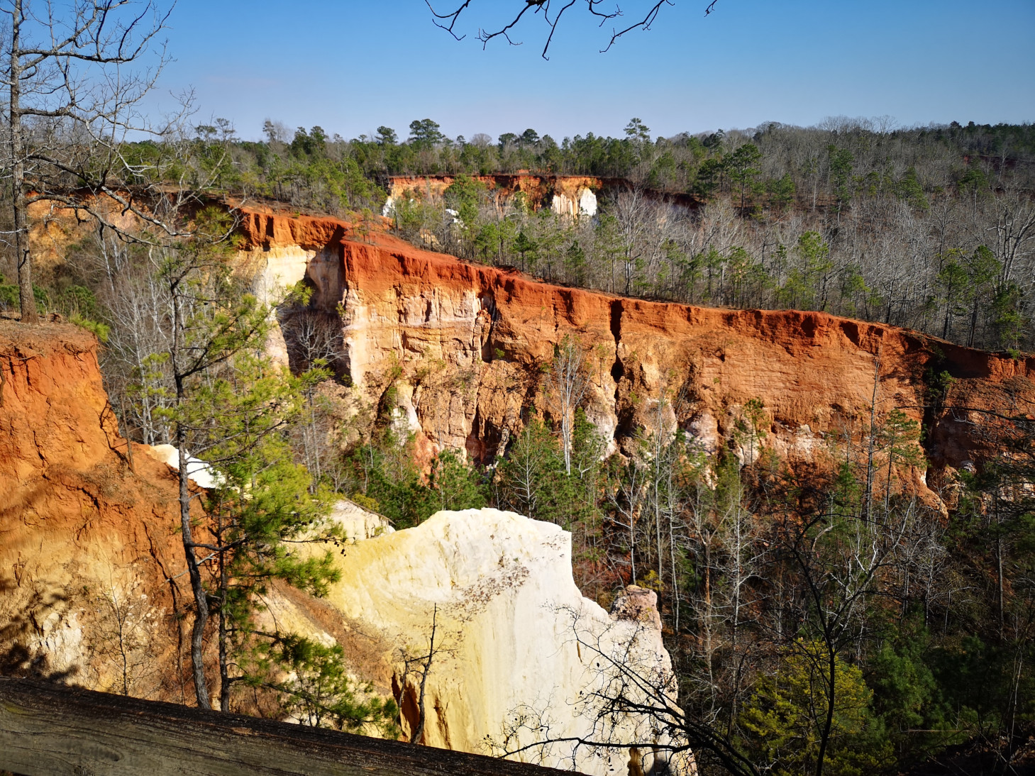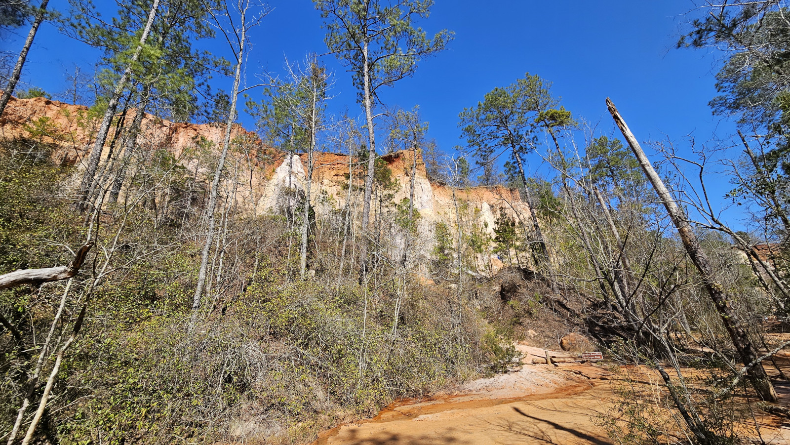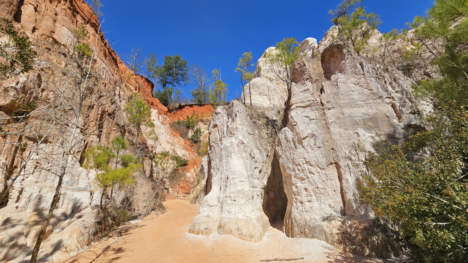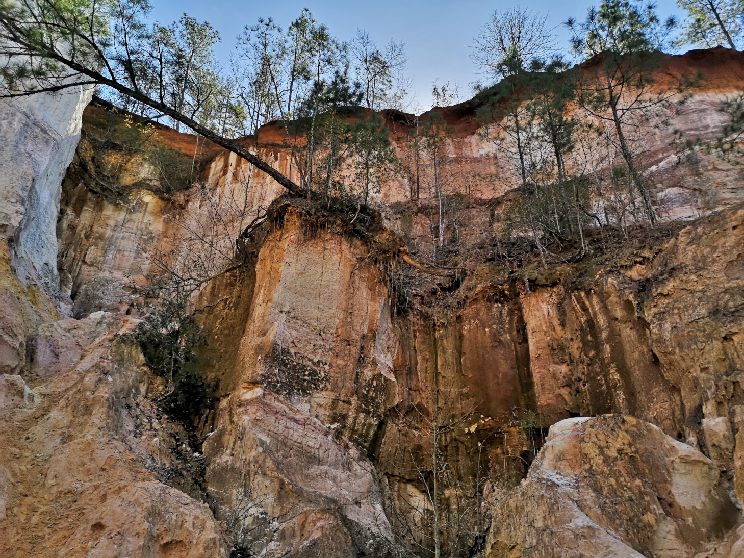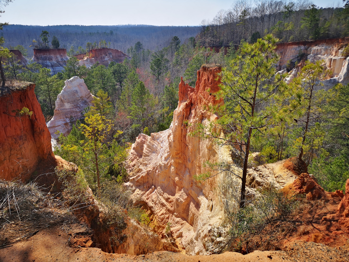 The next day we drove to Providence Canyon SP, also known as Georgia’s Little Grand Canyon. The park is 1,003 acres in size and is a geological marvel. The canyons were formed due to poor farming practices by the early settlers. In the early 1800’s all the trees were cleared to plant crops, but the soft soil all started to wash away as the tree roots had been holding the soil in place. In the 1850s the ditches were three to five feet deep, today they are as deep as 150 feet! There are 43 different shades of soil so there were lots of photo ops this day!! The colours range from white to various shades of pink, purple, red, brown, yellow, and black. The name of the canyon came from the Providence Methodist Church that was built in 1832. The park only has a few primitive campsites so it’s a popular day trip from the surrounding area.