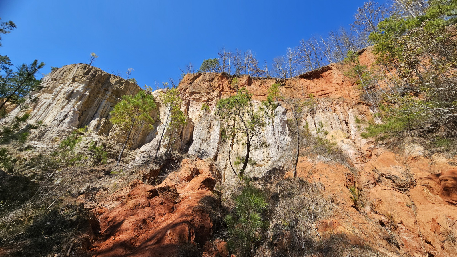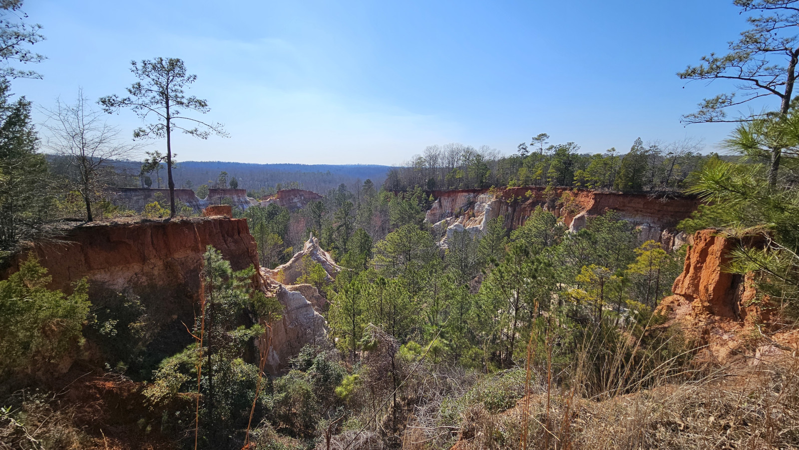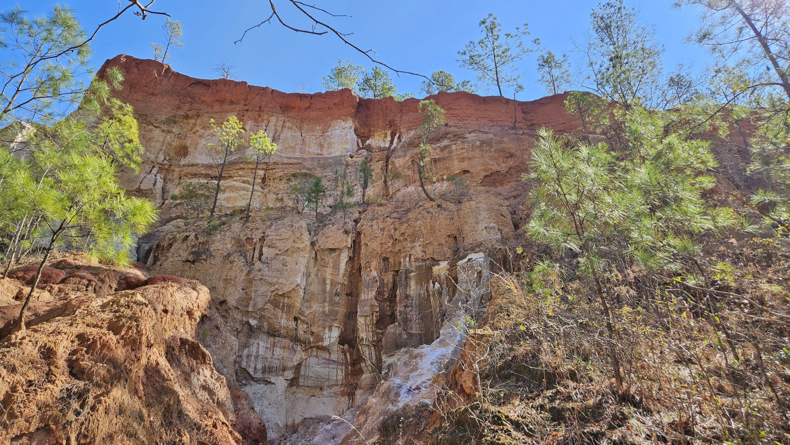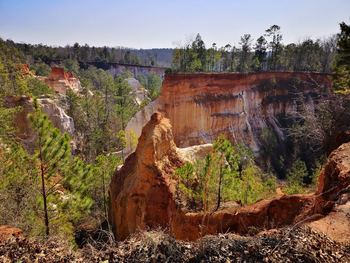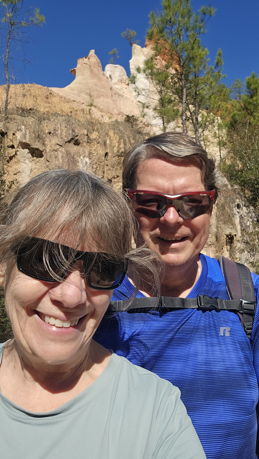 The next day we drove to Providence Canyon SP, also known as Georgia’s Little Grand Canyon. The park is 1,003 acres in size and is a geological marvel. The canyons were formed due to poor farming practices by the early settlers. In the early 1800’s all the trees were cleared to plant crops, but the soft soil all started to wash away as the tree roots had been holding the soil in place. In the 1850s the ditches were three to five feet deep, today they are as deep as 150 feet! There are 43 different shades of soil so there were lots of photo ops this day!! The colours range from white to various shades of pink, purple, red, brown, yellow, and black. The name of the canyon came from the Providence Methodist Church that was built in 1832. The park only has a few primitive campsites so it’s a popular day trip from the surrounding area.