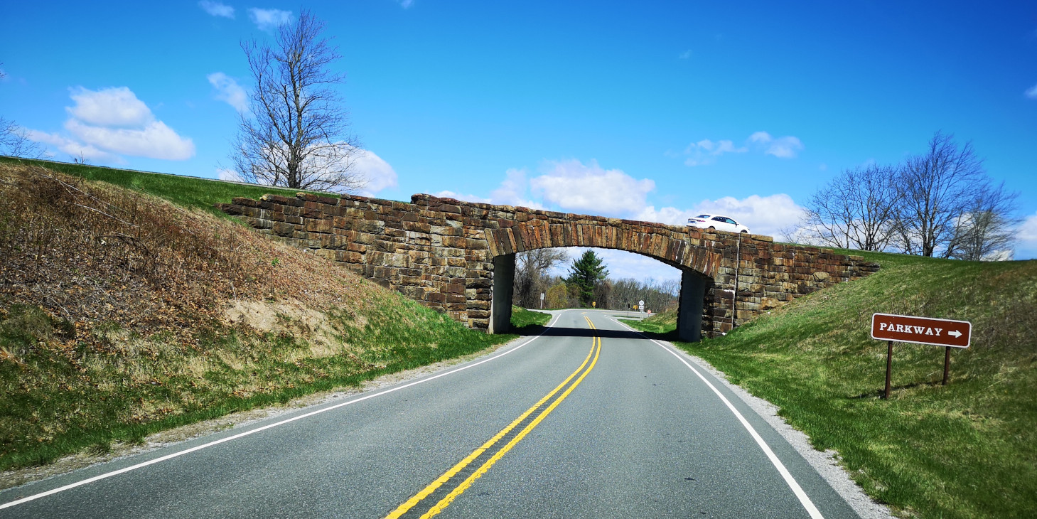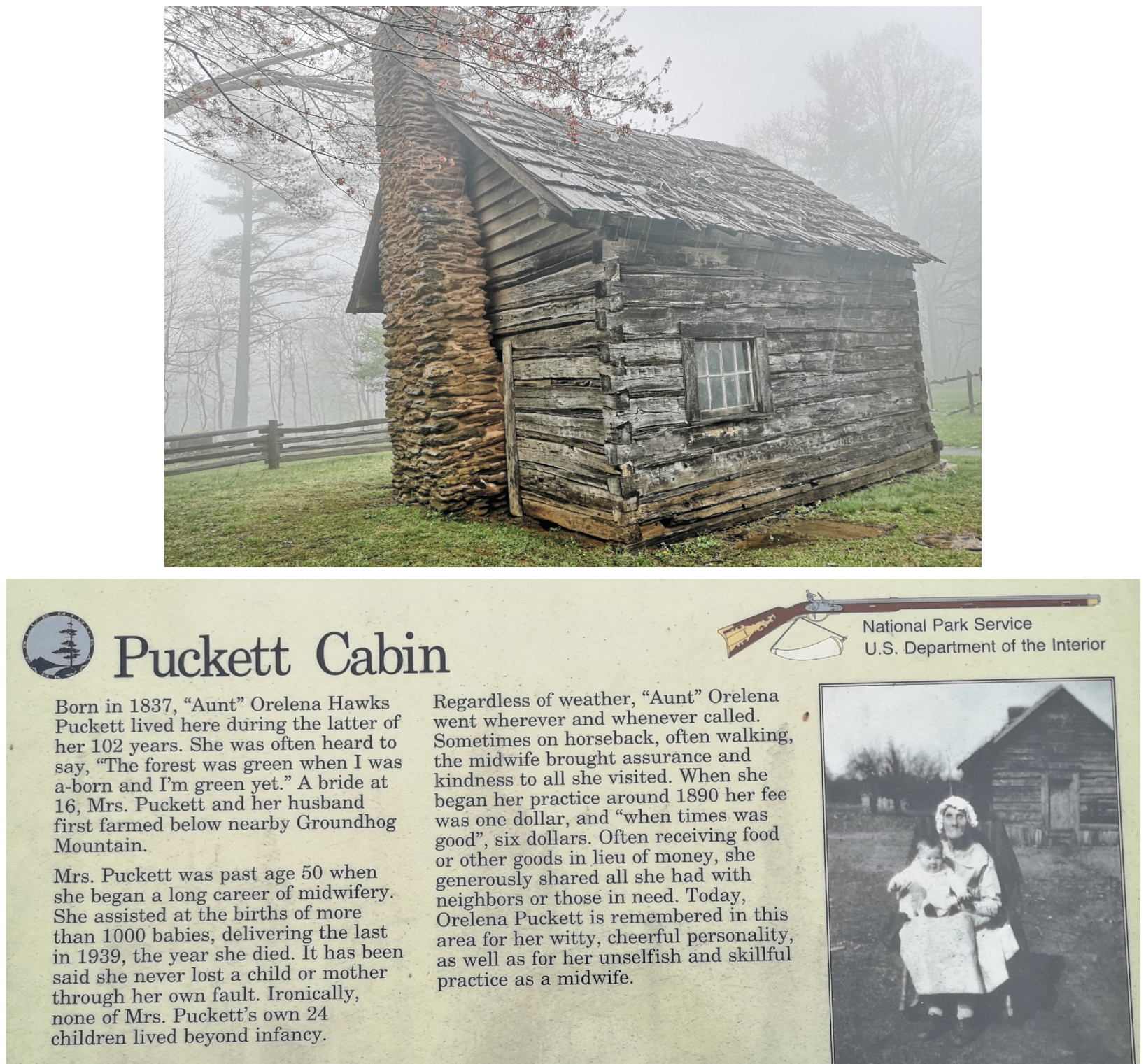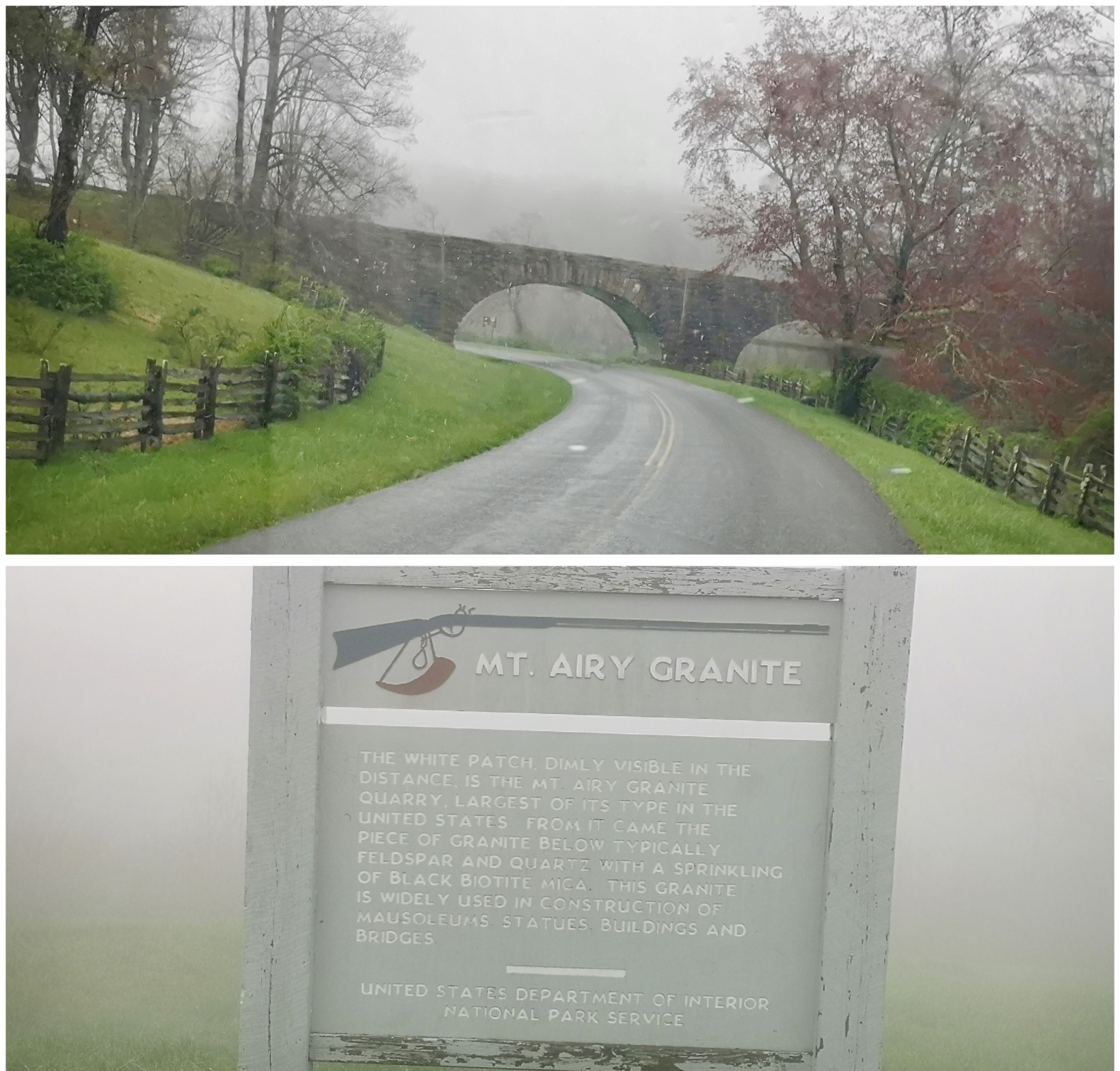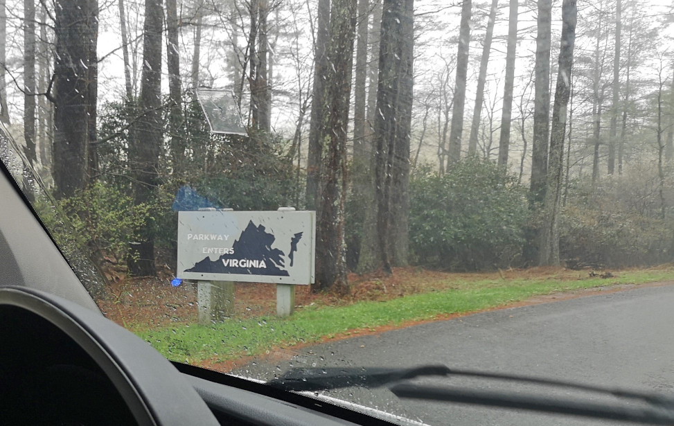 It was pouring buckets the next morning when we left Stone Mountain SP, so we stopped in Sparta NC to get some groceries and to have lunch at the Main Street Pizzeria & Taphouse. I had the Hi-Wire Irish Stout (local craft beer from Ashville NC) and we shared a Veggie Delight pizza for lunch, both were good. After lunch we went back on the Blue Ridge Parkway and the first couple of signs were don’t drive the Parkway in the fog (and of course it was foggy and rainy again) and a sign about this area being where the construction began in 1935. Next, we left North Carolina and entered Virginia (a new state for us) on the Parkway, our destination being Fairy Stone SP. We saw more arched bridges and a sign about the Mt Airy quarry where much of the Granite used in the Parkway construction was sourced. We stopped to see the Puckett cabin where Orlena Puckett had lived in the later part of her 102 years. She was well known in the area as a midwife who delivered over 1000 babies. We carried on in the fog as it wasn’t quite as bad as the other day but eventually exited a bit early to go to Fairy Stone SP. The campsites there were wildly unlevel with heaving asphalt throughout the campground. We learned later that this year they will close the park and redo the whole campground.