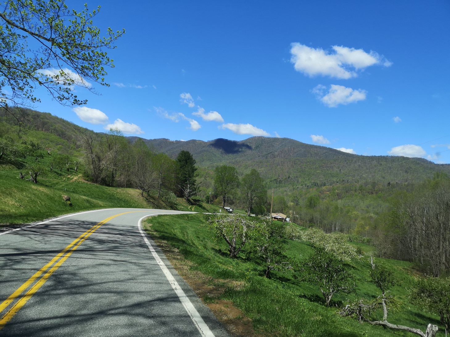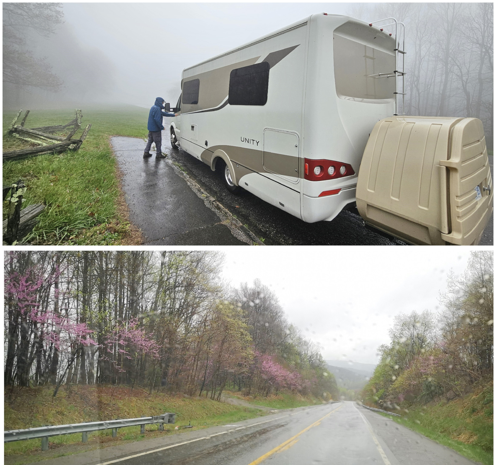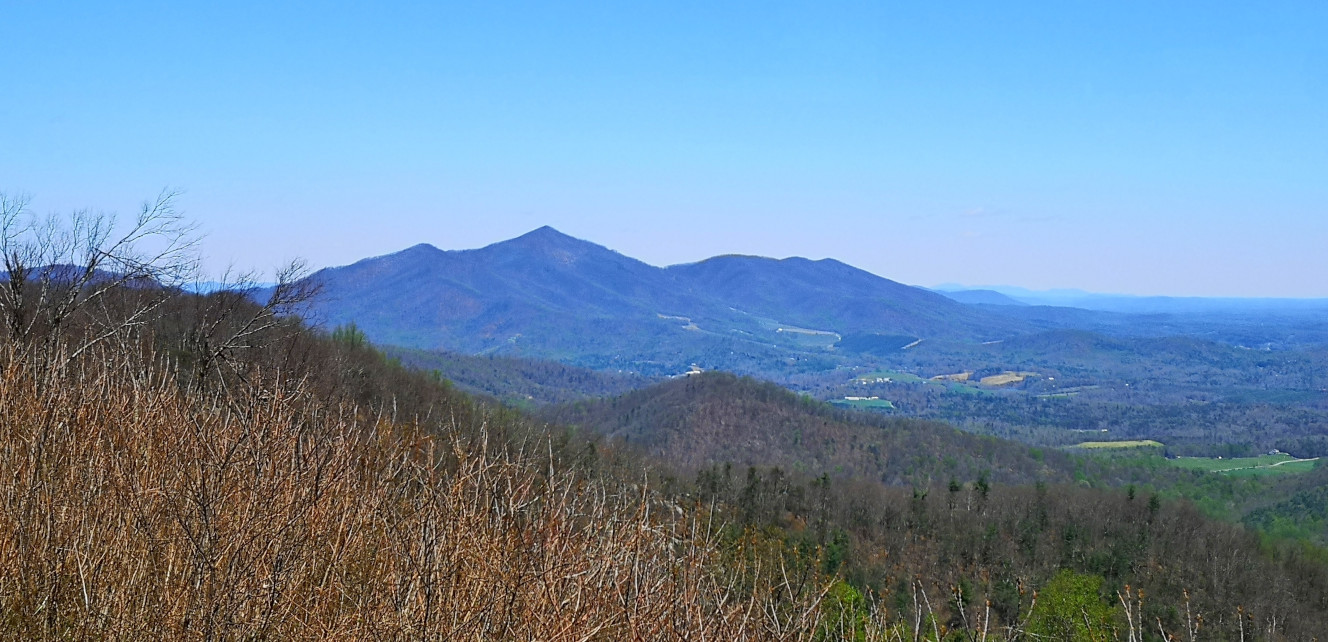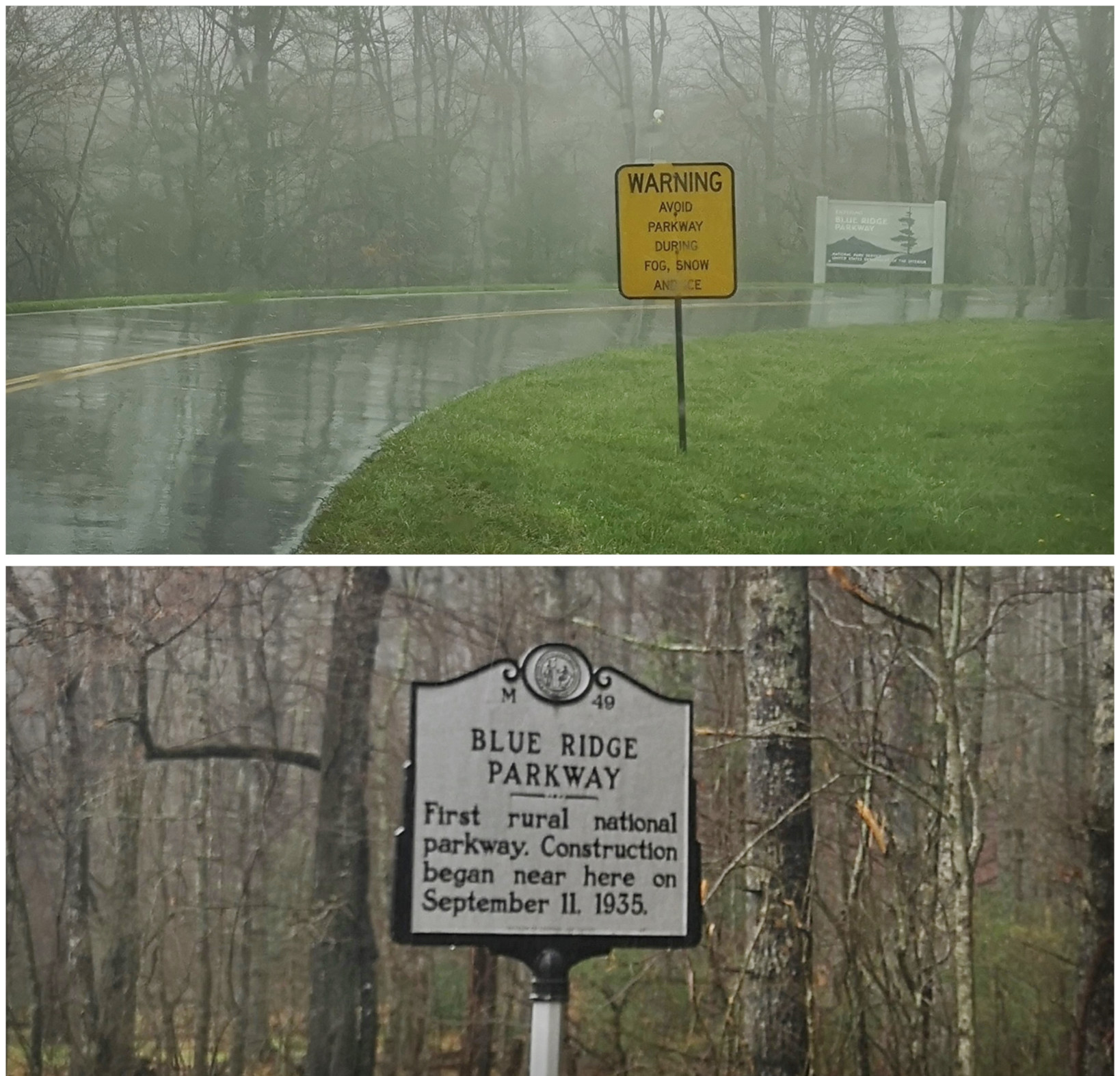 It was pouring buckets the next morning when we left Stone Mountain SP, so we stopped in Sparta NC to get some groceries and to have lunch at the Main Street Pizzeria & Taphouse. I had the Hi-Wire Irish Stout (local craft beer from Ashville NC) and we shared a Veggie Delight pizza for lunch, both were good. After lunch we went back on the Blue Ridge Parkway and the first couple of signs were don’t drive the Parkway in the fog (and of course it was foggy and rainy again) and a sign about this area being where the construction began in 1935. Next, we left North Carolina and entered Virginia (a new state for us) on the Parkway, our destination being Fairy Stone SP. We saw more arched bridges and a sign about the Mt Airy quarry where much of the Granite used in the Parkway construction was sourced. We stopped to see the Puckett cabin where Orlena Puckett had lived in the later part of her 102 years. She was well known in the area as a midwife who delivered over 1000 babies. We carried on in the fog as it wasn’t quite as bad as the other day but eventually exited a bit early to go to Fairy Stone SP. The campsites there were wildly unlevel with heaving asphalt throughout the campground. We learned later that this year they will close the park and redo the whole campground.