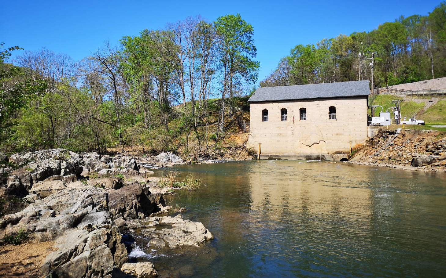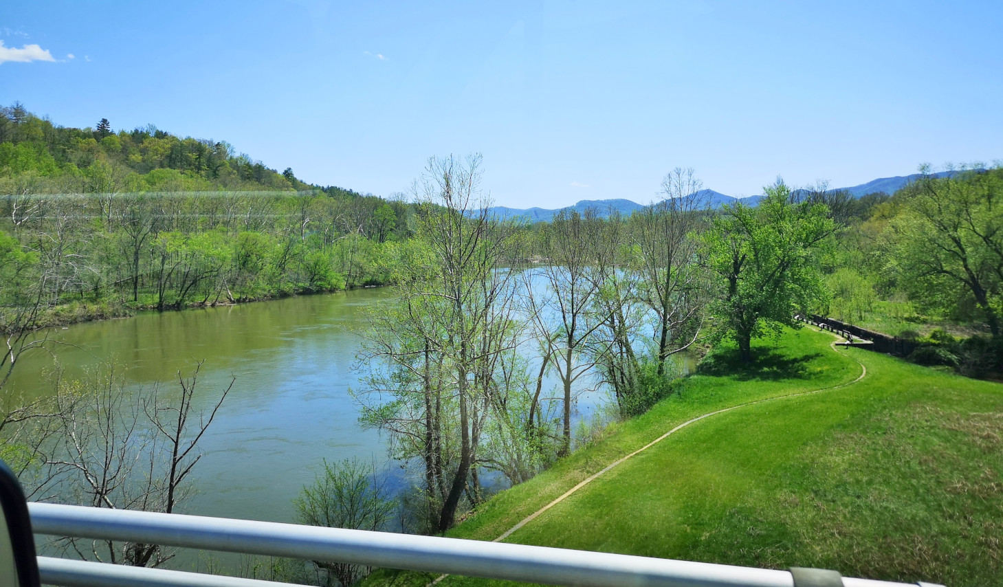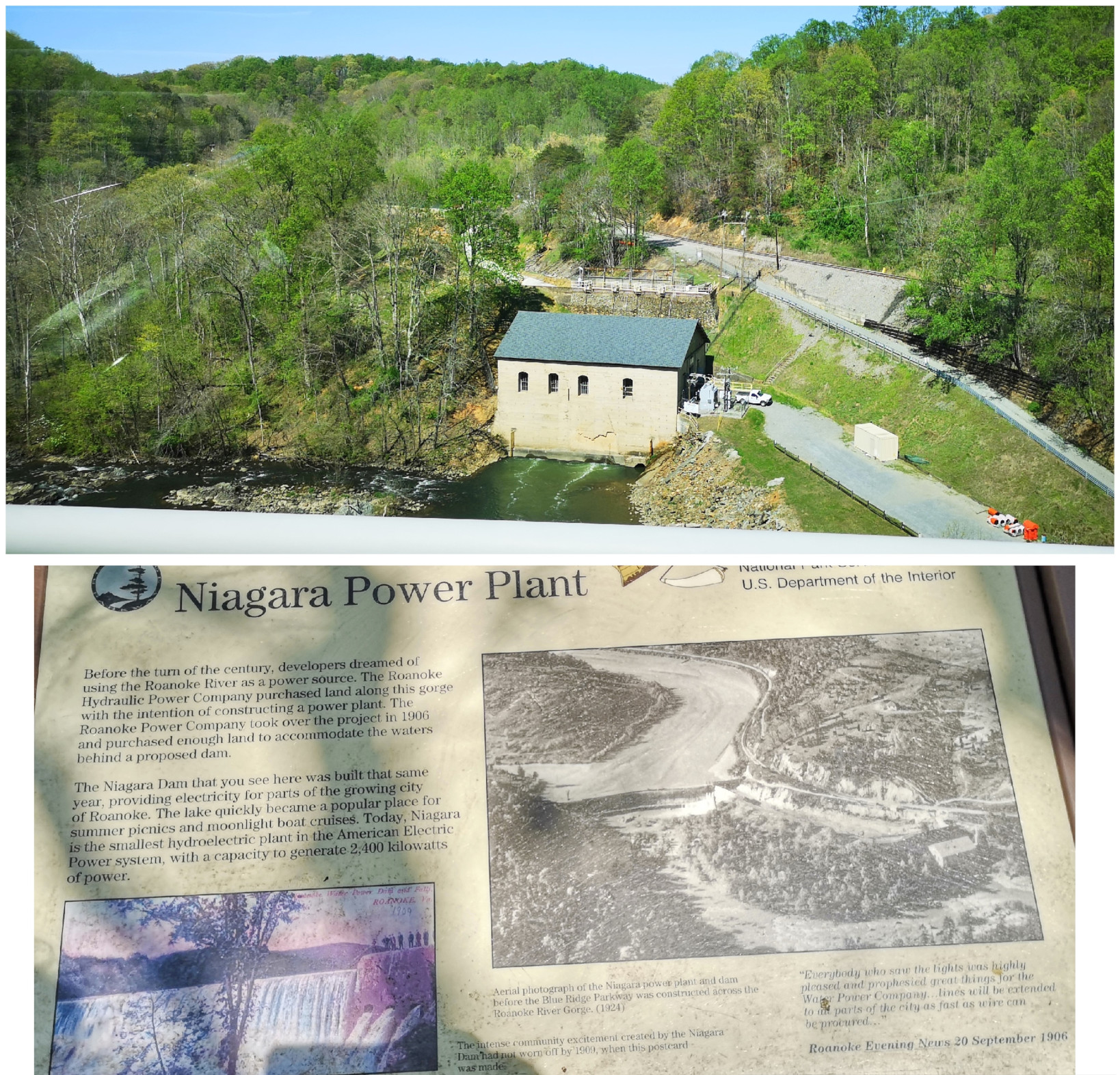 From Smith Mountain Lake SP we returned to the Blue Ridge Parkway and again we did a small back track. When we had passed the Roanoke River Overlook on Saturday, we saw a large waterfall over a dam by the Niagara Power Plant, so we decided to go back and take a look. Unfortunately, there was no water flowing on Monday! It turned out they did an aesthetic flow of water for the weekends so all we got to see was a tiny trickle. However, we did do the loop hike down into the valley to see the large bridge we had crossed and to see the power plant built in 1906 from the river level.