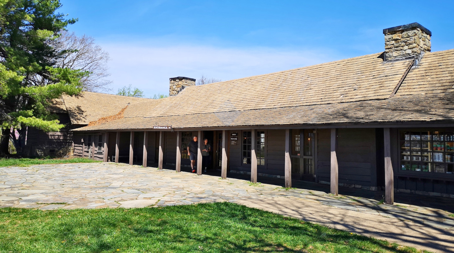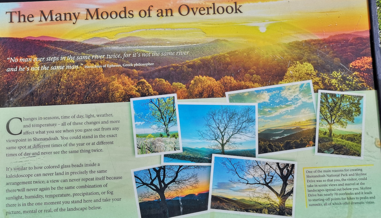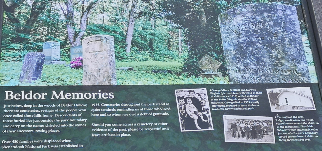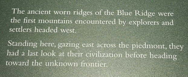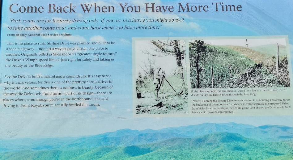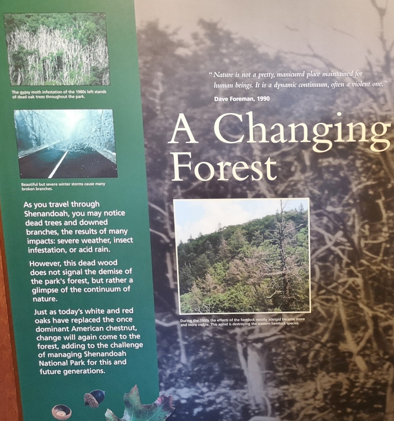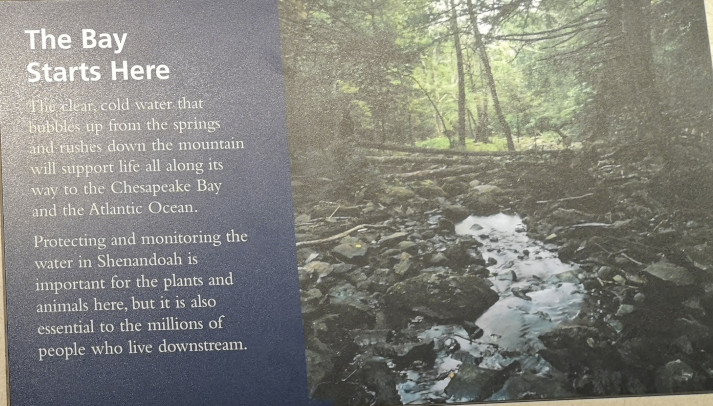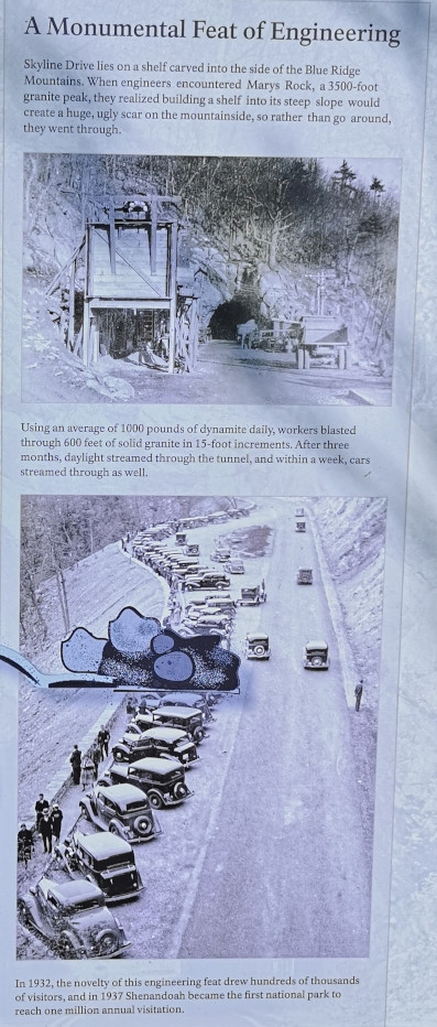 The next morning, we stopped at the Big Meadows visitor centre but unfortunately it was closed on Tuesday’s so we could only get the usual photo with Sharon by the hunky CCC statue😉 Then our drive continued on Skyline Drive with overlooks where we learned about the original wooden and stone guard rails that the CCC built and how they have done work to restore them to look as they did in the beginning. Next up was Marys Rock tunnel which we had been warned about as the height was 12’8” and our RV is 10’6”. In 1932 they used an average of 1000 lbs of dynamite daily to get through the 600’ section of granite. We did see lots of bicycle groups on Skyline Drive doing very fast speeds on the downhills and working hard on the uphill climbs. The very last overlook we visited had some gorgeous flowering trees along it. We then descended to the Dickey Ridge Visitor Centre where we stopped for lunch and looked at the displays and watched a movie about Skyline Drive. One interesting display board talked about how the water from the Shenandoah National Forest in turn flowed all the way downstream to Chesapeake Bay where our trip had begun 4.5 months before.