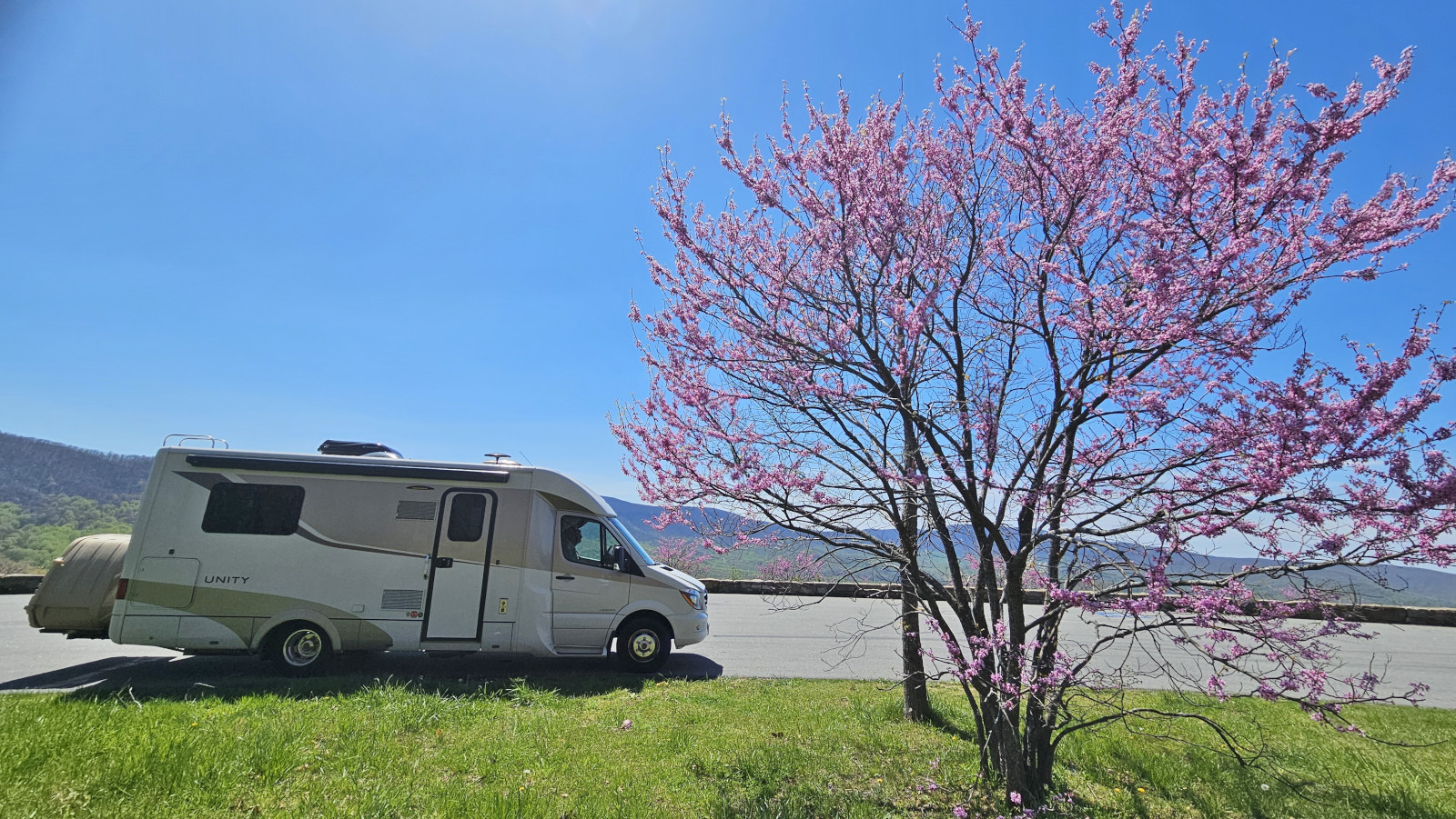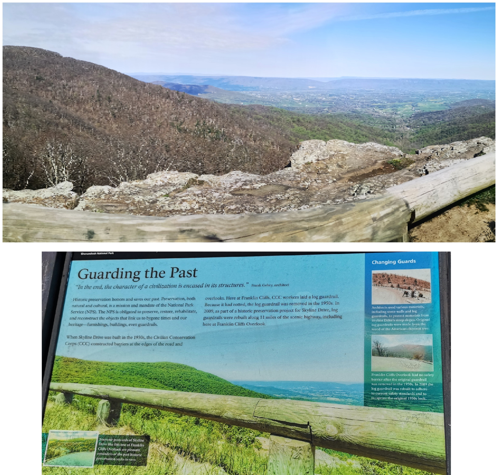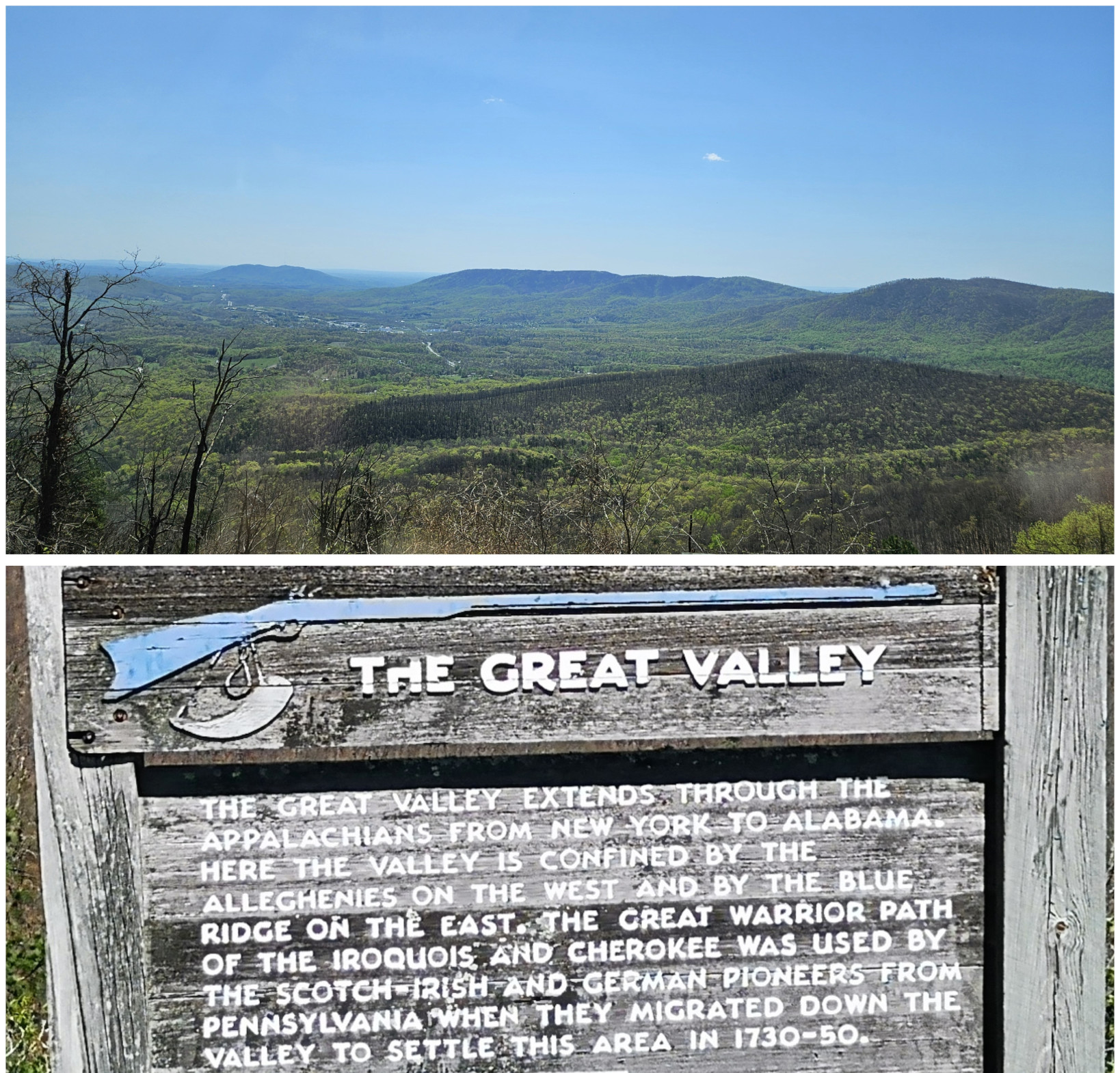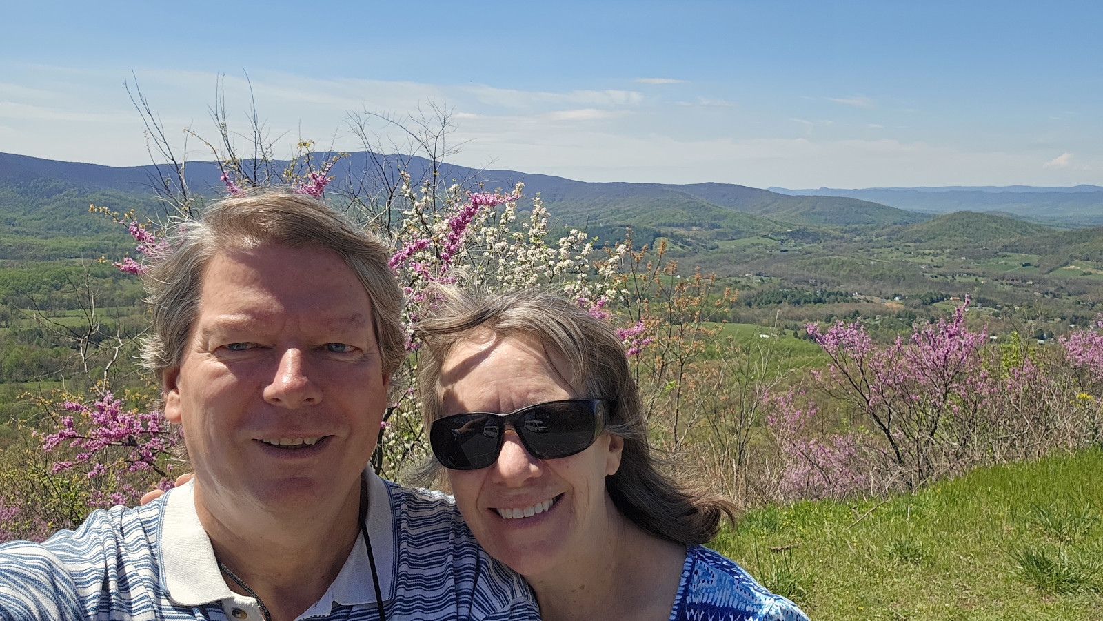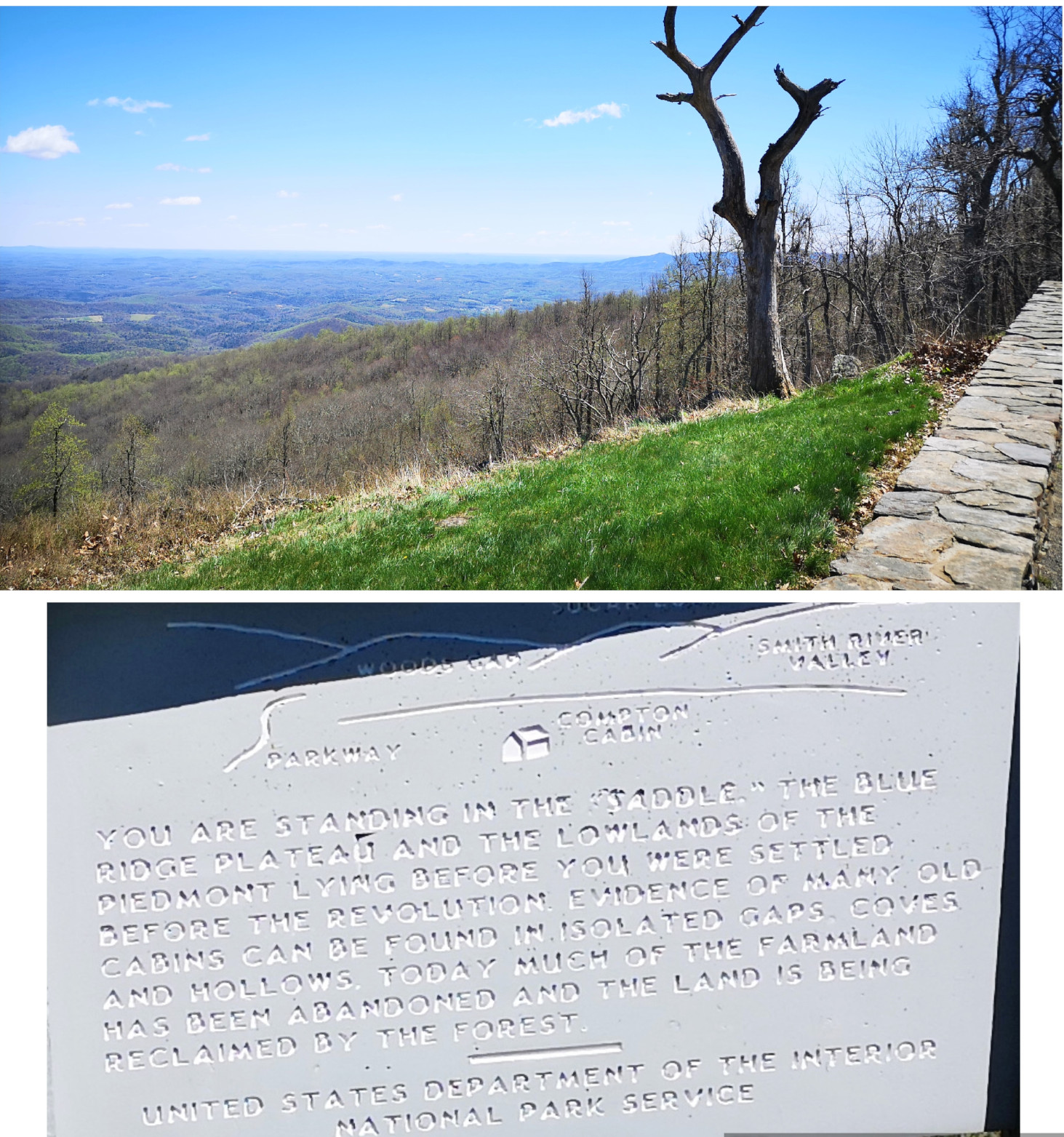 The next morning, we stopped at the Big Meadows visitor centre but unfortunately it was closed on Tuesday’s so we could only get the usual photo with Sharon by the hunky CCC statue😉 Then our drive continued on Skyline Drive with overlooks where we learned about the original wooden and stone guard rails that the CCC built and how they have done work to restore them to look as they did in the beginning. Next up was Marys Rock tunnel which we had been warned about as the height was 12’8” and our RV is 10’6”. In 1932 they used an average of 1000 lbs of dynamite daily to get through the 600’ section of granite. We did see lots of bicycle groups on Skyline Drive doing very fast speeds on the downhills and working hard on the uphill climbs. The very last overlook we visited had some gorgeous flowering trees along it. We then descended to the Dickey Ridge Visitor Centre where we stopped for lunch and looked at the displays and watched a movie about Skyline Drive. One interesting display board talked about how the water from the Shenandoah National Forest in turn flowed all the way downstream to Chesapeake Bay where our trip had begun 4.5 months before.