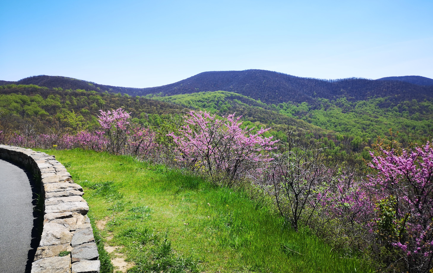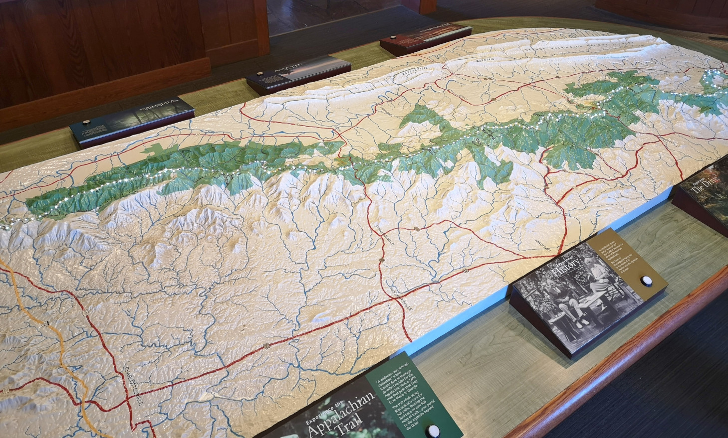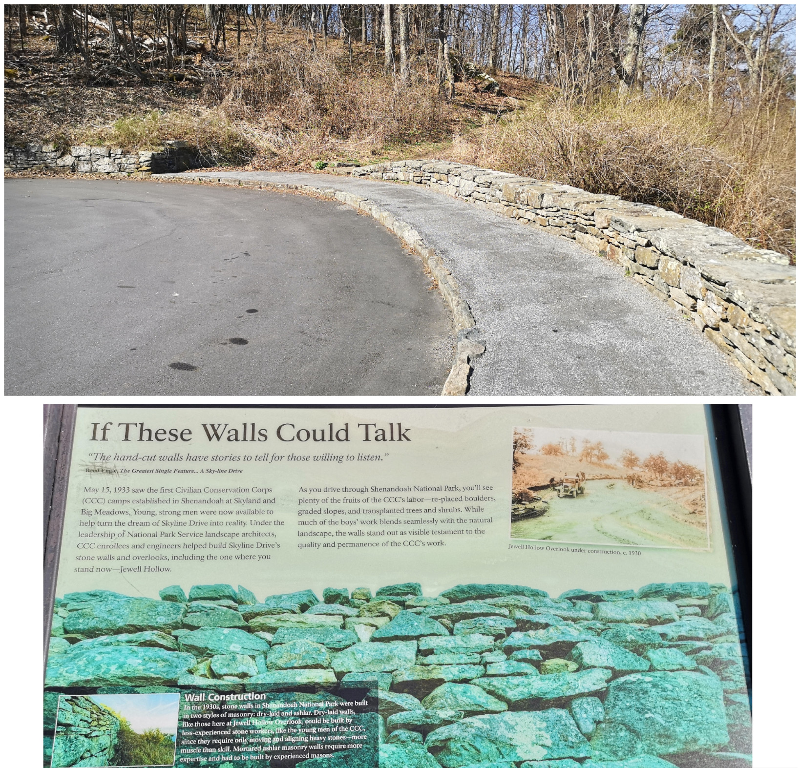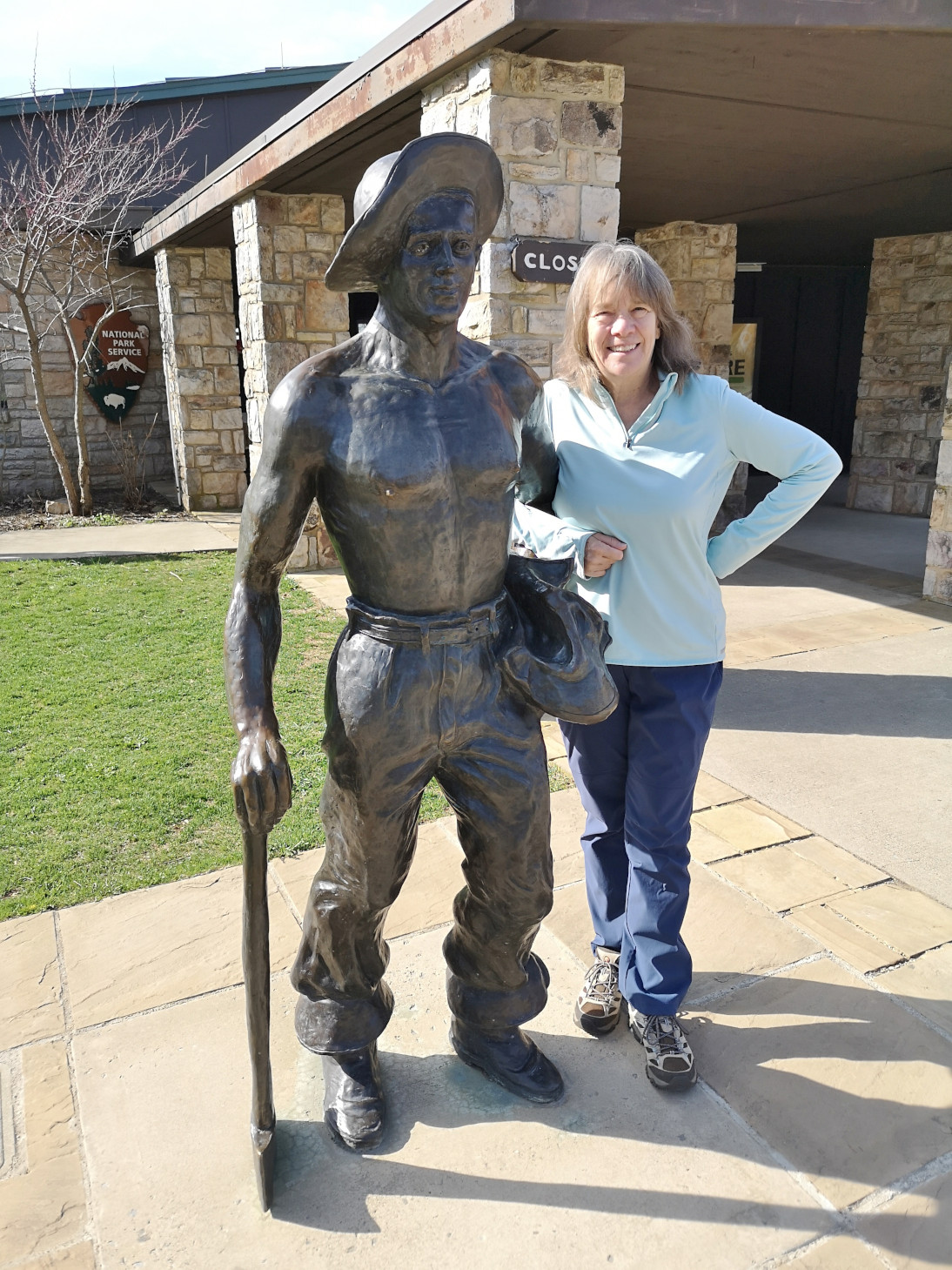 The next morning, we stopped at the Big Meadows visitor centre but unfortunately it was closed on Tuesday’s so we could only get the usual photo with Sharon by the hunky CCC statue😉 Then our drive continued on Skyline Drive with overlooks where we learned about the original wooden and stone guard rails that the CCC built and how they have done work to restore them to look as they did in the beginning. Next up was Marys Rock tunnel which we had been warned about as the height was 12’8” and our RV is 10’6”. In 1932 they used an average of 1000 lbs of dynamite daily to get through the 600’ section of granite. We did see lots of bicycle groups on Skyline Drive doing very fast speeds on the downhills and working hard on the uphill climbs. The very last overlook we visited had some gorgeous flowering trees along it. We then descended to the Dickey Ridge Visitor Centre where we stopped for lunch and looked at the displays and watched a movie about Skyline Drive. One interesting display board talked about how the water from the Shenandoah National Forest in turn flowed all the way downstream to Chesapeake Bay where our trip had begun 4.5 months before.
