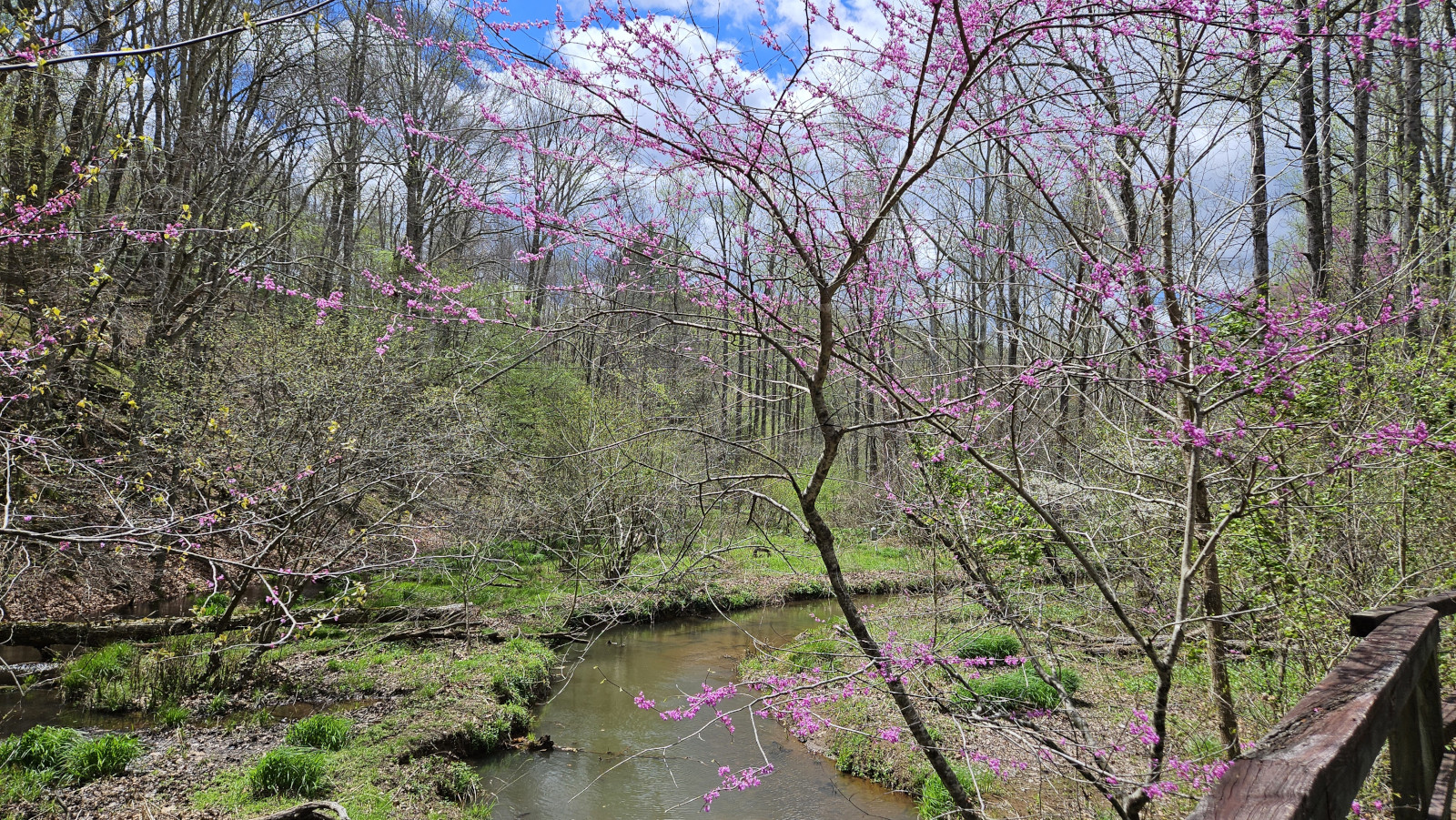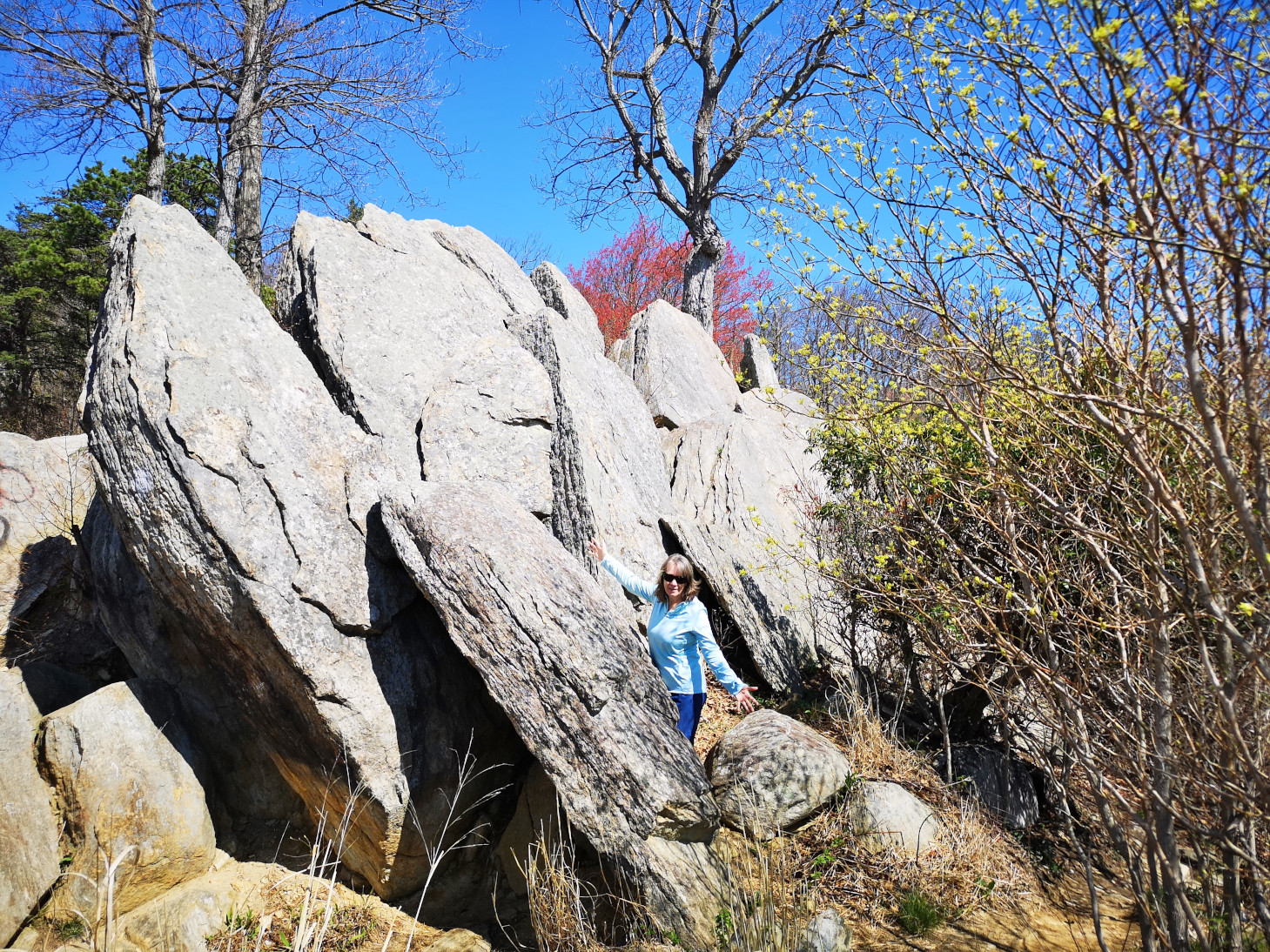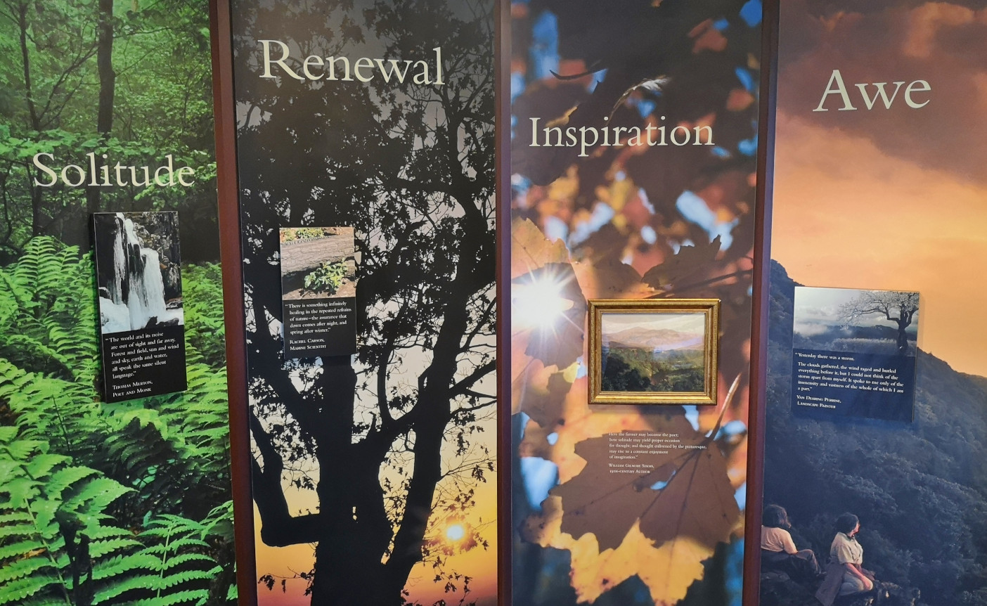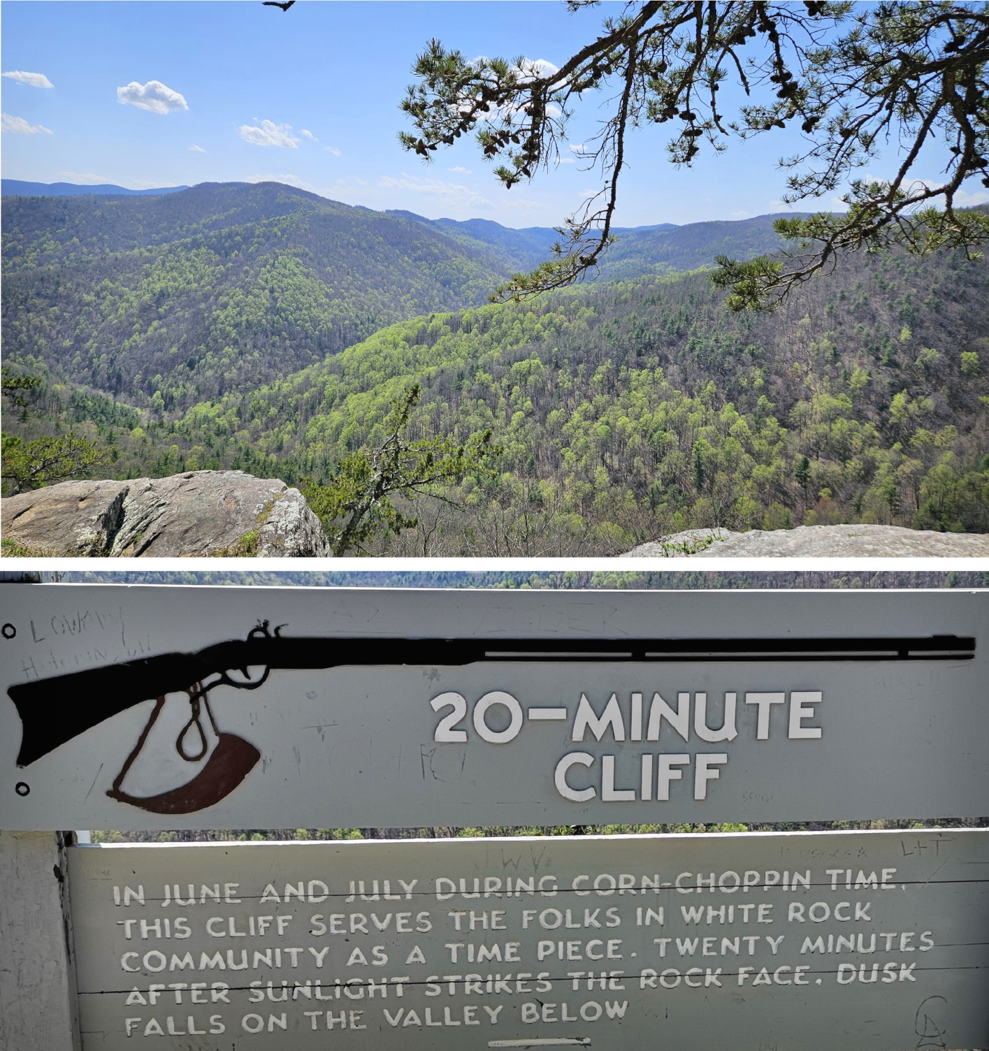 The next morning, we stopped at the Big Meadows visitor centre but unfortunately it was closed on Tuesday’s so we could only get the usual photo with Sharon by the hunky CCC statue😉 Then our drive continued on Skyline Drive with overlooks where we learned about the original wooden and stone guard rails that the CCC built and how they have done work to restore them to look as they did in the beginning. Next up was Marys Rock tunnel which we had been warned about as the height was 12’8” and our RV is 10’6”. In 1932 they used an average of 1000 lbs of dynamite daily to get through the 600’ section of granite. We did see lots of bicycle groups on Skyline Drive doing very fast speeds on the downhills and working hard on the uphill climbs. The very last overlook we visited had some gorgeous flowering trees along it. We then descended to the Dickey Ridge Visitor Centre where we stopped for lunch and looked at the displays and watched a movie about Skyline Drive. One interesting display board talked about how the water from the Shenandoah National Forest in turn flowed all the way downstream to Chesapeake Bay where our trip had begun 4.5 months before.