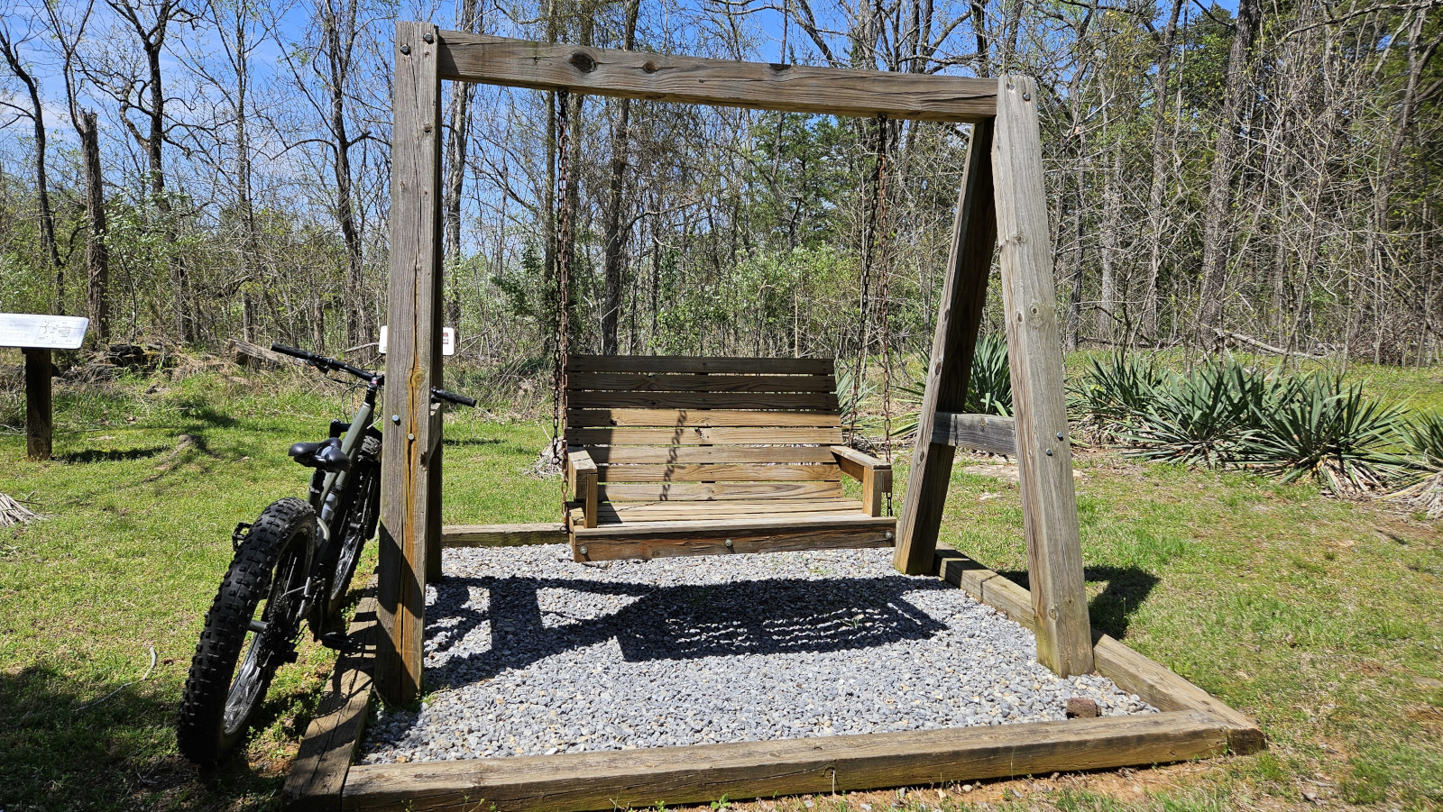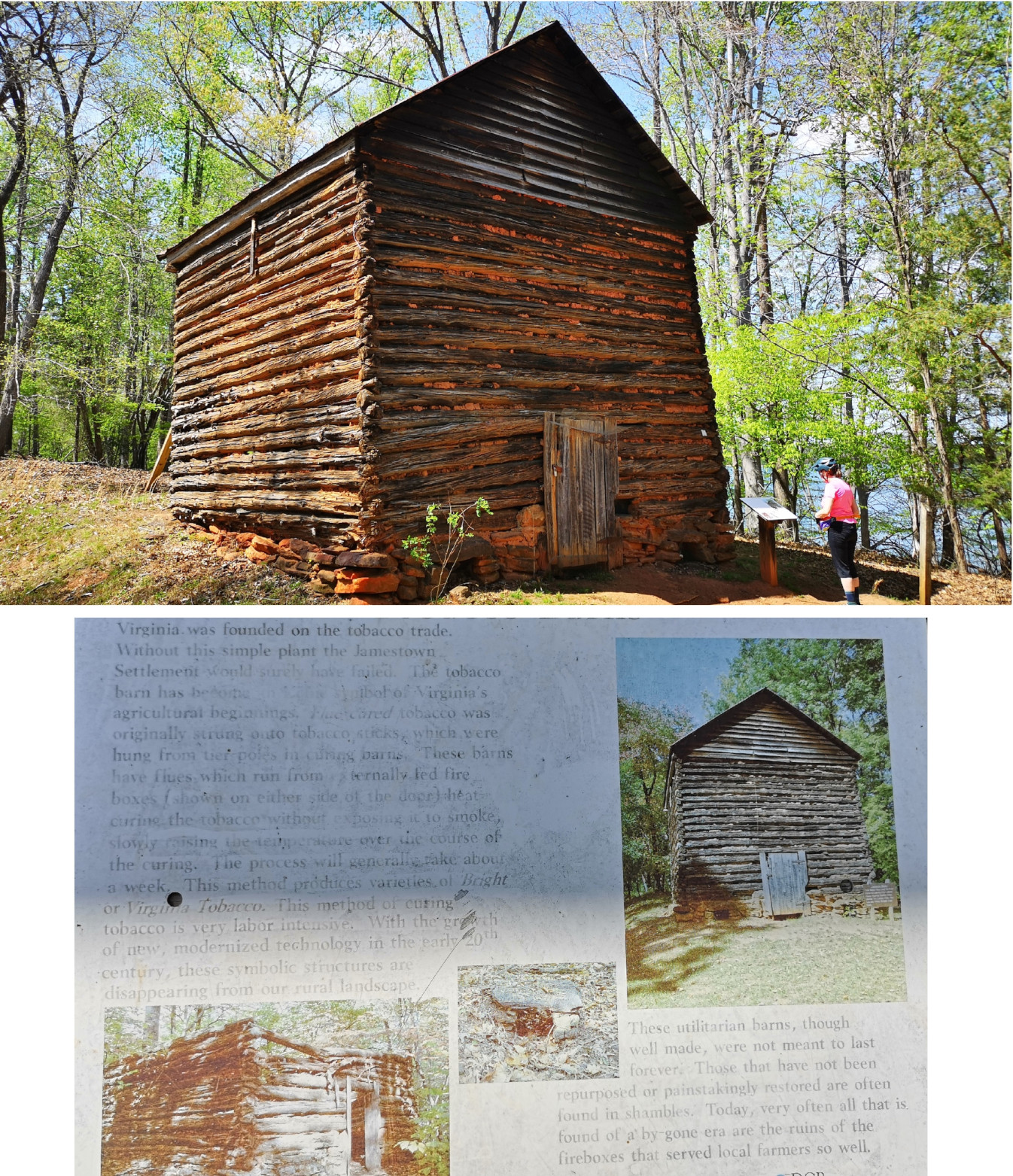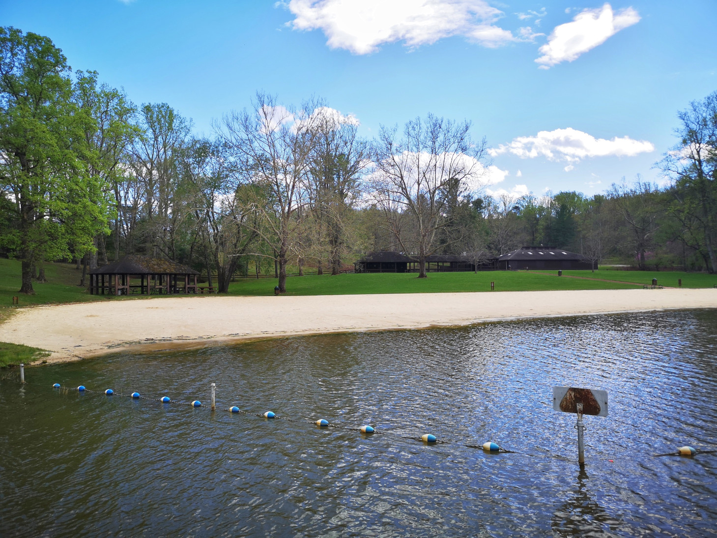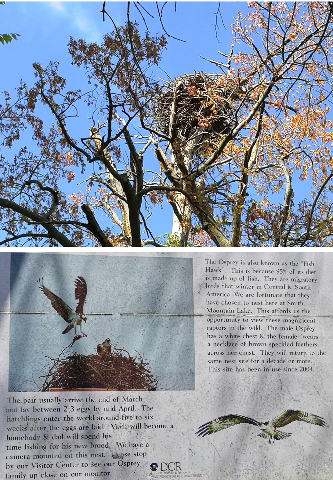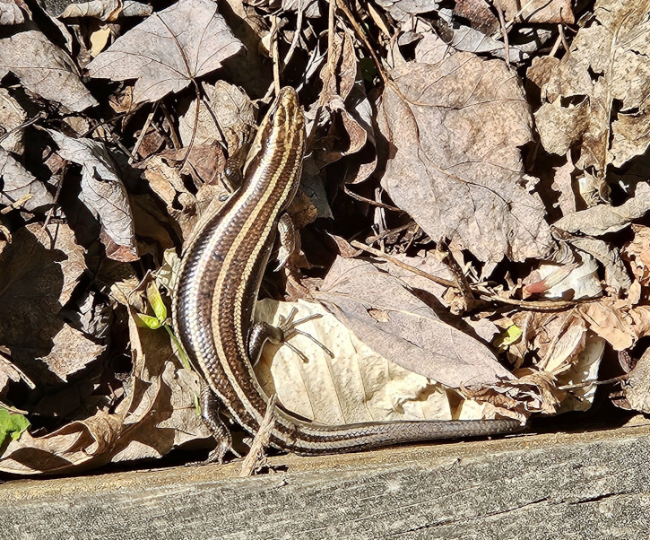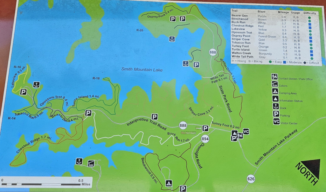 Smith Mountain Lake SP is 1148 acres and just opened in 1983. The campsites were large and since we arrived on a Saturday the campground was full for the weekend. As we enjoyed the sunshine at our campsite, we saw a 5-lined skink crawling along the campsite retaining wall. After we looked at the trail map, we decided we wanted to stay for 2 nights but it meant that we had to move sites for Sunday night since the site we had was already booked. On Sunday the weather was nice so we thought we would do the trails on our Mountain Bikes. We took the Beechwood trail and connected to Buck Run but Sharon was already finding the elevation changes and roots difficult so when we reached the Interpretative Trail road she decided she would carry on with the road while I tackled the Striper Cove trail which was listed as difficult. The trail went out to the point of 3 different peninsulas overlooking Smith Mountain Lake and it was downhill getting to the points and uphill leaving each point, so it was challenging. We were surprised how much boat traffic there was on the lake, but it was a sunny Sunday. Sharon and I met back up by the now toppled termite mound and then decided to do the Turtle Island trail as it was listed as moderate. We took a couple of other trails until we reached the tobacco barn, the dock, and then the nature centre before returning along the road. Our total was 13.5 kms so we enjoyed some drinks once we returned. A great park for recreational activities.