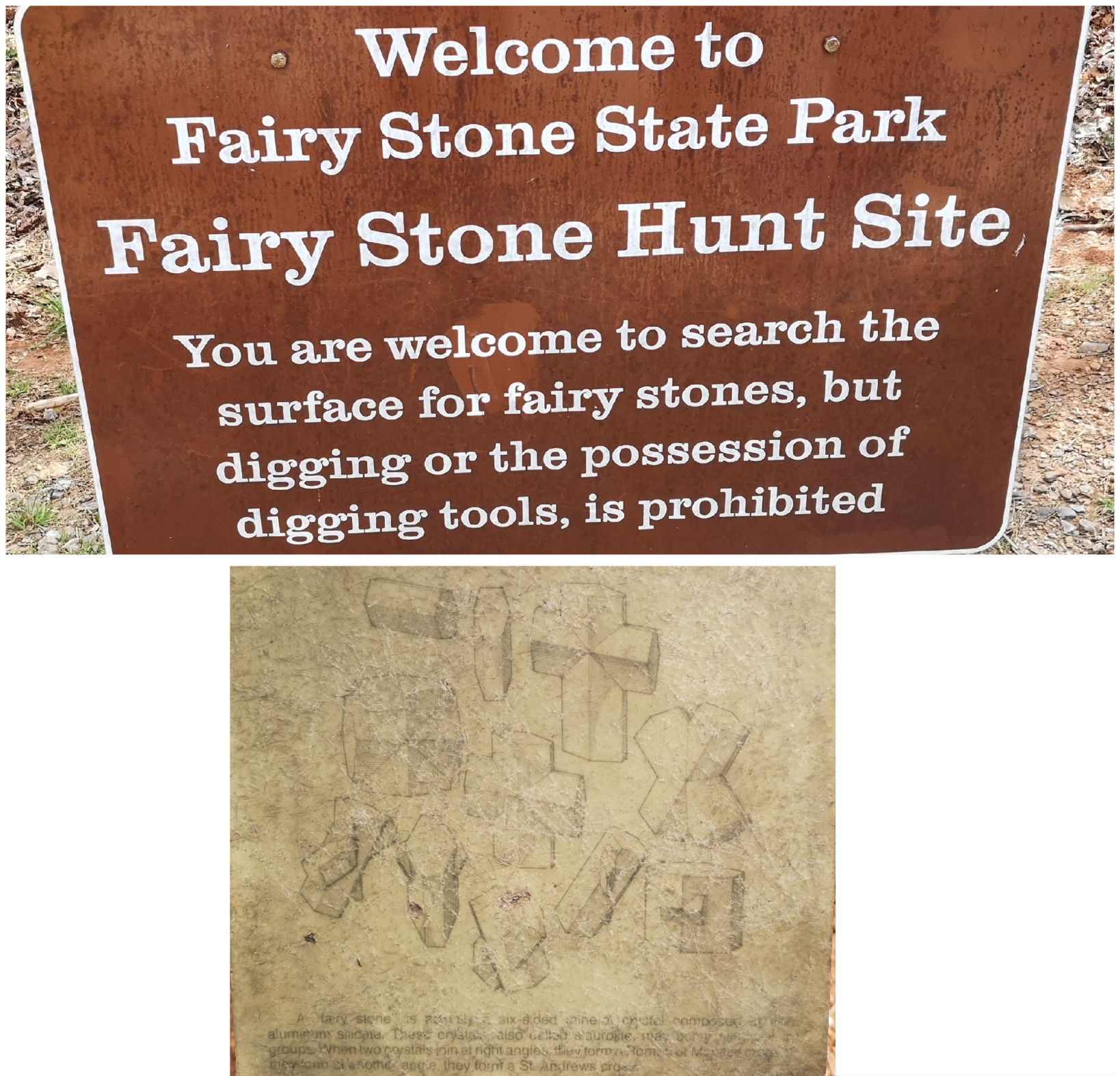 The place where you hunt for Fairy Stones was not actually where the campground and CCC buildings were located, it was east along the highway. Therefore, we decided the next day when we were leaving, we would go and hunt for some stones. The ranger had explained how to find them and told us to go further up the valley to have a higher chance of finding some. Due to the rain a couple of days before more were exposed so we were lucky enough to find at least one of each of the shapes in our 1 hour of sifting through the surface rocks!