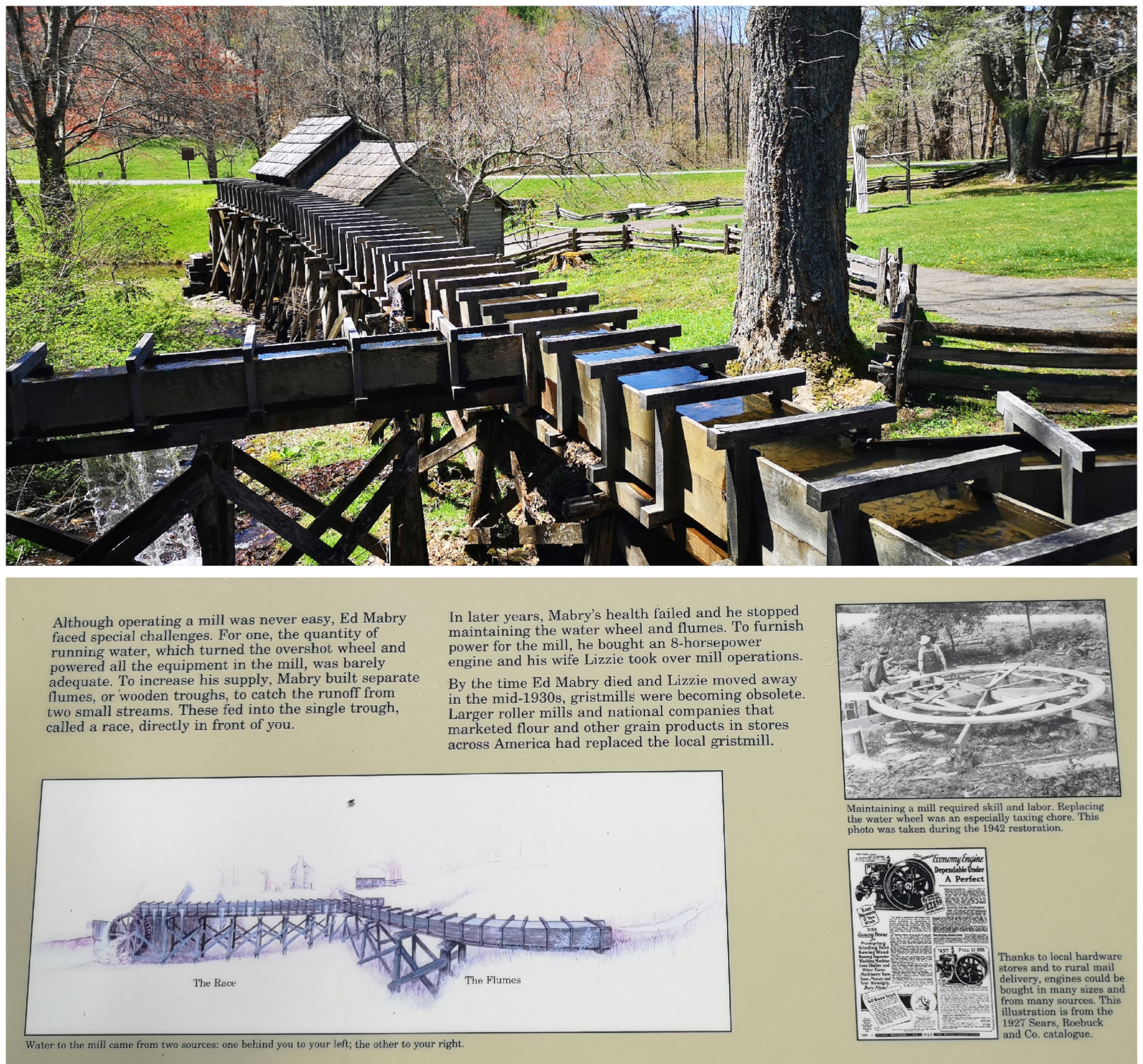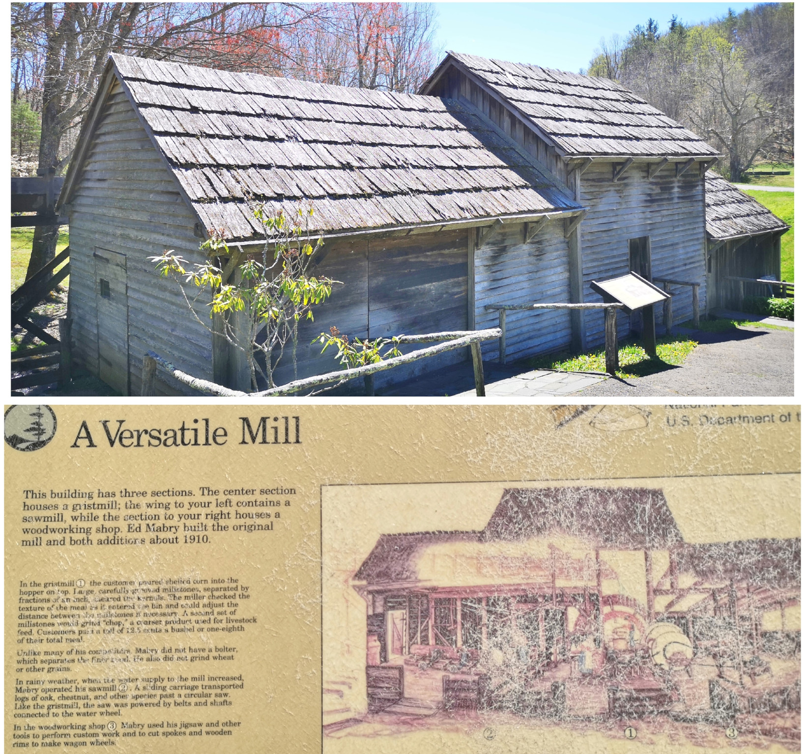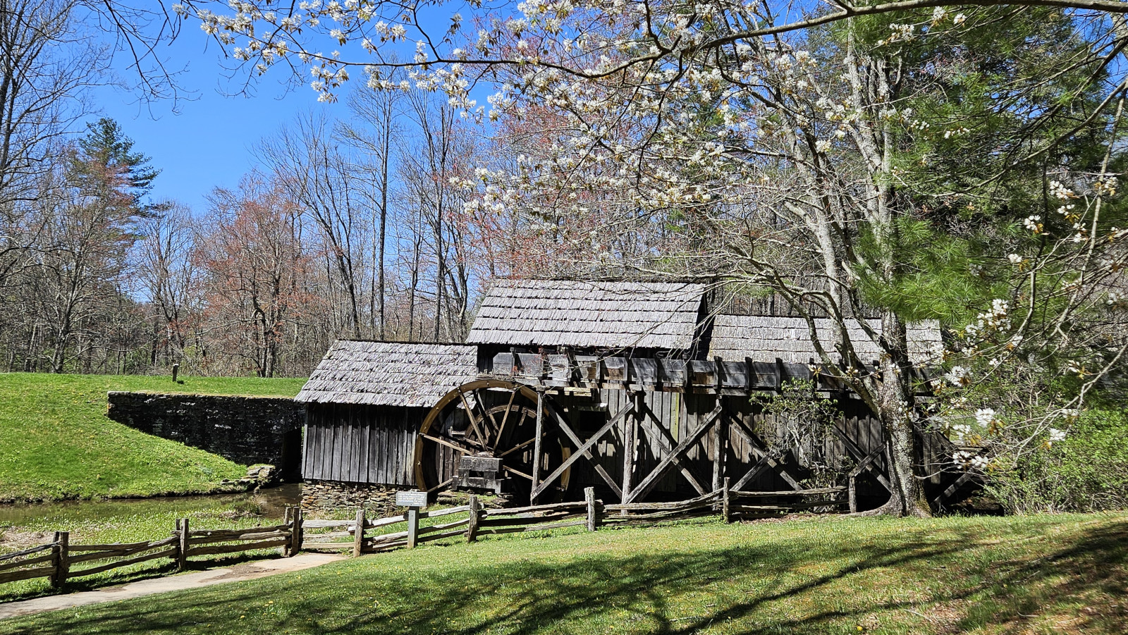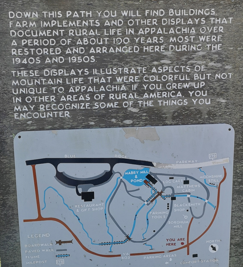 We were returning to carry on our drive along the Blue Ridge Parkway and Sharon found a back road we thought we would try to climb back to the top of the ridge. Just after we turned on the road, we saw a nice covered bridge called Jack’s Creek covered bridge, built in 1914. However, as we carried on, we saw a sign that said this road was only for locals, so we turned around and took a more major road. The major road still had lots of switchbacks to climb the mountain but at least it was all paved. When we reached the Parkway, we decided to do a bit of a back track south so we could see Mabry Mill as it was listed as one of the most photographed locations along the Parkway. We were happy we went on a nice sunny day instead of in the pouring rain and fog. Mabry Mill had several different buildings and displays to show rural Appalachia Mountain life. We saw sorghum making (molasses), whiskey distilling, a bark mill used to tan hides, an 1869 Appalachian log cabin, a 3 section mill that had a sawmill, a grist mill, and a woodworking shop, and the flumes used to direct water from multiple creeks to the overshot wheel at the mill.