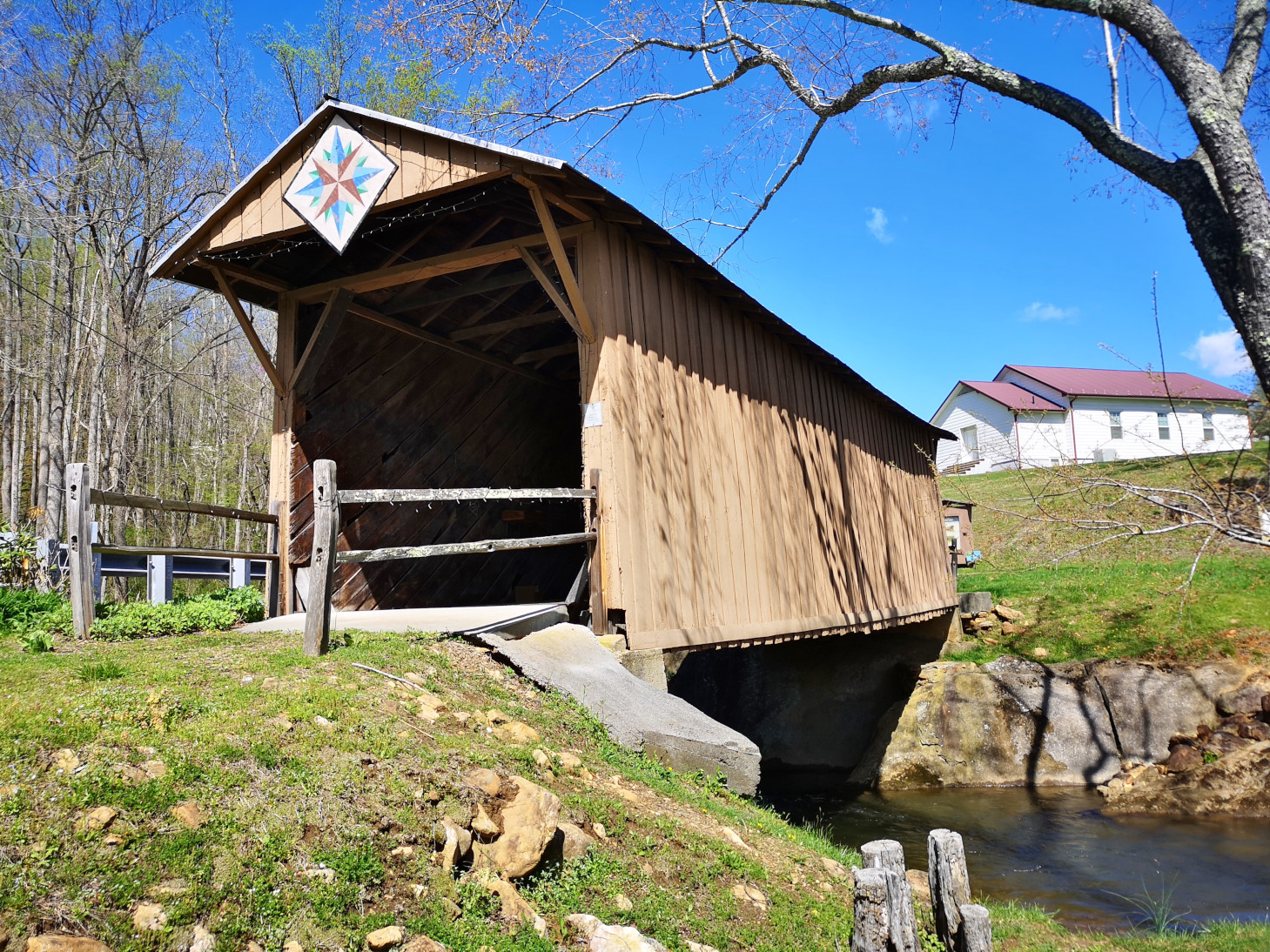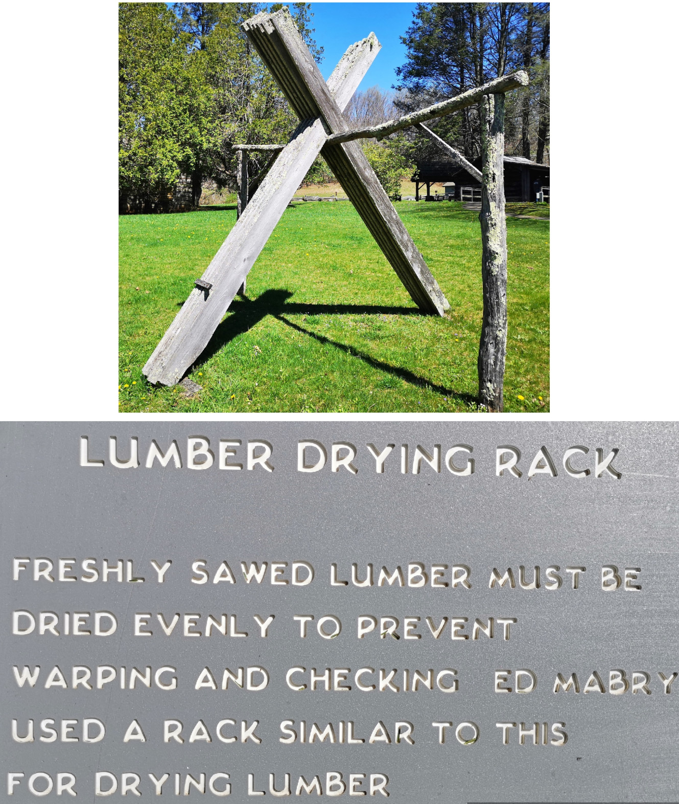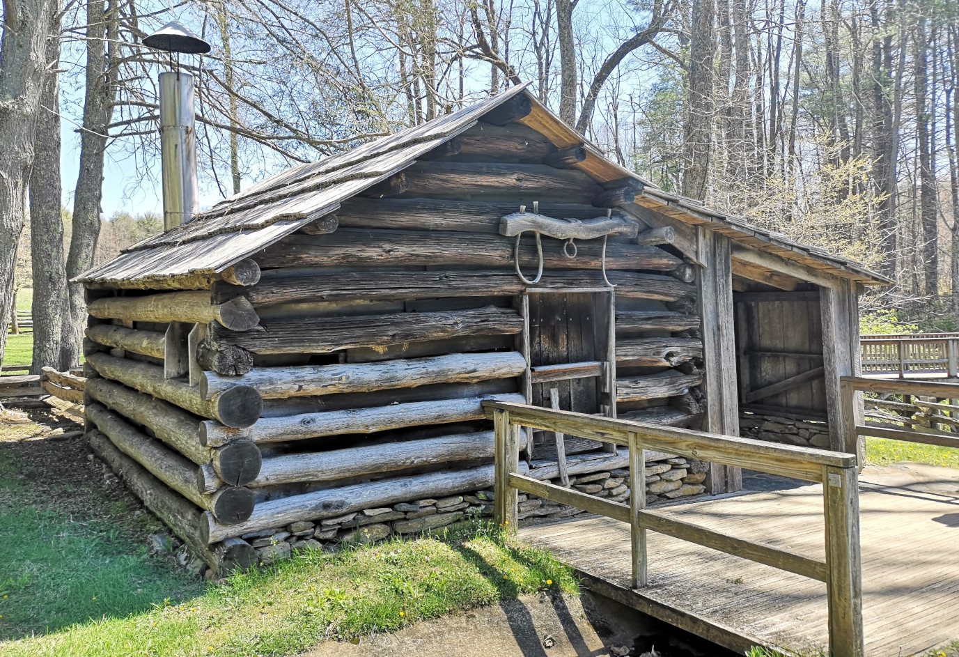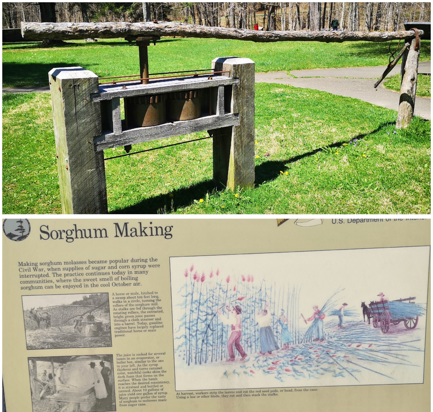 We were returning to carry on our drive along the Blue Ridge Parkway and Sharon found a back road we thought we would try to climb back to the top of the ridge. Just after we turned on the road, we saw a nice covered bridge called Jack’s Creek covered bridge, built in 1914. However, as we carried on, we saw a sign that said this road was only for locals, so we turned around and took a more major road. The major road still had lots of switchbacks to climb the mountain but at least it was all paved. When we reached the Parkway, we decided to do a bit of a back track south so we could see Mabry Mill as it was listed as one of the most photographed locations along the Parkway. We were happy we went on a nice sunny day instead of in the pouring rain and fog. Mabry Mill had several different buildings and displays to show rural Appalachia Mountain life. We saw sorghum making (molasses), whiskey distilling, a bark mill used to tan hides, an 1869 Appalachian log cabin, a 3 section mill that had a sawmill, a grist mill, and a woodworking shop, and the flumes used to direct water from multiple creeks to the overshot wheel at the mill.