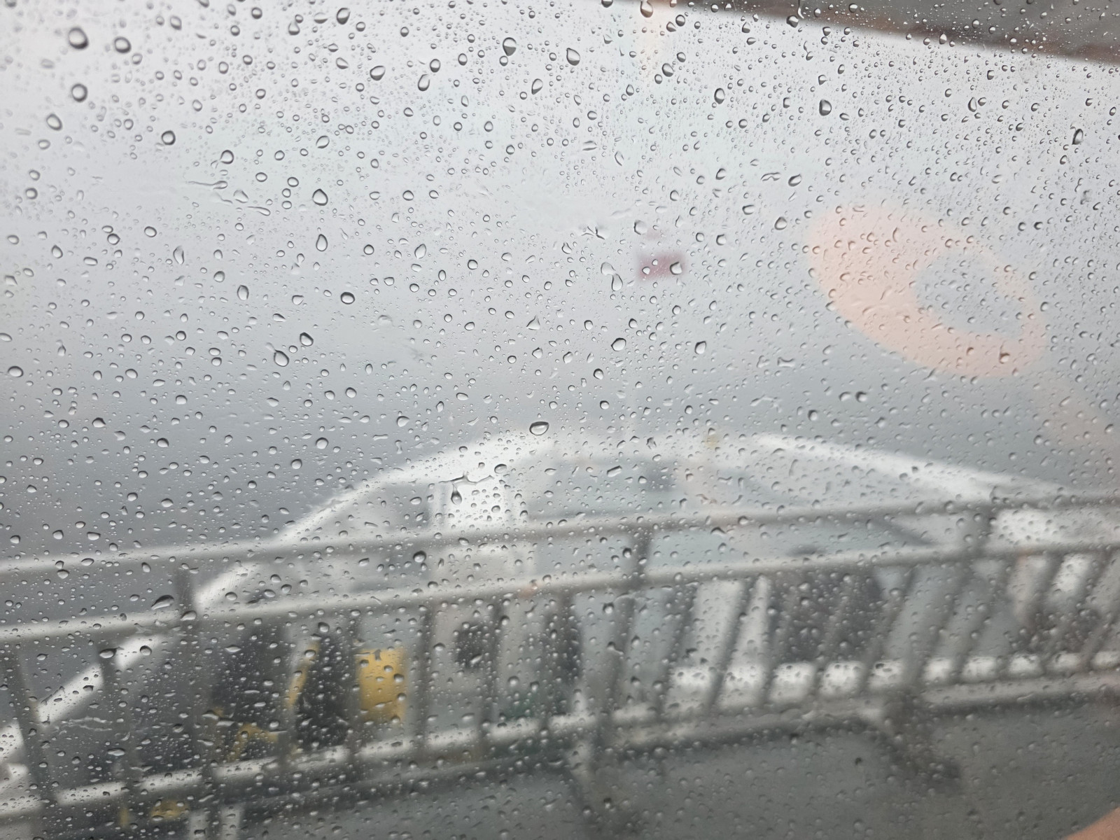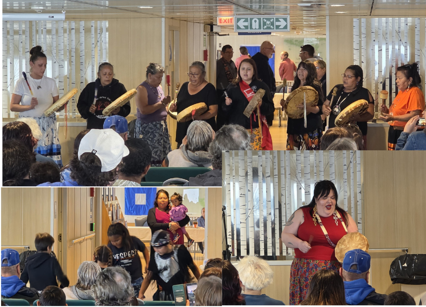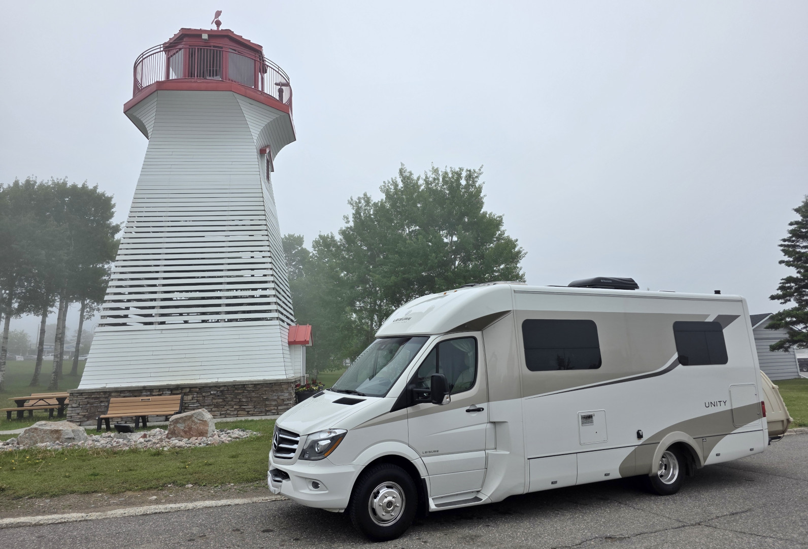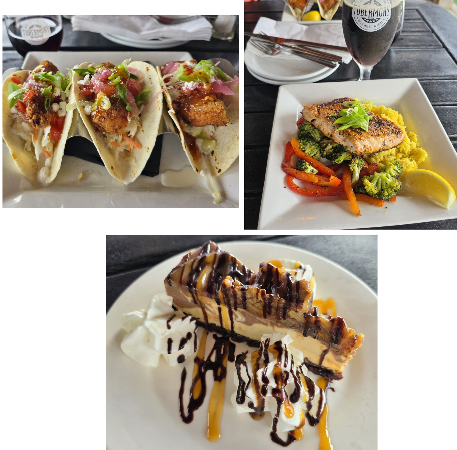 On day one we travelled from our home to Tobermory so we could take the ferry across to Manitoulin Island. We arrived early in Tobermory so we could park in the ferry lanes and go to the Tobermory Brewing company for an early lunch. I had the Blackened Salmon with a Porter beer, Sharon had the Fish Tacos, and we shared the Turtle Cheesecake for dessert. After lunch we just got back to the RV at 12:30 when it absolutely poured rain. Unfortunately, this also meant the first part of the ferry crossing (which is the most scenic) was foggy, rainy, and wavy. However, it was National Indigenous Peoples Day, and they had arranged to have drummers, singers, and dancers on board to do a show in the forward lounge, so we enjoyed that to pass the time.
