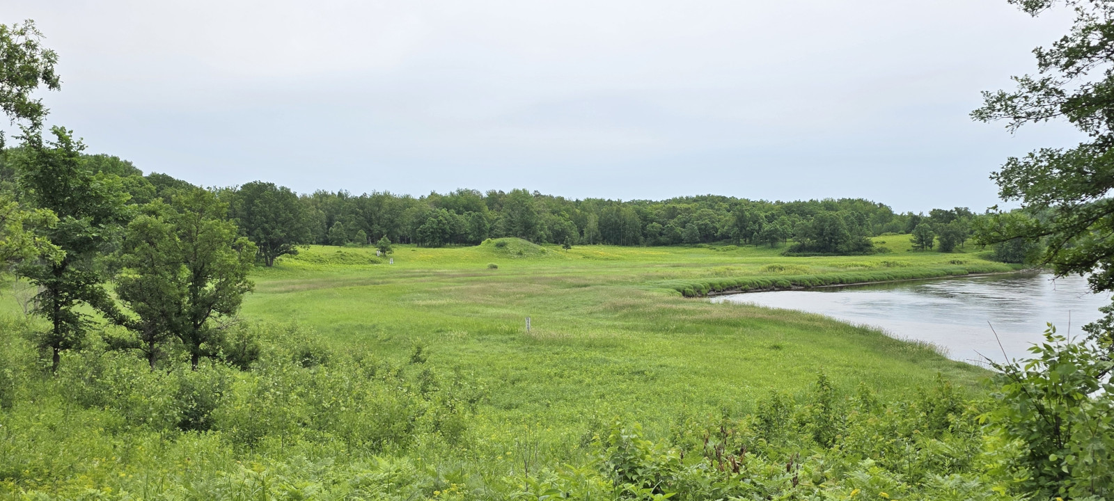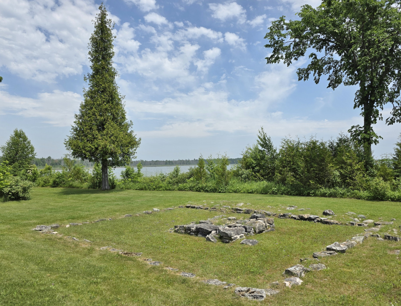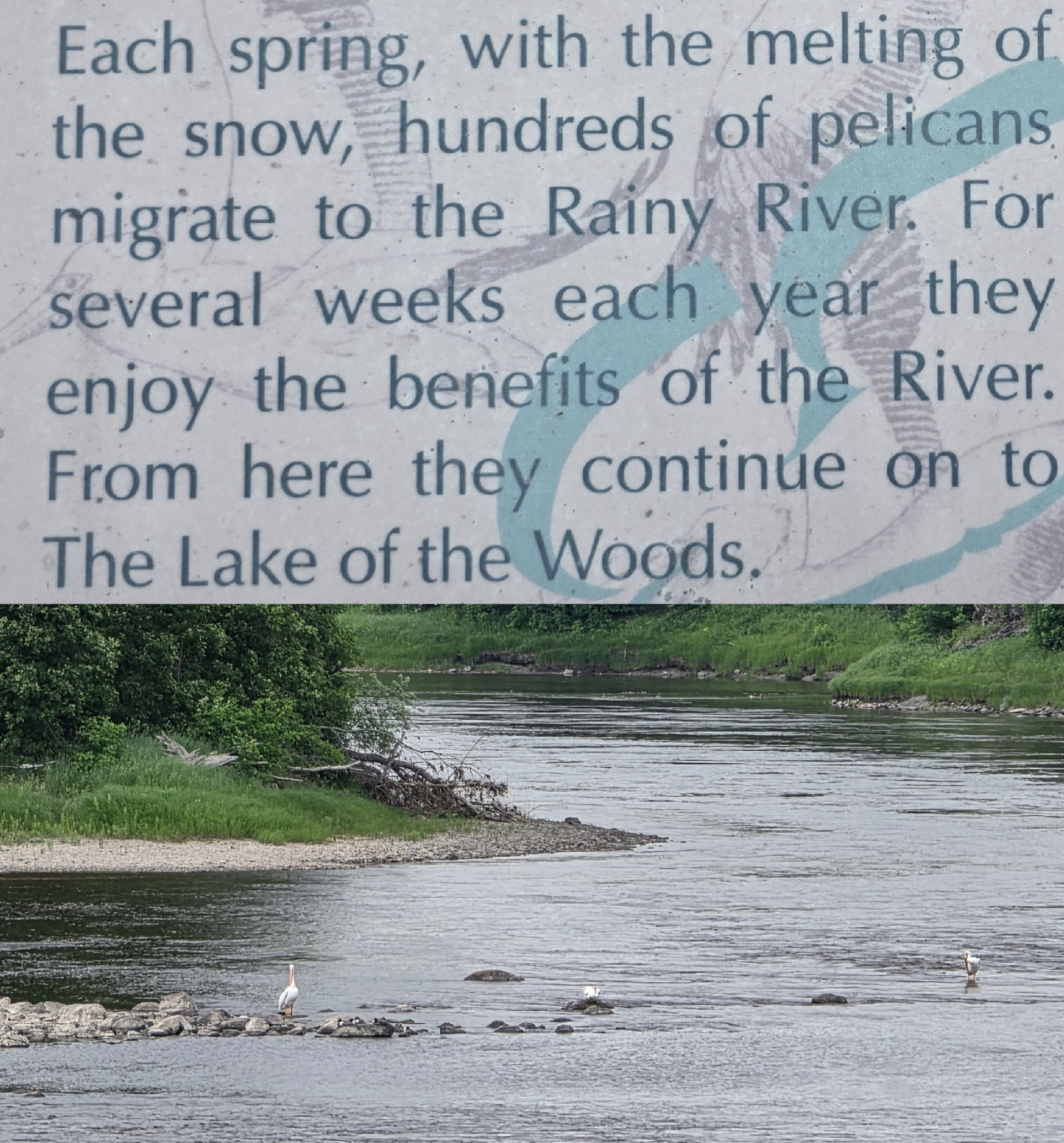 Our first stop was to see the round house and the cottage. A local had owned the land and recognized the importance of the mounds so preserved the area and eventually his descendants gifted the land to the Rainy River Band. They also purchased some other land around the main section of mounds from a settler who had partially destroyed one of the mounds. When an Indigenous person passed away, they would wrap the body in an animal fur until the body decomposed and then they would bundle up the remaining bones and place them in one of the mounds. At one point there were 23 mounds on the site, 15 remain today and 8 of those are visible from the tour. The fields around the mounds were beautiful with wildflowers and the biggest lady slipper flowers we’d ever seen. The white pelicans migrate through this area, and we saw 4 in the river. The guide told us they feed on the baby sturgeon fish. The Rainy River band has been trying to preserve the Sturgeon fish population, so they raise and release hatchlings. The fish is considered a threatened species in Canada, so the regulations are stricter than on the US side of the river. Before we left the mound area the guide offered to do a tobacco ceremony where she said a prayer and then released tobacco back to the earth.