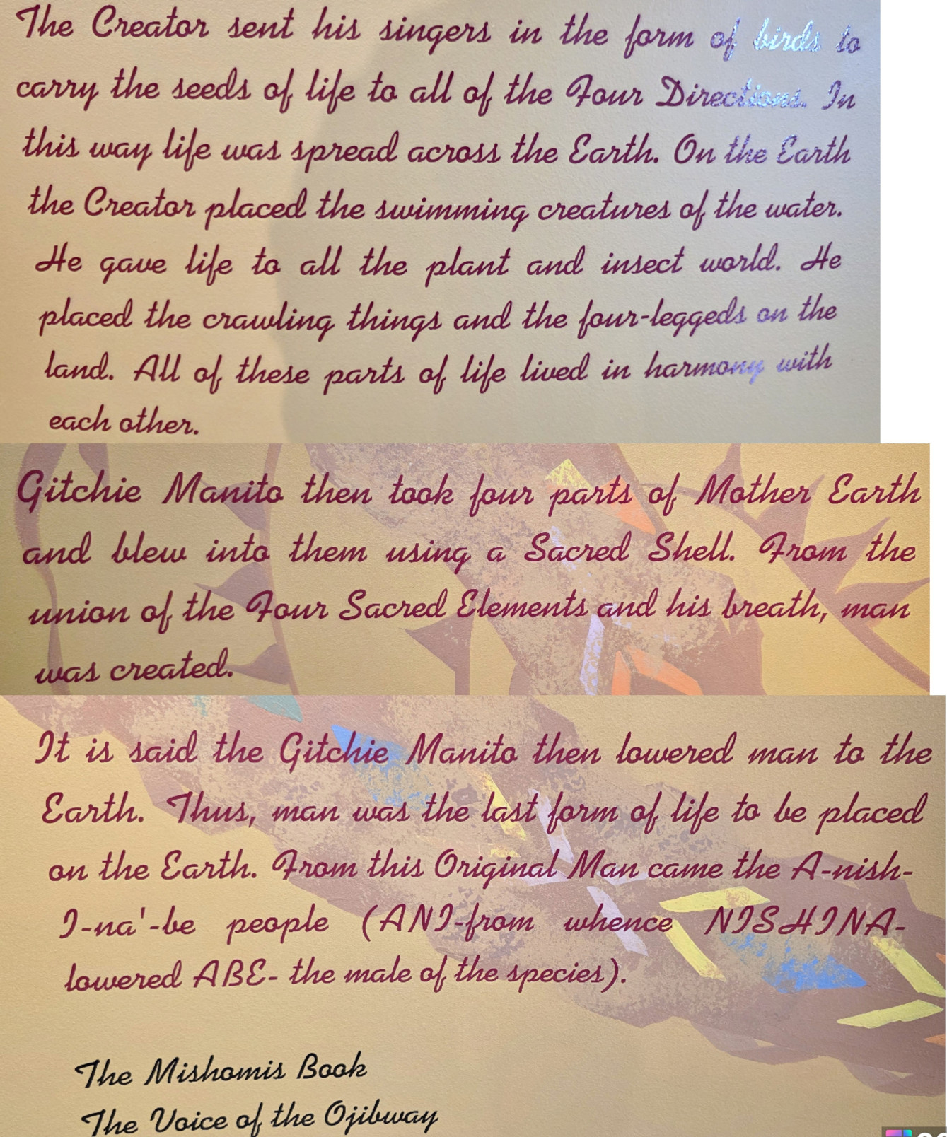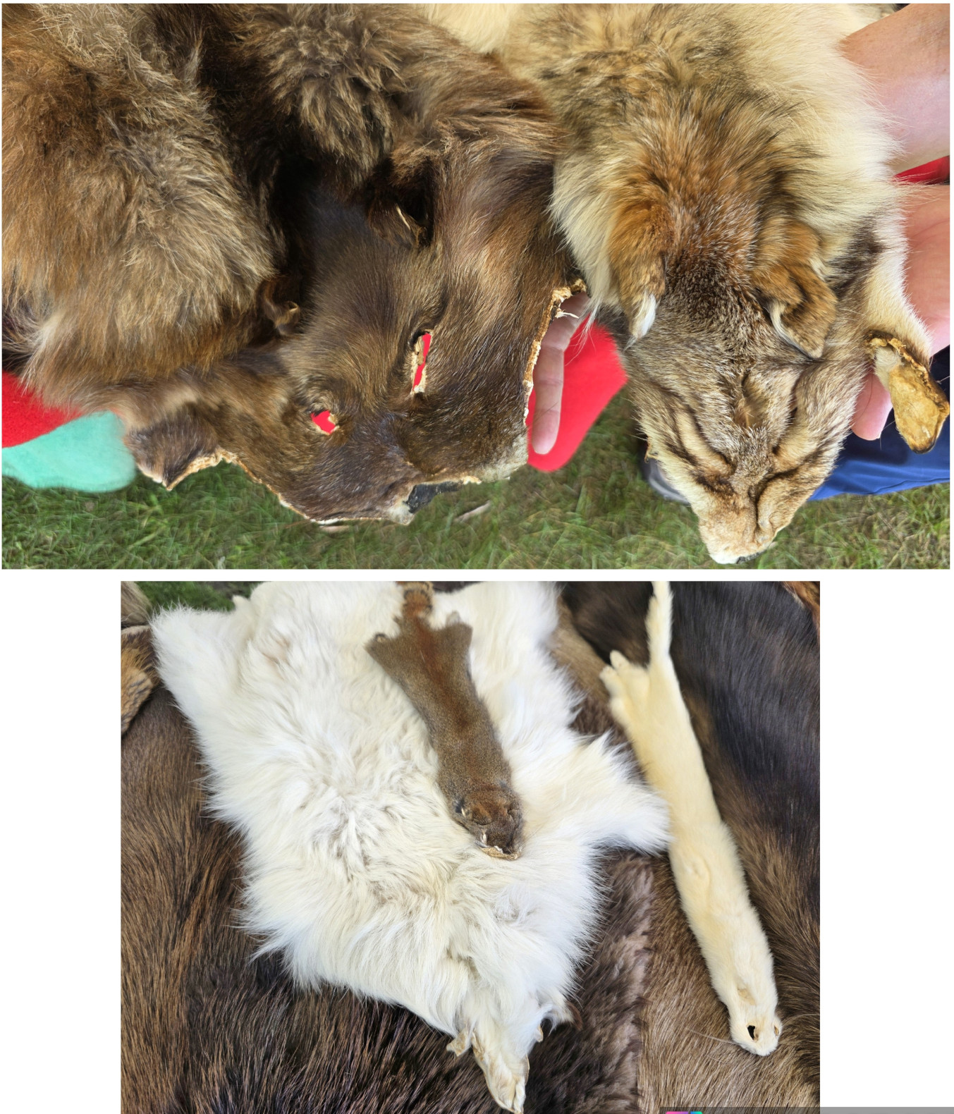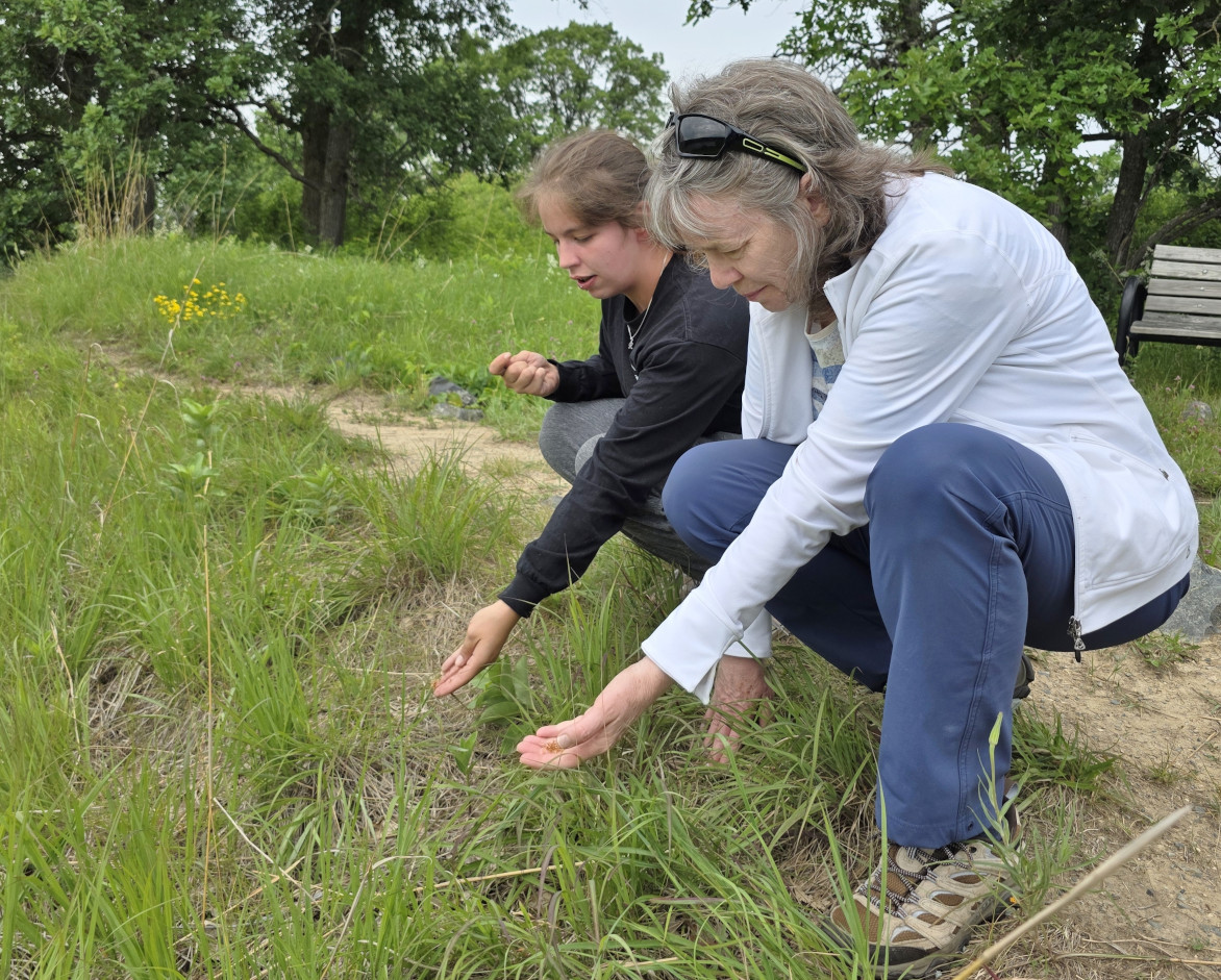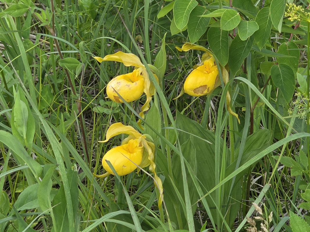 Our first stop was to see the round house and the cottage. A local had owned the land and recognized the importance of the mounds so preserved the area and eventually his descendants gifted the land to the Rainy River Band. They also purchased some other land around the main section of mounds from a settler who had partially destroyed one of the mounds. When an Indigenous person passed away, they would wrap the body in an animal fur until the body decomposed and then they would bundle up the remaining bones and place them in one of the mounds. At one point there were 23 mounds on the site, 15 remain today and 8 of those are visible from the tour. The fields around the mounds were beautiful with wildflowers and the biggest lady slipper flowers we’d ever seen. The white pelicans migrate through this area, and we saw 4 in the river. The guide told us they feed on the baby sturgeon fish. The Rainy River band has been trying to preserve the Sturgeon fish population, so they raise and release hatchlings. The fish is considered a threatened species in Canada, so the regulations are stricter than on the US side of the river. Before we left the mound area the guide offered to do a tobacco ceremony where she said a prayer and then released tobacco back to the earth.