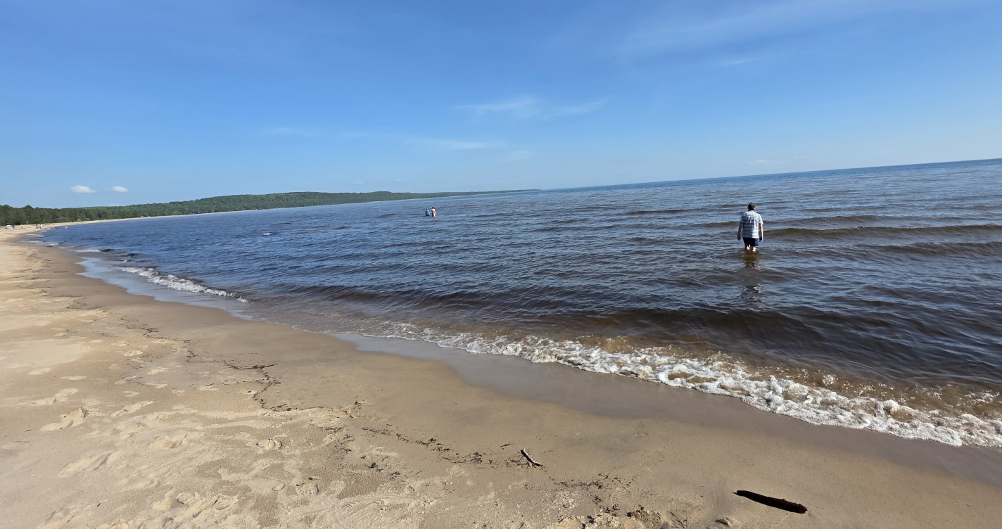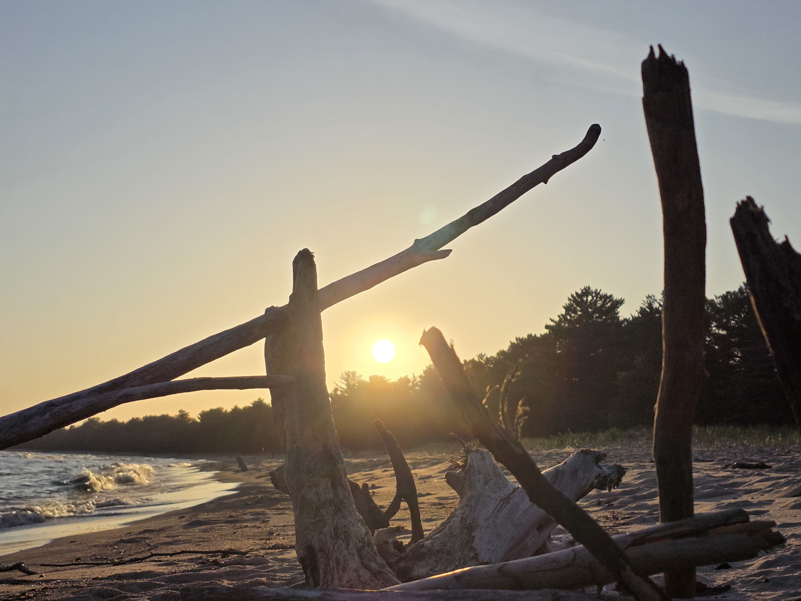 After Fort St. Joseph we carried on along the Trans Canada highway and found cheap diesel at an Esso station (Sharon gets a discount) in Sault Ste. Marie. We got diesel for $1.25/l and along the trip we saw it as high as $1.65/l. We did a bit of shopping in the Soo and then carried on to Pancake Bay PP where we had a beautiful campsite right across from the beach and Lake Superior. I had picked up some new water shoes in the Soo because we had forgotten to bring ours, so I had to check them out and go for a swim. The water was very calm, and it had been 34C in the Soo, so the water was much warmer than when we go swimming in Colpoys Bay at home. After we had dinner, we took a stroll on the beach and watched the sunset.