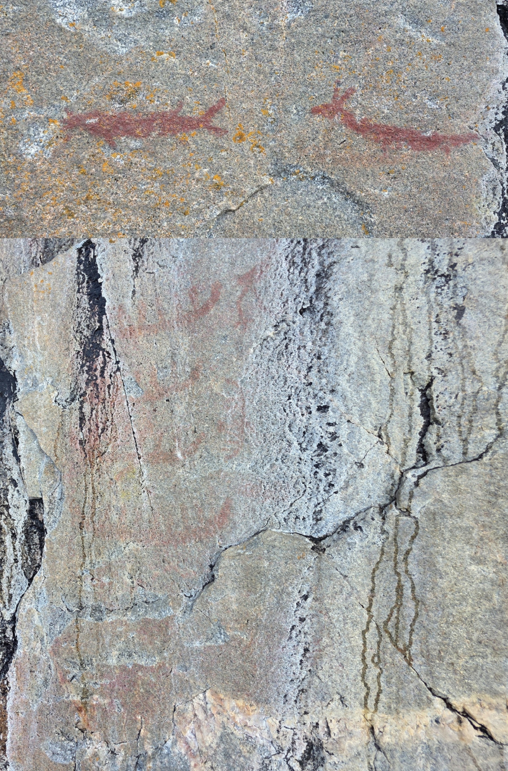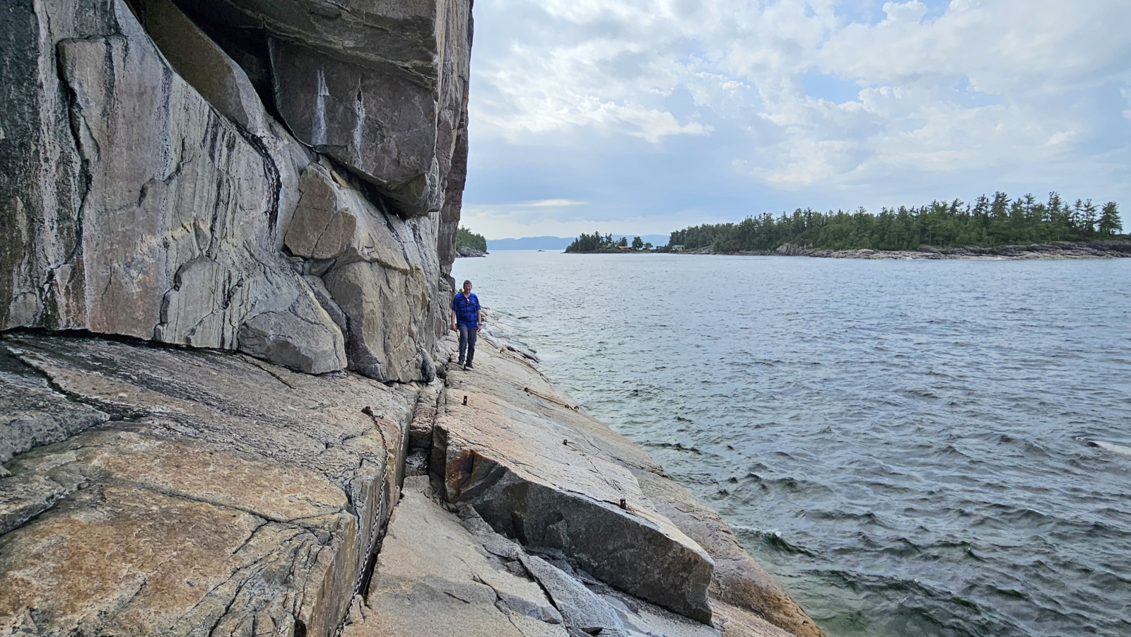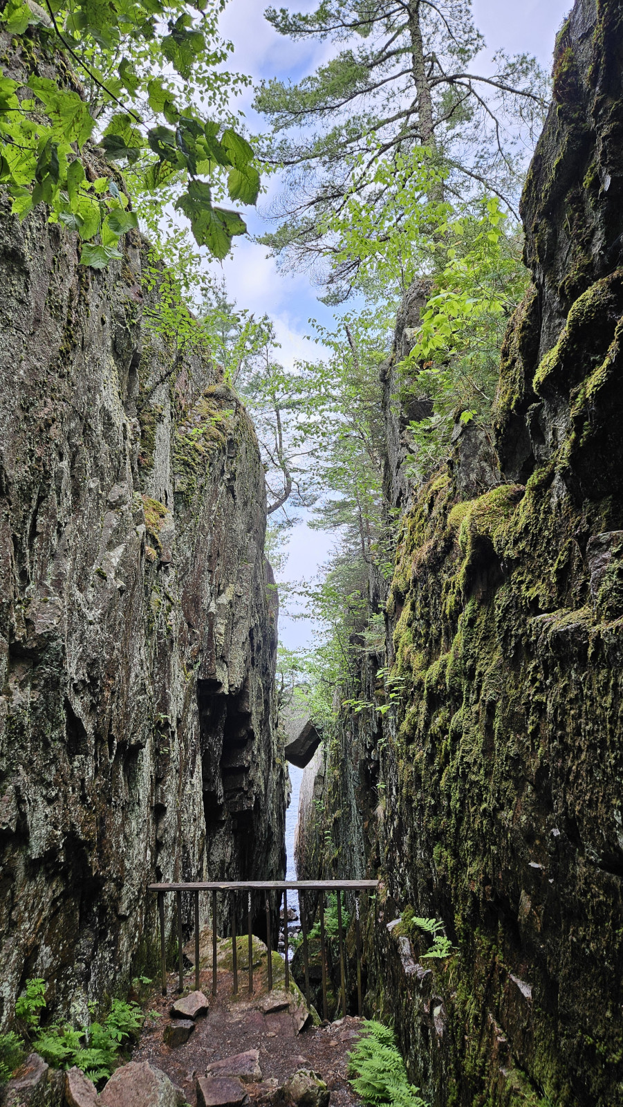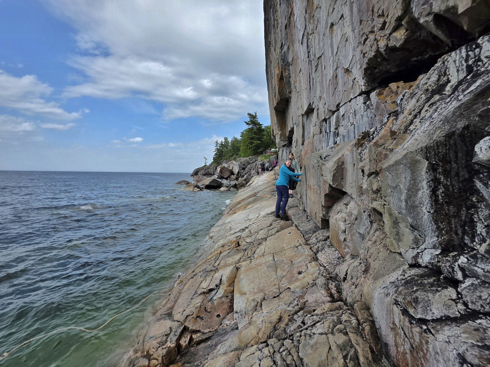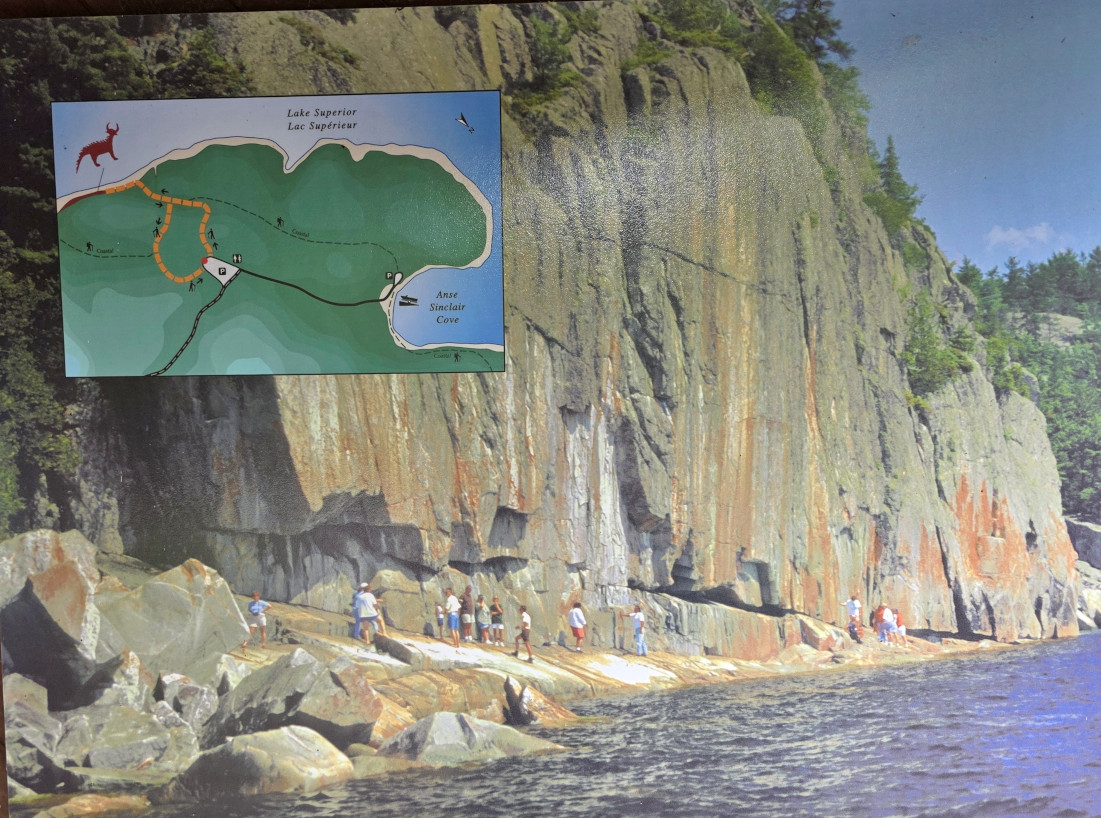 The next day was the pretty drive through Lake Superior PP, and we decided to stop at the Agawa Rock Pictographs since we hadn’t been there in awhile. There were only a couple of other people there, so the mosquitoes were anxious for their breakfast😉 The hike is a short scenic loop through some rock crevasses until you reach the rock wall where the pictographs are located. The Ojibwe people painted the pictographs of mystical beings, animals, and humans, and they are believed to be from 150 to 400 years old. You need a calm day to walk along the rock wall because the Lake Superior waves can crash up against the surface. They have some chains, ropes, and anchor pins to help you traverse the wall. We were able to see most of the pictographs without getting wet or slipping.