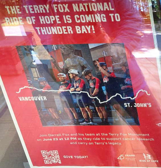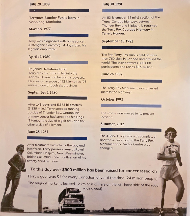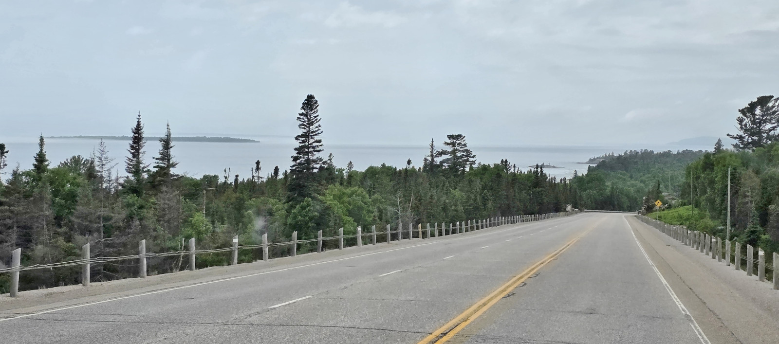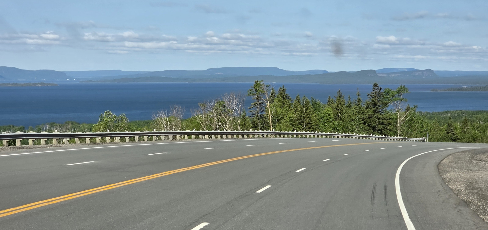 The drive the next day was totally clear. We crossed the Nipigon bridge and further north we came across the Terry Fox National Ride of Hope on their cross Canada ride. When we arrived at the Terry Fox memorial, we realized we had just missed greeting them the day before when they had a ceremony at the memorial. Our Terry Fox team (Sharon and I) have participated in the Terry Fox run for 43 of the 44 years it has been going, and we’ll be doing it again this year. We’re in the top 1% of the teams across Canada in terms of fund raising.
