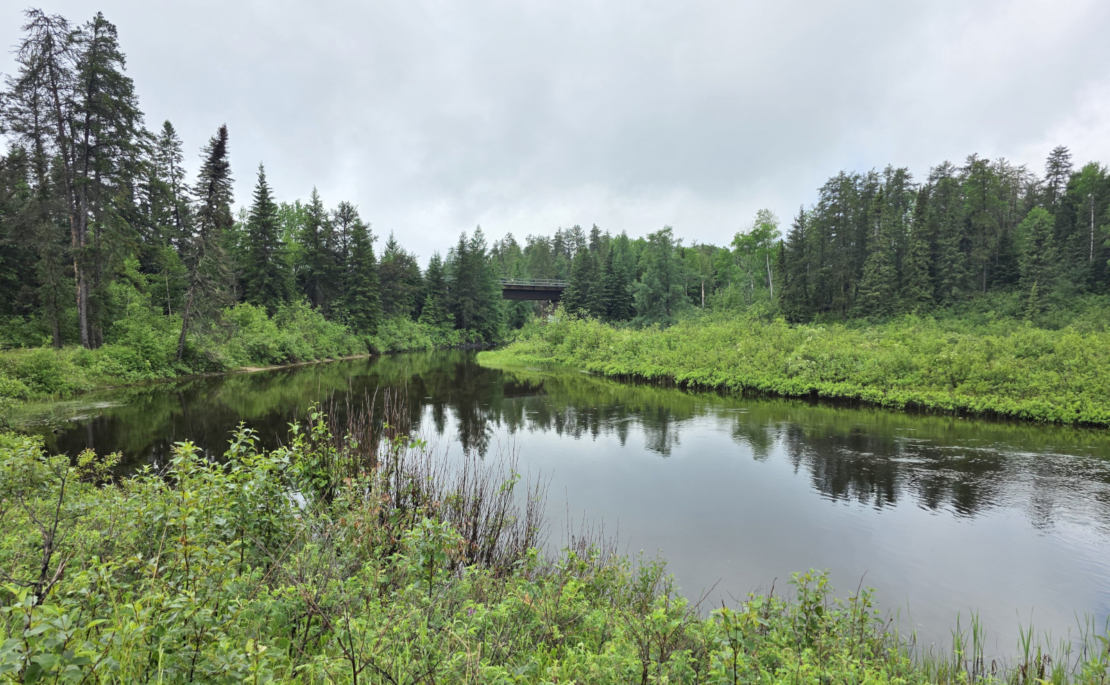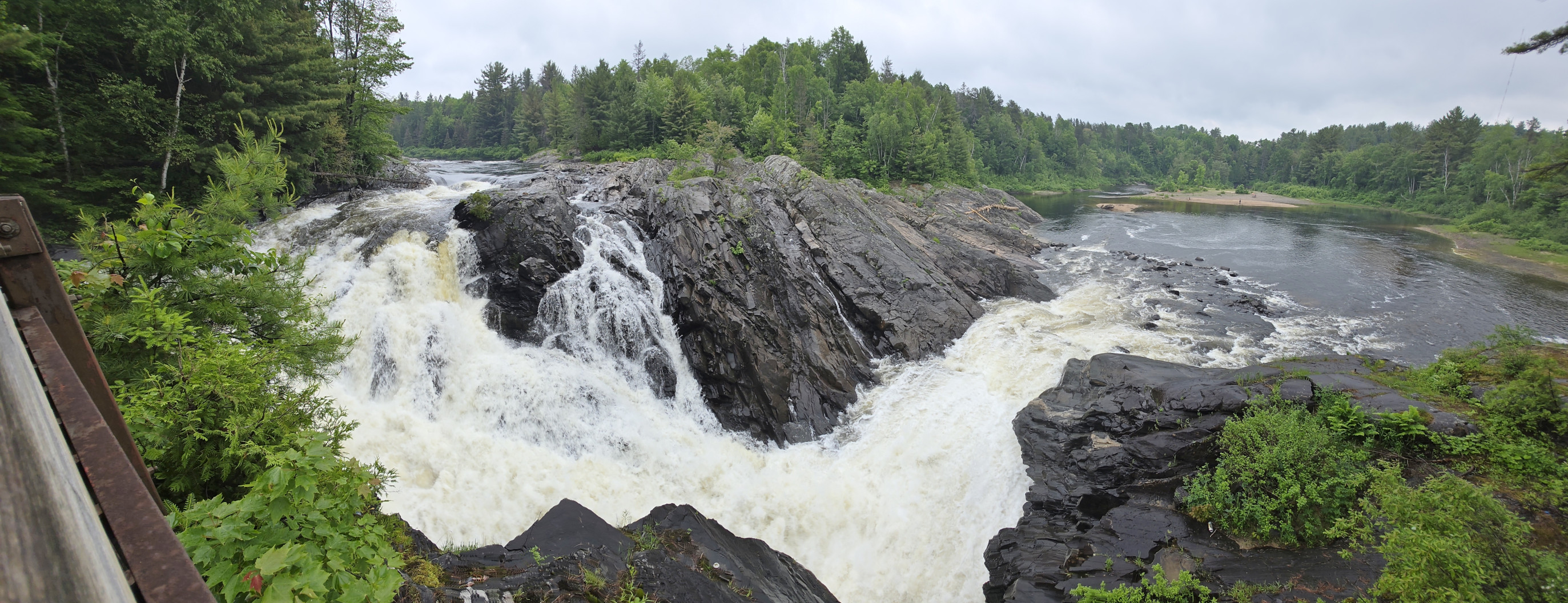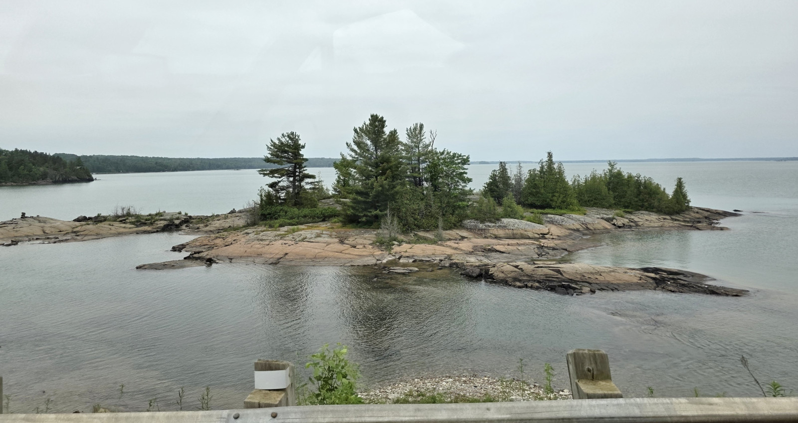 We drove through Manitoulin Island and exited the island across the Little Current Swing bridge which luckily, we didn’t have to wait too long to cross. Our destination for the first night was Chutes Provincial Park (PP) and just as we arrived it started raining again. However, the rain stopped long enough that we could do a walk to see the waterfalls. The waterfalls got their name from the logging days when they would bring the logs down the river and across the water fall to flow downstream. The mosquitoes were out after the rain looking for fresh blood. Later we realized that this trip was the first June trip, of the 9 trips we have taken. Typically, we’ve been travelling this route in August/September. We soon realized how different the bug situation is at this time of year!