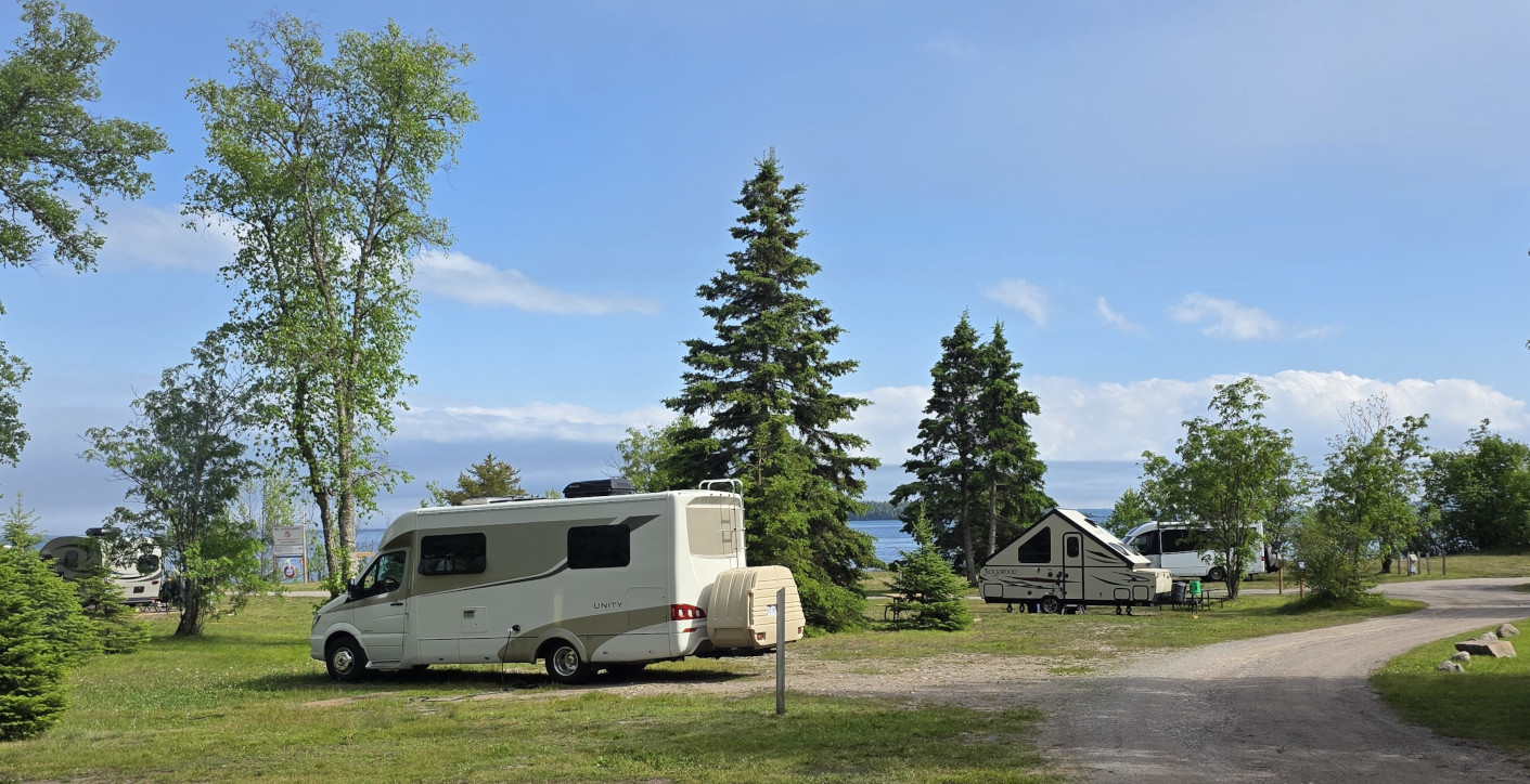 Happy trails Guys. We are right behind you. Your email couldn’t have come at a better time. You have given us some interesting places for us to explore. We spent a week on St Joseph Island on a friend’s farm and touring around. We watched ships coming at the encampment.. There is great local music to listen too at the Tiltin Hilton . Richard Landing also great wings at the Legion . We have now moved on to Batchawana Bay for the long weekend. Our next stop is White Lake PP. Enjoy your family reunion and safe travels. H&C