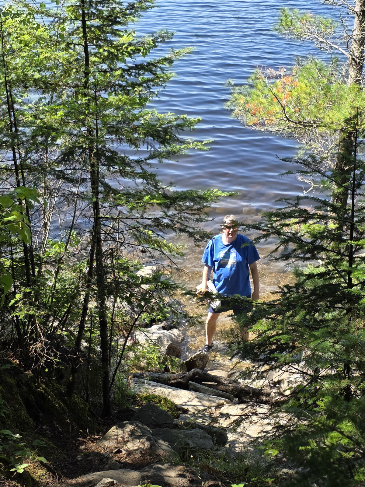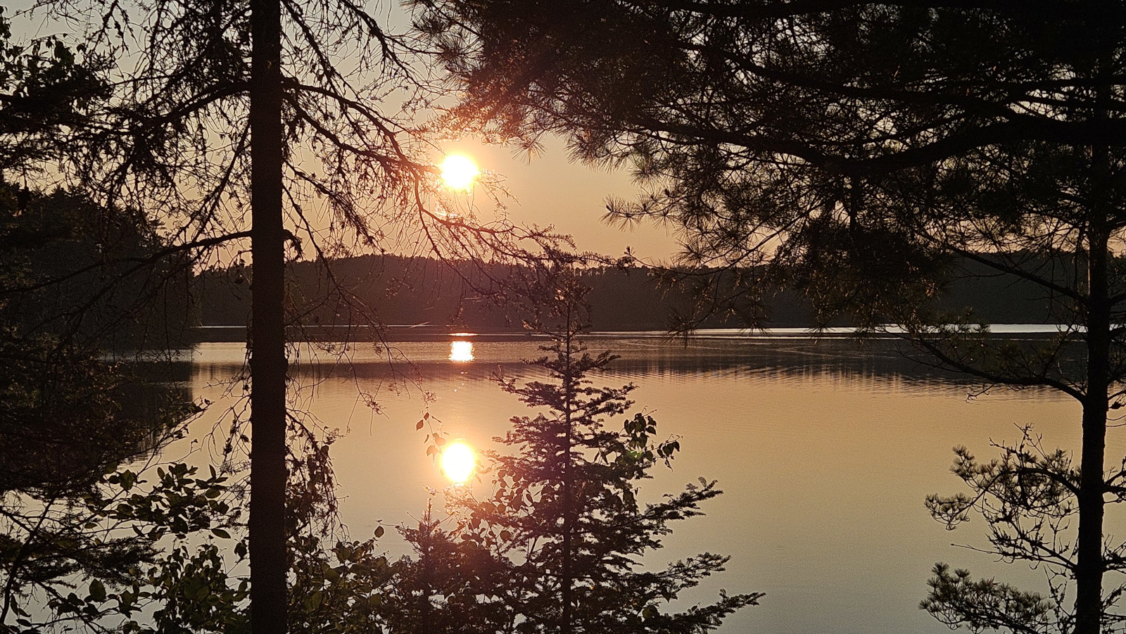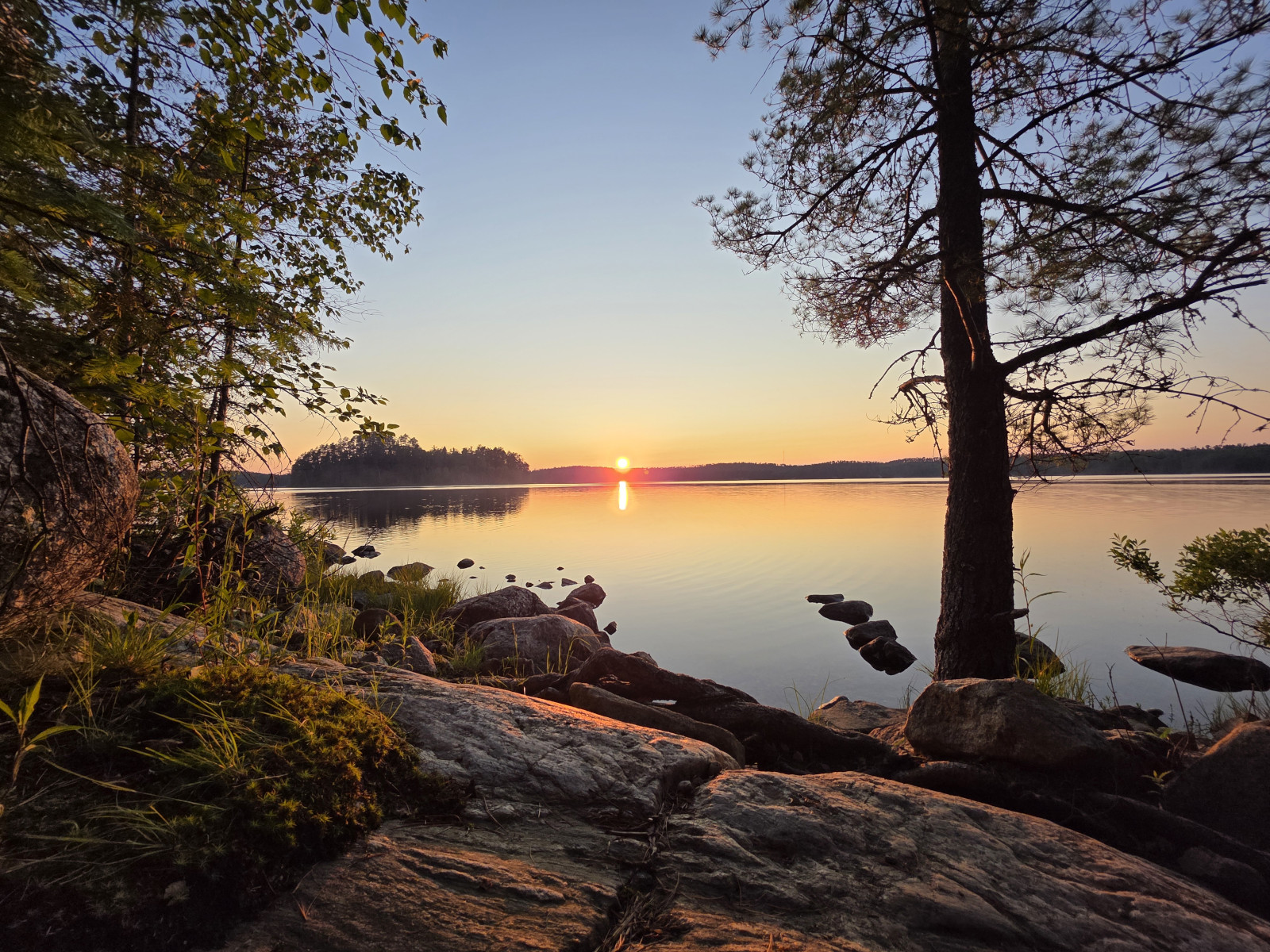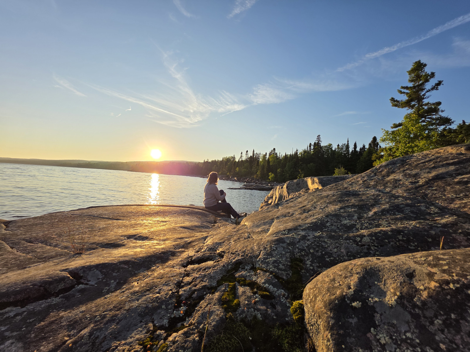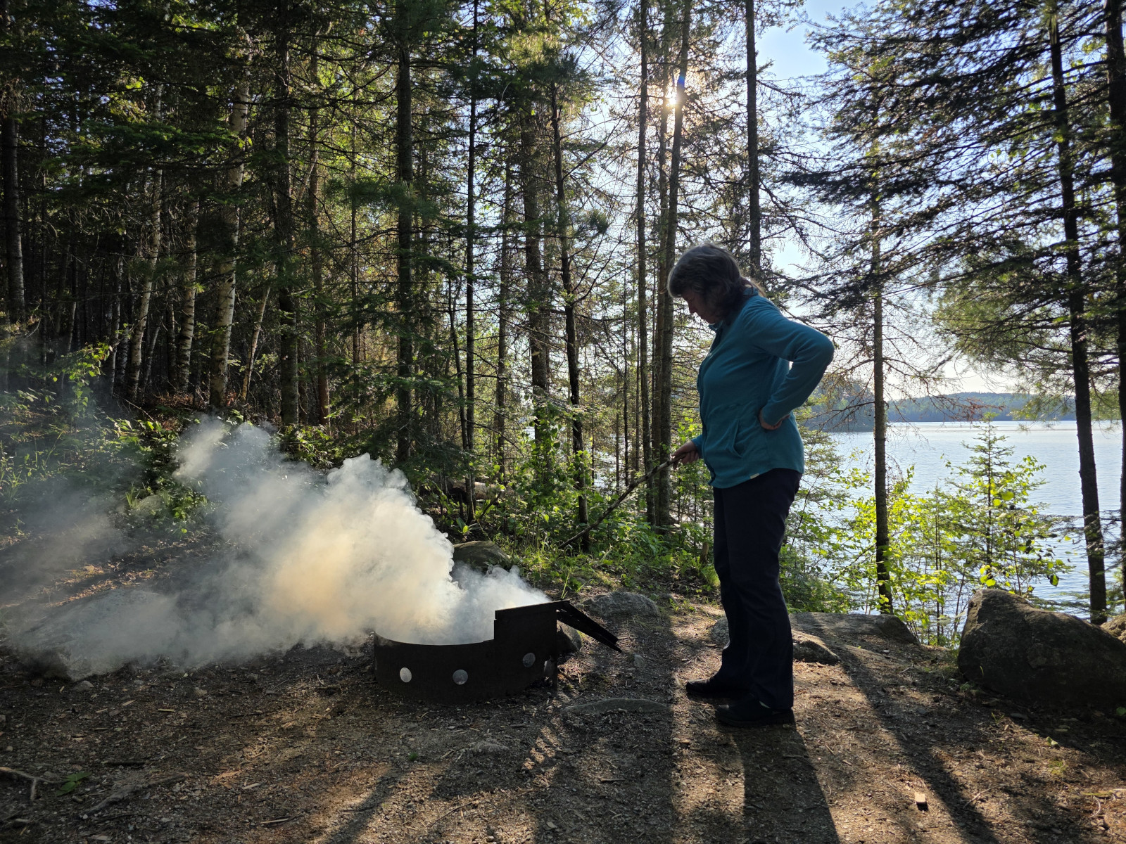 We took the Thunder Bay bypass and headed onto Quetico PP where we arrived prior to the 2 pm check in as we had crossed the time zone line from Eastern time to Central time. At our campsite we found out that the electric outlet was not working, although the neighbour’s outlet in the same post was working. We called the office, and they sent maintenance people to look at it, but they couldn’t resolve the issue. We plugged into the neighbour’s outlet since they hadn’t arrived yet. Since we had one of our favourite sites we really didn’t want to move to another one. The Park Manager Gavin came by and was very apologetic about the issue and offered to reimburse us for the cost of electricity and give us free firewood. However, when the neighbours did show up, they didn’t have the 100’ of electric cord necessary to connect to the pedestal so we got to stay plugged in to their slot and then they got the credit for the electricity. We realized later that the free firewood was not properly dried out, so we spent 3 hours tending our smoke fest😉 However the sunset more than made up for it.