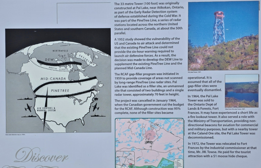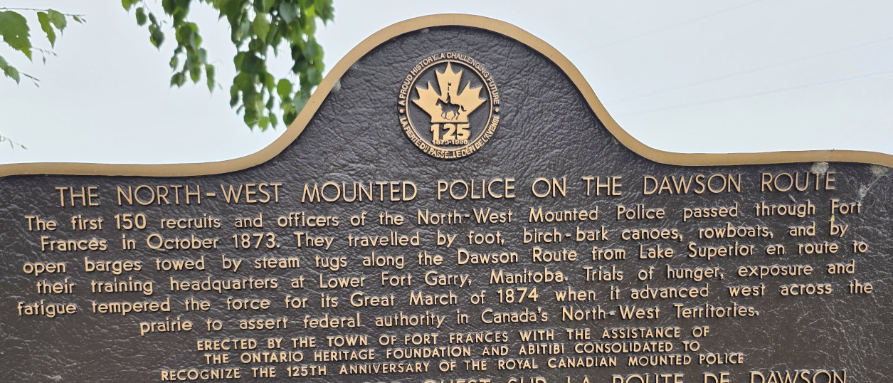 The main road through Fort Frances was under construction and when we followed the detour route, we discovered some other new things we hadn’t seen before. There was a 100’ lookout tower that was originally part of the Early Radar Detection system as a defense mechanism during the Cold War. They also had some sign boards explaining the logging and pulp and paper history of Fort Frances. Lastly there was a sign board about the North-West Mounted Police when they went through Fort Frances in October 1873. Sharon’s Dad had been involved in the setup of a commemorative statue in Fort Dufferin near Emerson Manitoba for the March West.