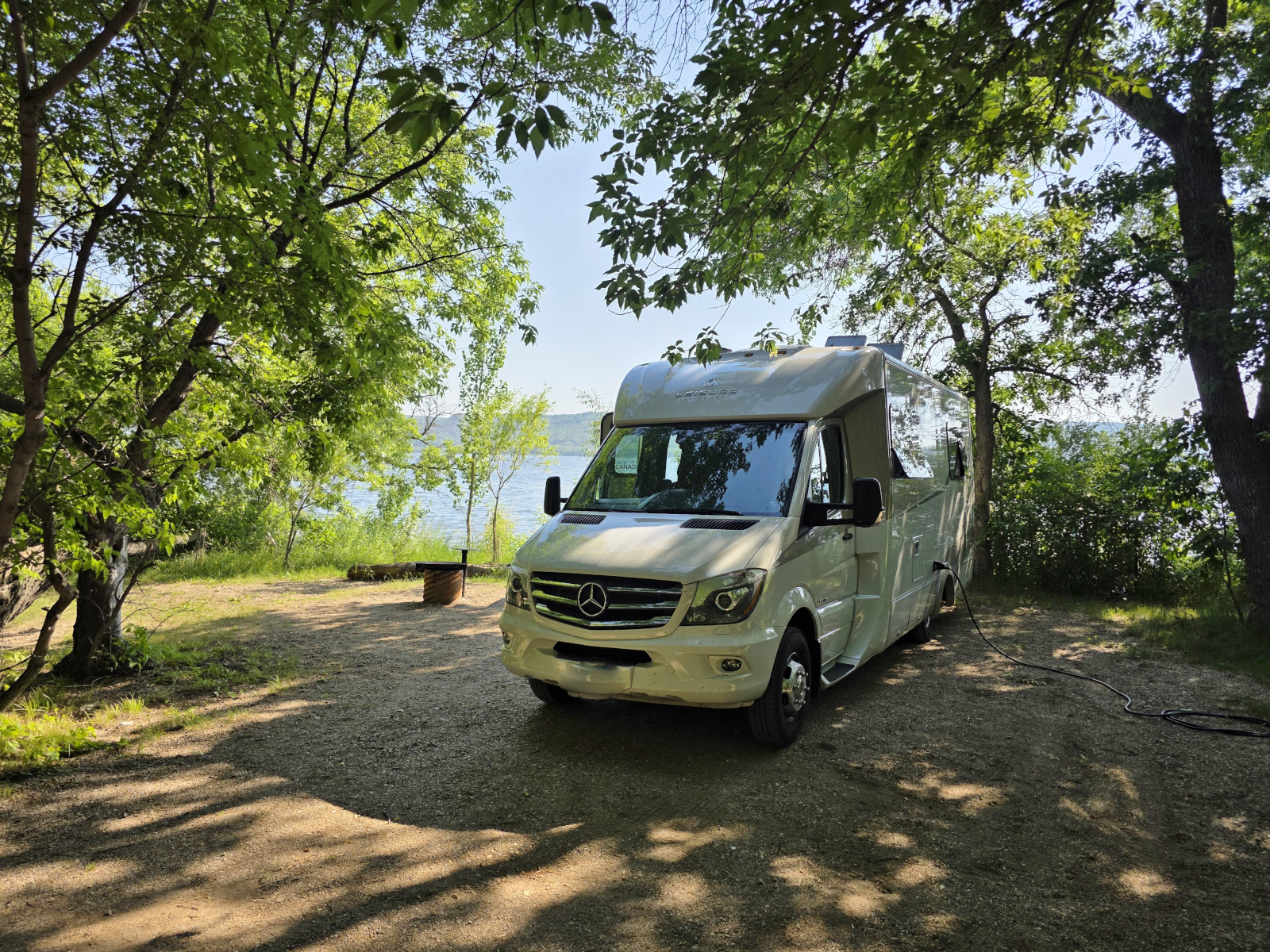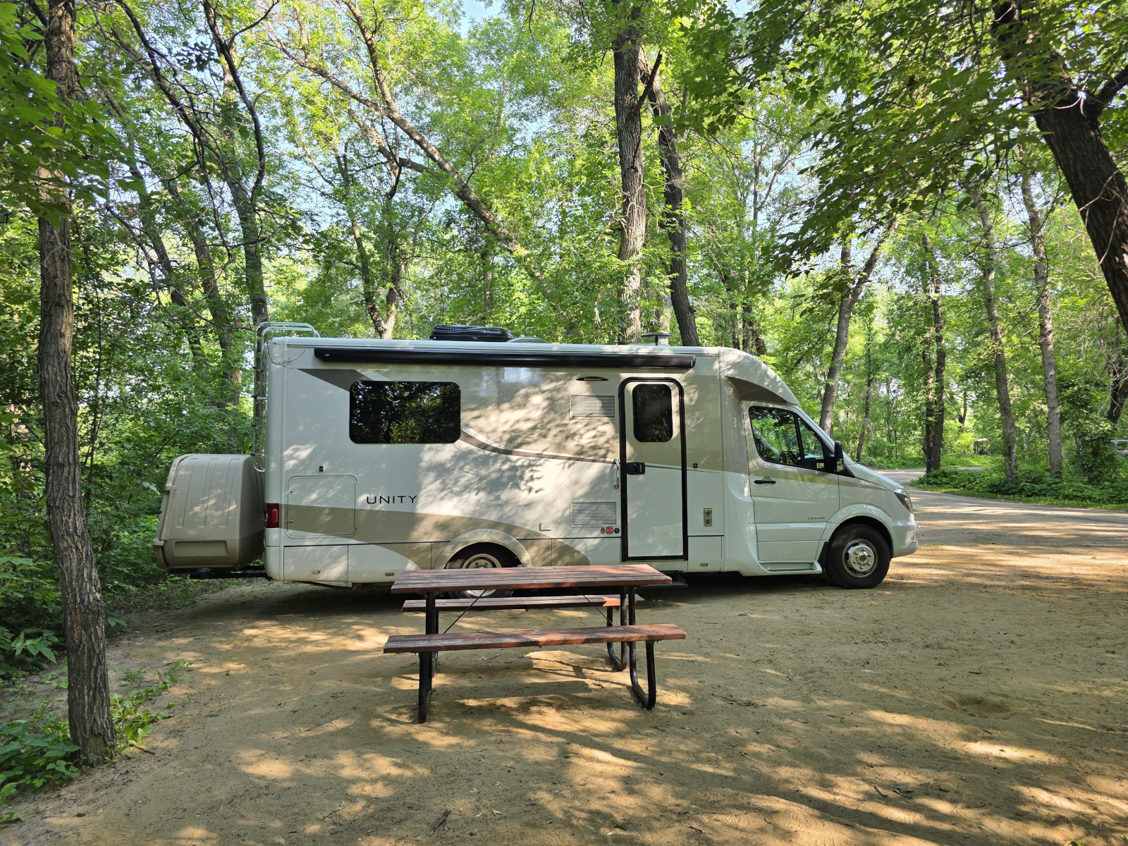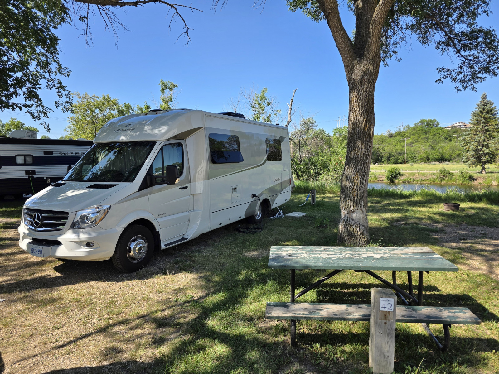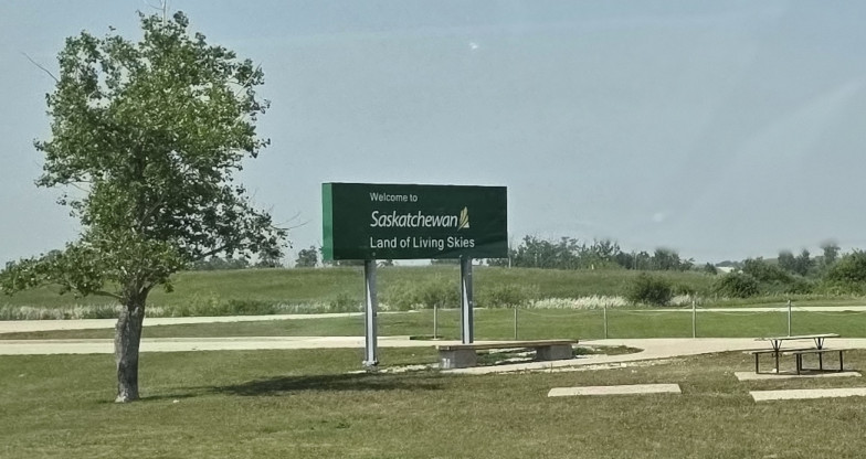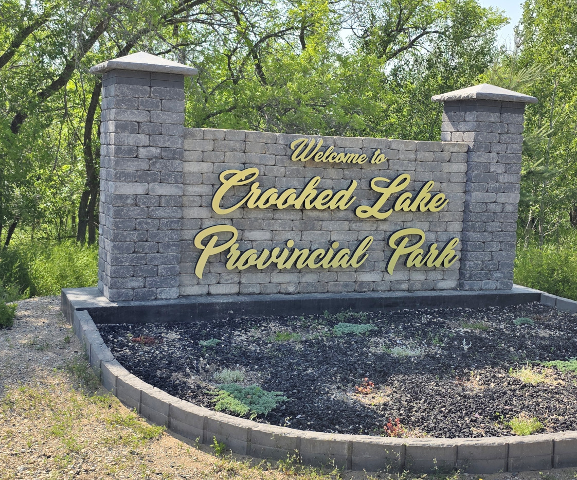 We entered Saskatchewan and headed North off the TransCanada and had a dramatic descent into the Qu’Appelle Valley in order to reach Crooked Lake PP. The Saskatchewan parks charge you for your campsite, but they also charge a daily “parking permit” fee of $11 per vehicle. Our campsite was quite pretty right on Crooked Lake, but we had to back through a lot of tree branches to get into the site. We weren’t too happy about that after having our ceramic coating done on the vehicle before we left for this trip. We did a couple of kilometres walk around the campground, down to the beach (water was nice), and to see the boat launch area. When we returned for happy hour at our campsite there was a baby crow that was in our campsite. He was crying because he couldn’t figure out how to fly back to the nest. His parents kept swooping down trying to tell him to fly but he wasn’t able. When we left the next day, he was still hopping around, we hope he eventually figured out what to do. Crooked Lake PP was a new one for us and 1 night was enough time as they didn’t have any hiking trails.