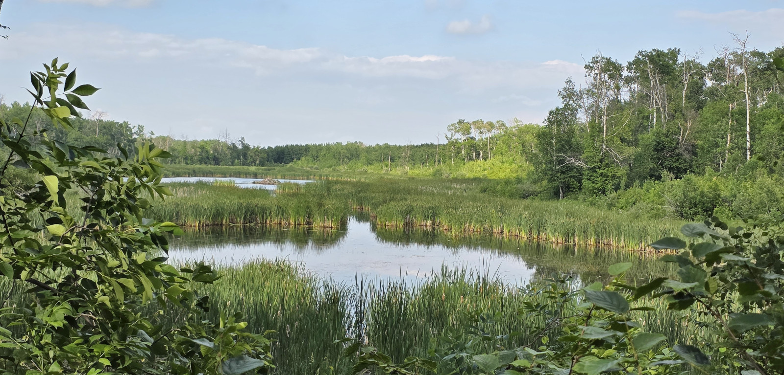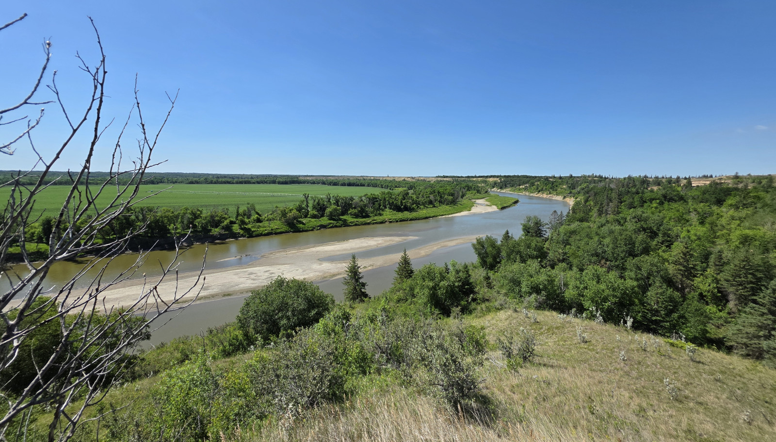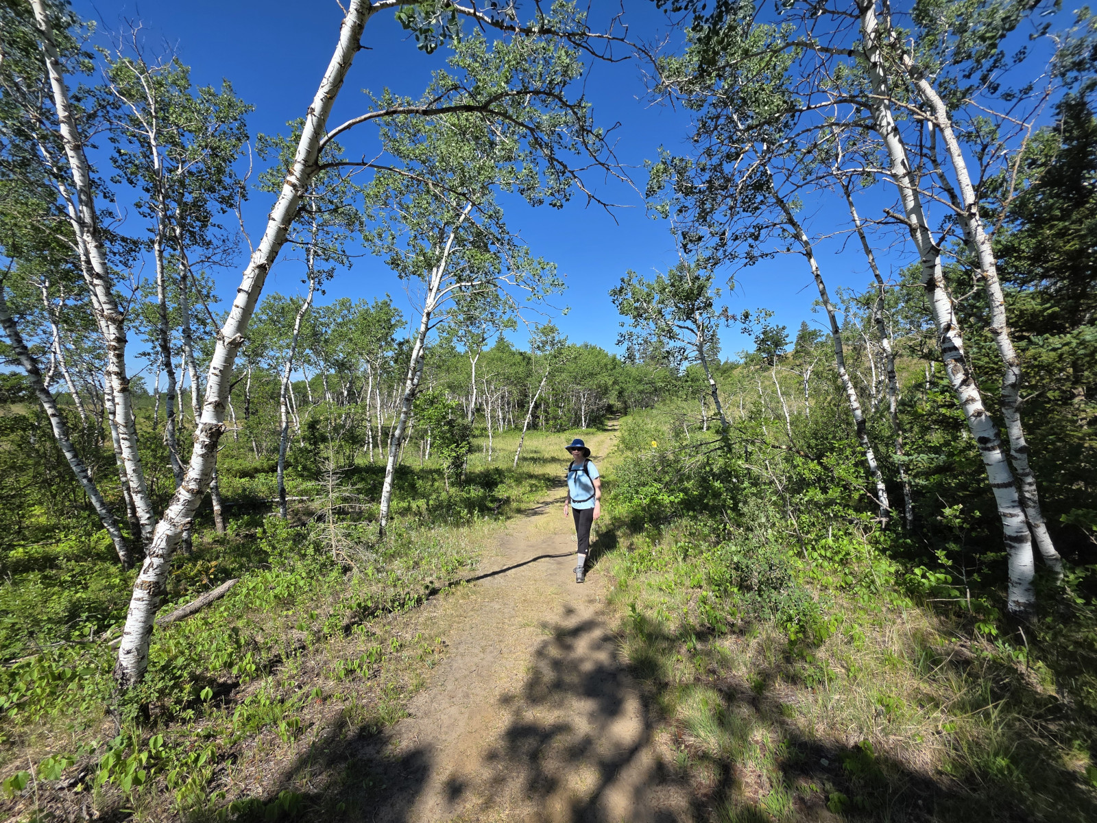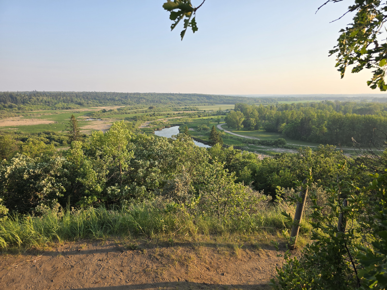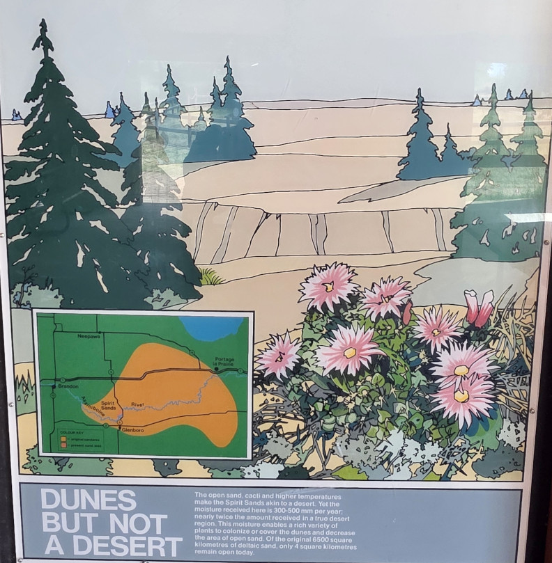 We saw lots of flowers along the trail and insects in the sand. The Devil’s Punch Bowl was formed by springs that were flowing towards the Assiniboine River but after the sandbanks collapsed, they formed a bowl-shaped depression called a punch bowl. Over time the bowl continues to move further away from the river. The colour of the water makes for a dramatic contrast from the surrounding dunes and forest. The bowl now has lots of water plant life and even some turtles. We had seen very few people on the trails but there was a fair number congregating around the bowl. After the Devil’s Punch Bowl, we detoured over to see the Assiniboine River which had been a major trade route with birchbark canoes, river ferries, and even paddlewheel steamers late in the 1800’s. We had done this same hike 9 years ago but that day we got very wet with rain so even though we had lots of heat this time it was still more enjoyable.