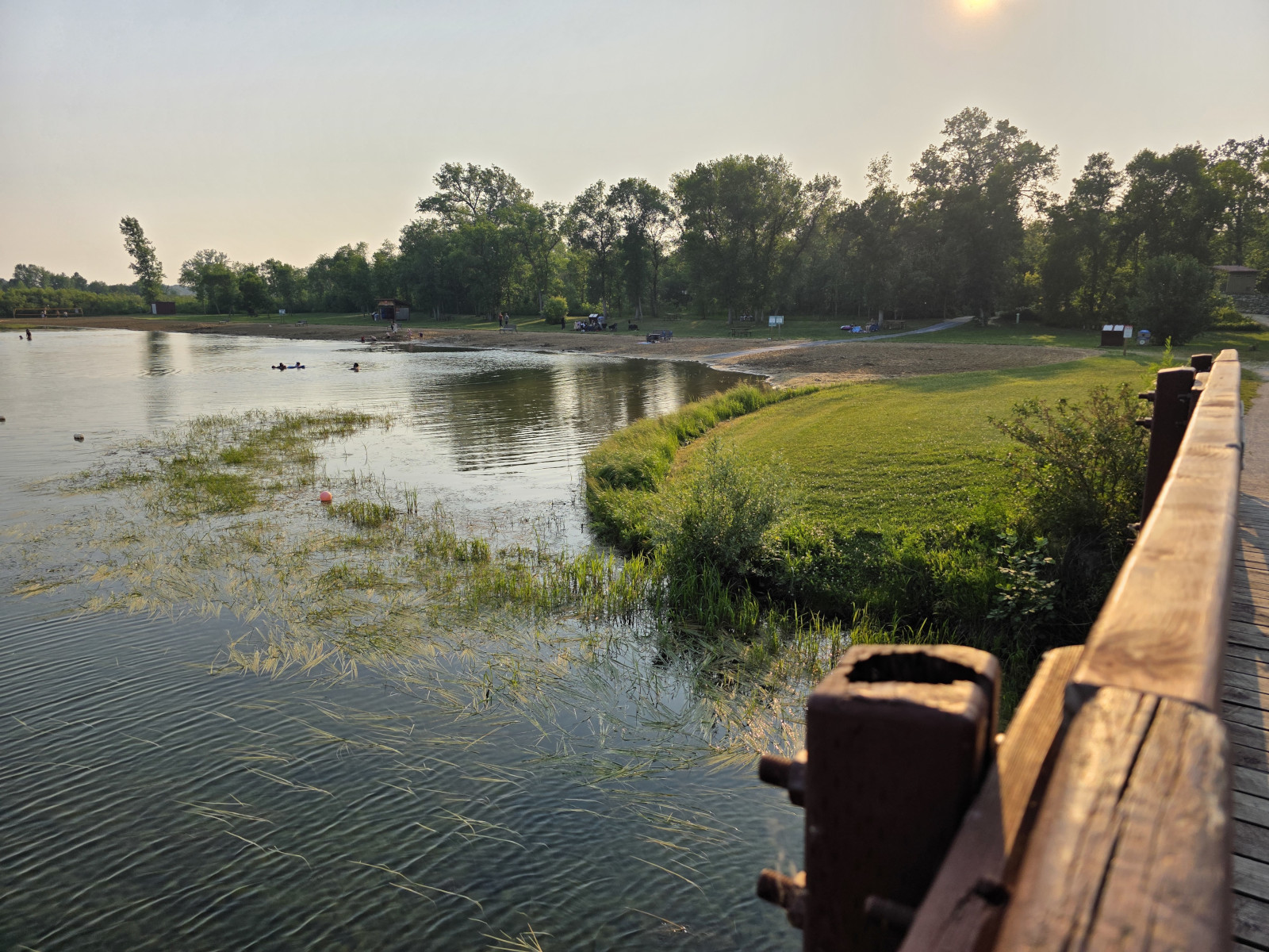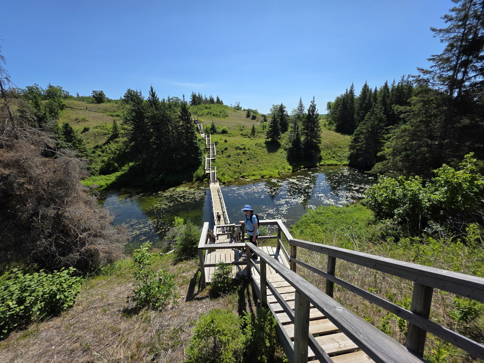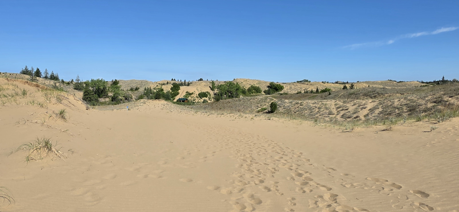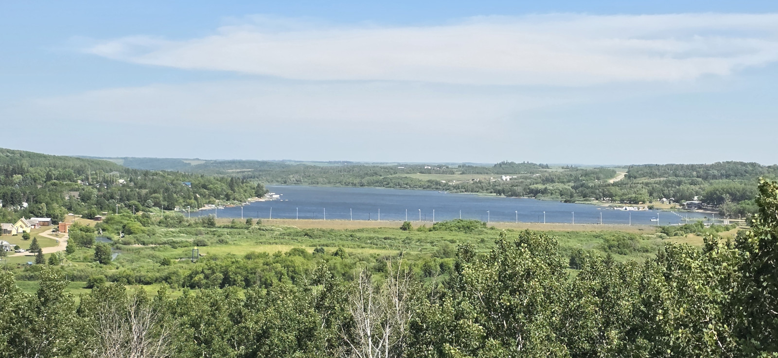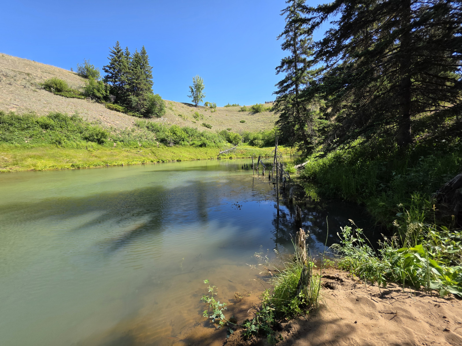 We saw lots of flowers along the trail and insects in the sand. The Devil’s Punch Bowl was formed by springs that were flowing towards the Assiniboine River but after the sandbanks collapsed, they formed a bowl-shaped depression called a punch bowl. Over time the bowl continues to move further away from the river. The colour of the water makes for a dramatic contrast from the surrounding dunes and forest. The bowl now has lots of water plant life and even some turtles. We had seen very few people on the trails but there was a fair number congregating around the bowl. After the Devil’s Punch Bowl, we detoured over to see the Assiniboine River which had been a major trade route with birchbark canoes, river ferries, and even paddlewheel steamers late in the 1800’s. We had done this same hike 9 years ago but that day we got very wet with rain so even though we had lots of heat this time it was still more enjoyable.