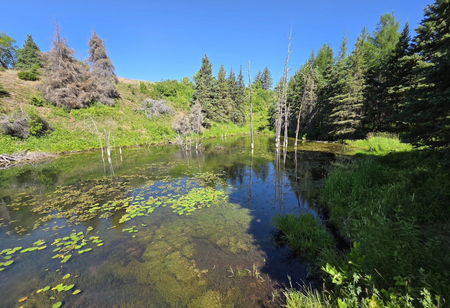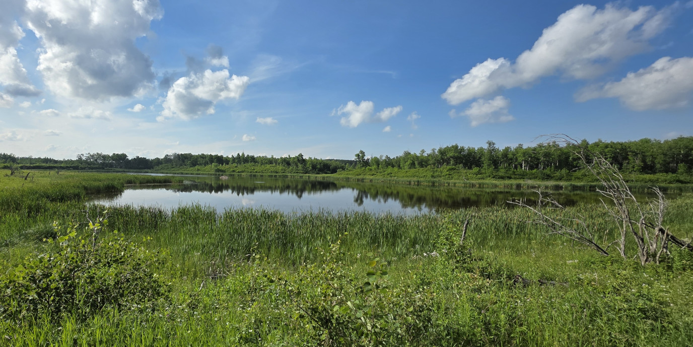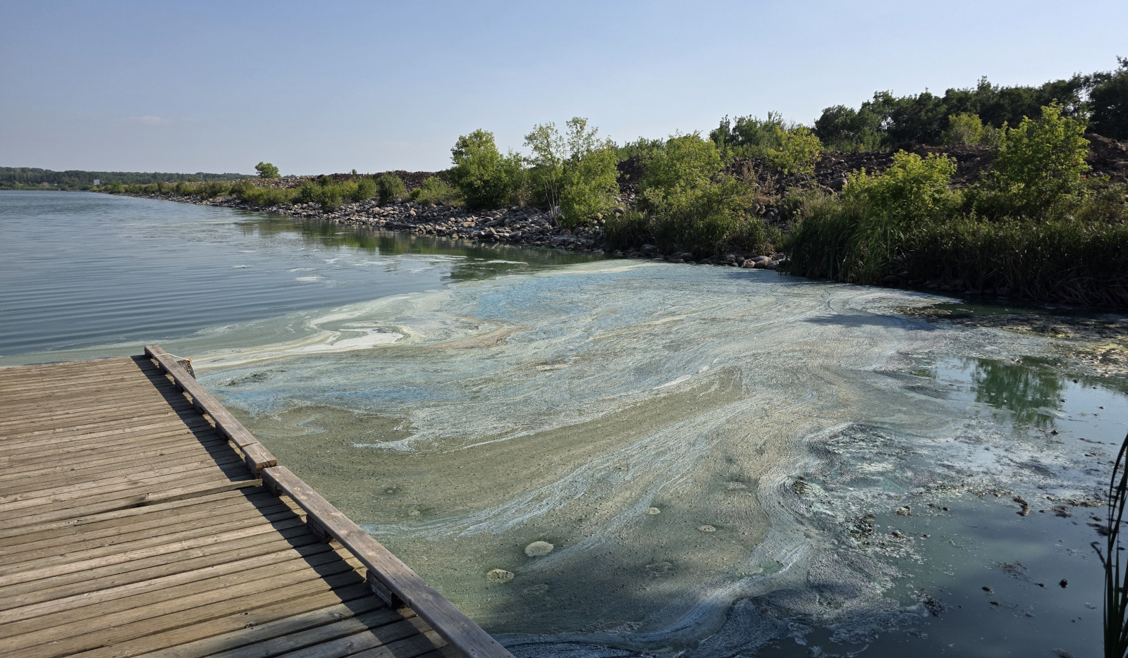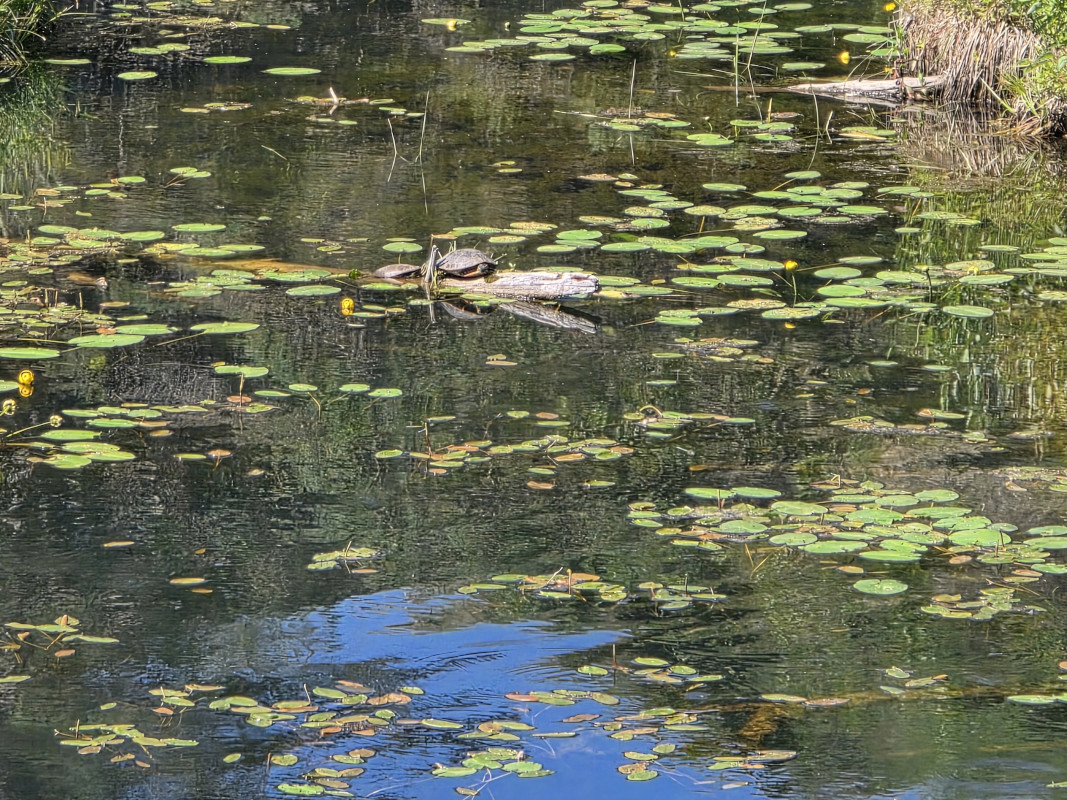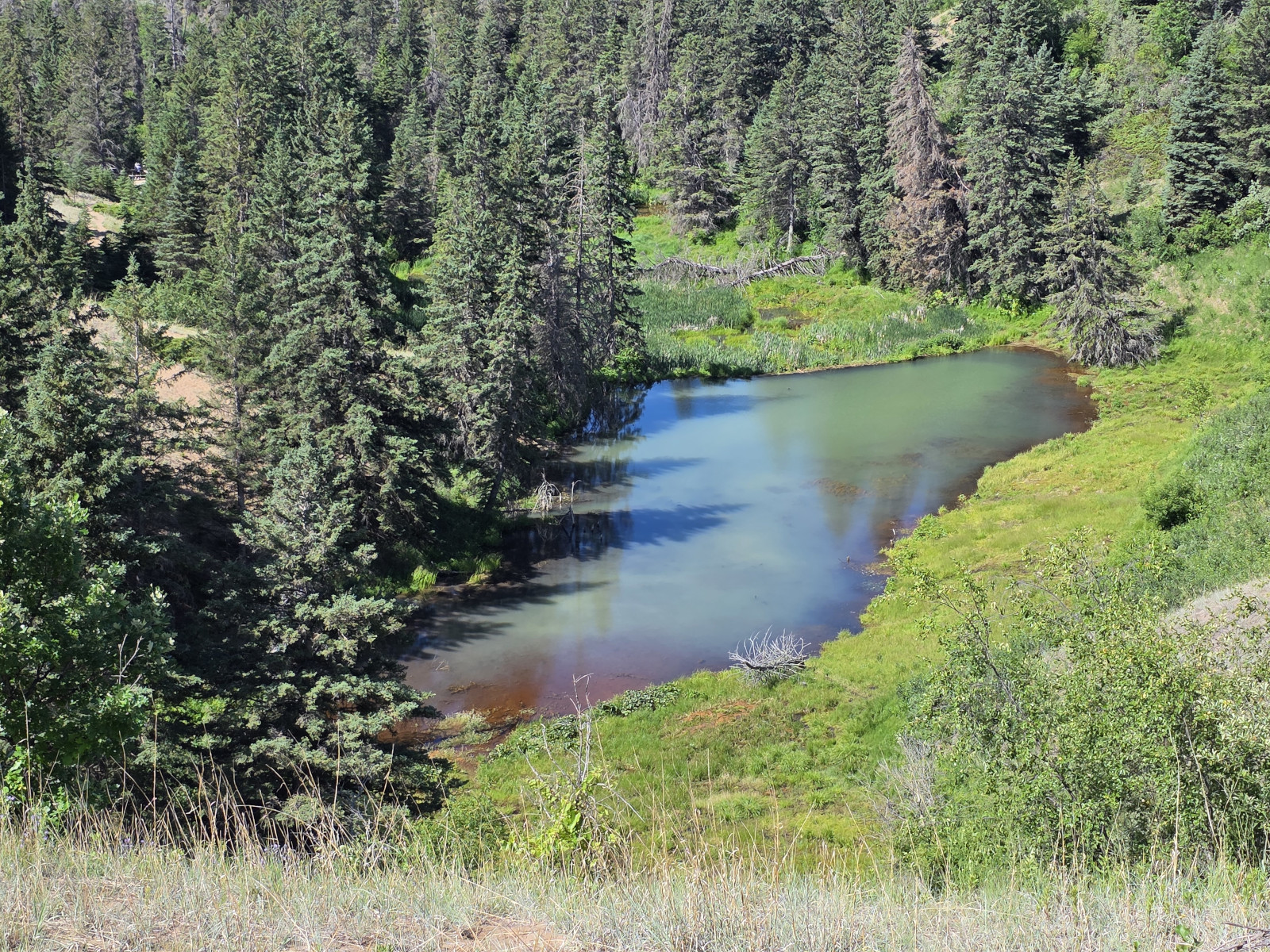 We saw lots of flowers along the trail and insects in the sand. The Devil’s Punch Bowl was formed by springs that were flowing towards the Assiniboine River but after the sandbanks collapsed, they formed a bowl-shaped depression called a punch bowl. Over time the bowl continues to move further away from the river. The colour of the water makes for a dramatic contrast from the surrounding dunes and forest. The bowl now has lots of water plant life and even some turtles. We had seen very few people on the trails but there was a fair number congregating around the bowl. After the Devil’s Punch Bowl, we detoured over to see the Assiniboine River which had been a major trade route with birchbark canoes, river ferries, and even paddlewheel steamers late in the 1800’s. We had done this same hike 9 years ago but that day we got very wet with rain so even though we had lots of heat this time it was still more enjoyable.