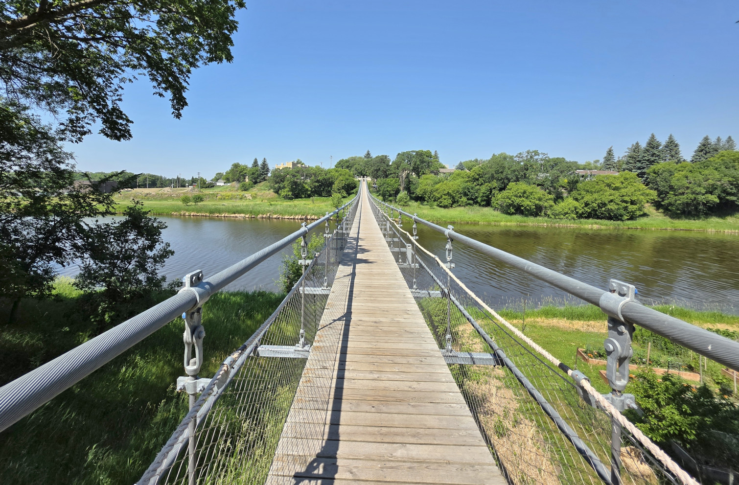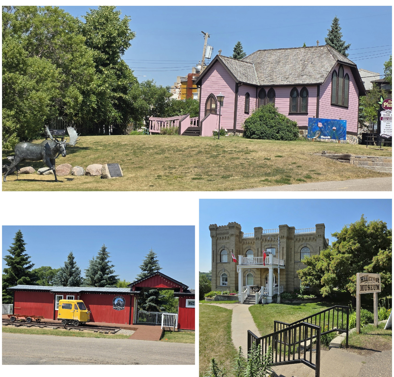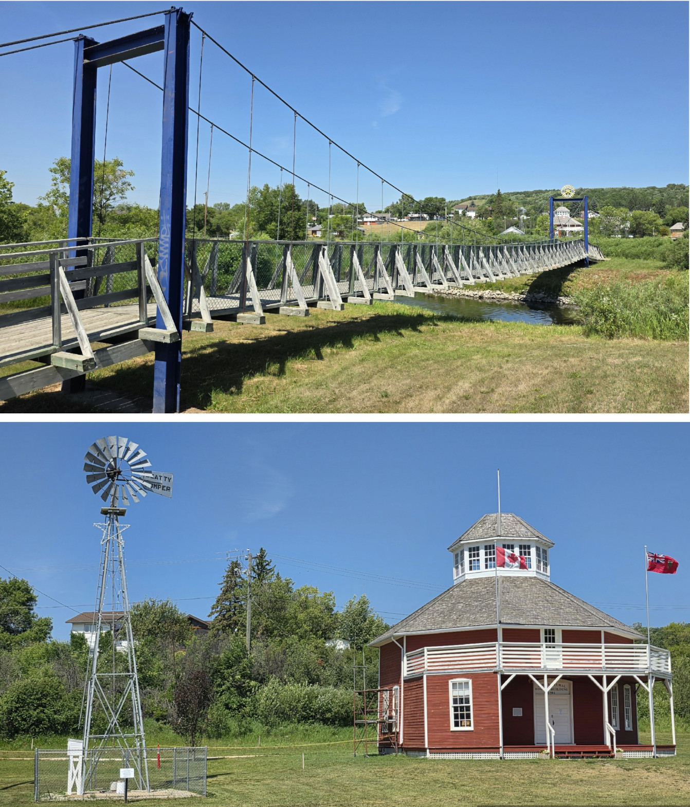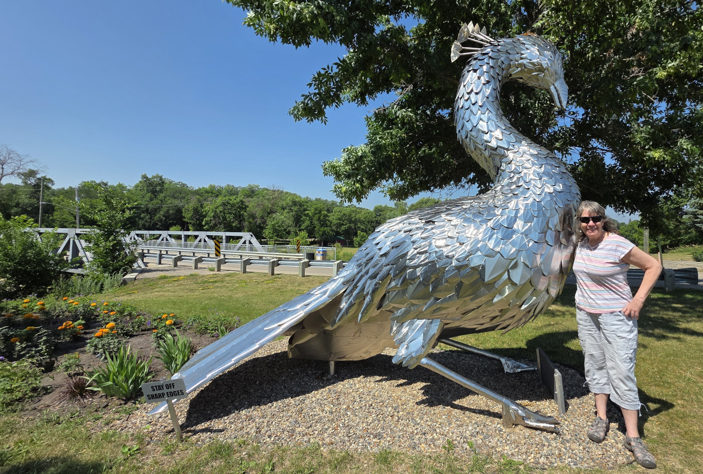The Manitoba tourist guide recommended the town of Souris to see Canada’s Longest Swinging Suspension Bridge at 604’. The first suspension bridge was built in 1904 but was then swept away by floods on the Souris River in 1976. The second bridge was cut loose in 2011 to avoid shore damage from flood waters. The current bridge was built 5’ higher in 2013 and has incredibly strong cables so should last a long time. We crossed the bridge towards town and could see the remnants of the original bridge, which looked pretty dicey. Next, we drove around Victoria Park and saw the Peacock statue. We could hear the live Peacocks they have in the town, but we didn’t see any of the actual birds. We also saw the Hillcrest Museum, the Railway Museum, and The Plum Souris Heritage Museum, but they weren’t open when we were there. We went out for lunch in the Whistling Donkey restaurant/bar.