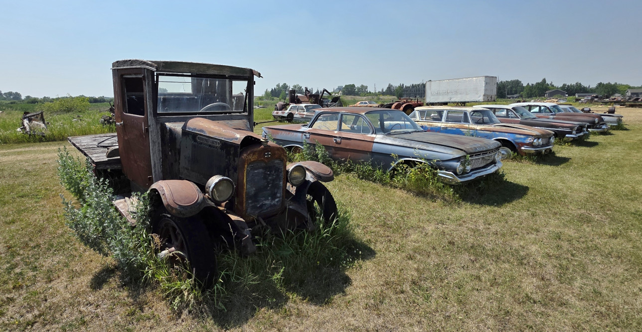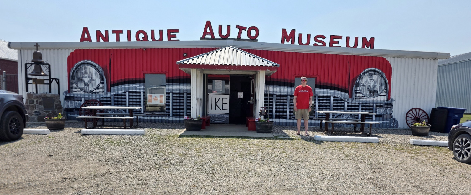 Our last stop in Manitoba was the Antique Automobile Museum in Elkhorn. Sharon’s dad Gunnar had donated his 1955 Packard to the Museum. It was supposed to have been driven in the July 1st parade the day before, but the test driver felt the brakes weren’t working properly so it wasn’t able to be driven. We spent a couple of hours looking around the museum at the cars, the schoolhouse, the 1912 Pioneer house, the 1905 Church, the old gas station, and the outside collection of cars still to be restored.