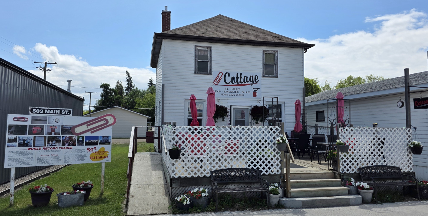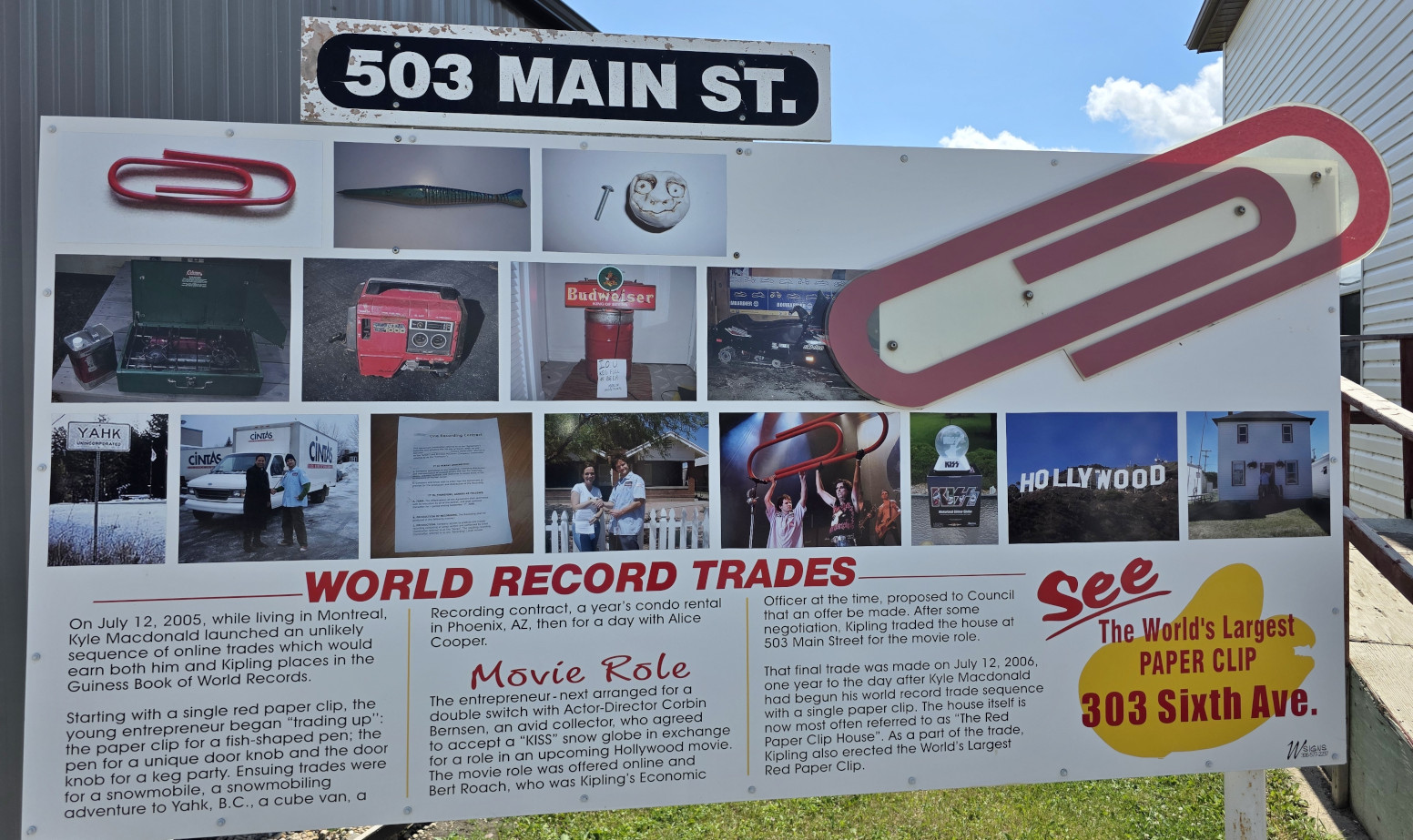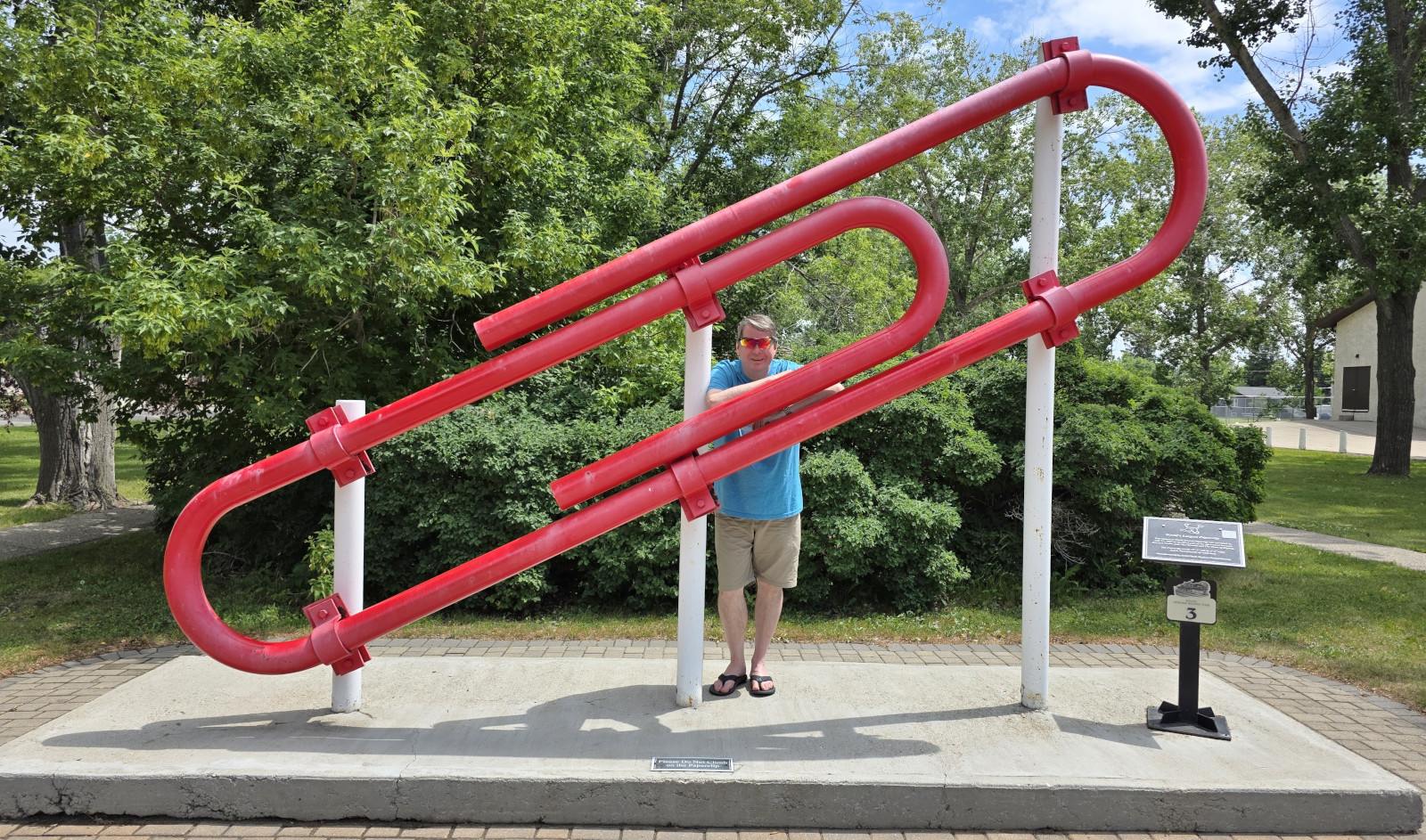 Our next stop was Kipling where you can see the World’s Largest Red Paperclip which was made to celebrate the famous trade up story. In 2005 Canadian Kyle MacDonald did 14 trades over the span of 1 year to work his way from 1 red paper clip up to a house in Kipling Saskatchewan (you can read about it here: From paper-clip to house in 14 trades). The record red paperclip is 15’ 2” long and is made of 3043 lbs. of steel. The actual house Kyle traded for is now a bakery, but it wasn’t open on Sunday.