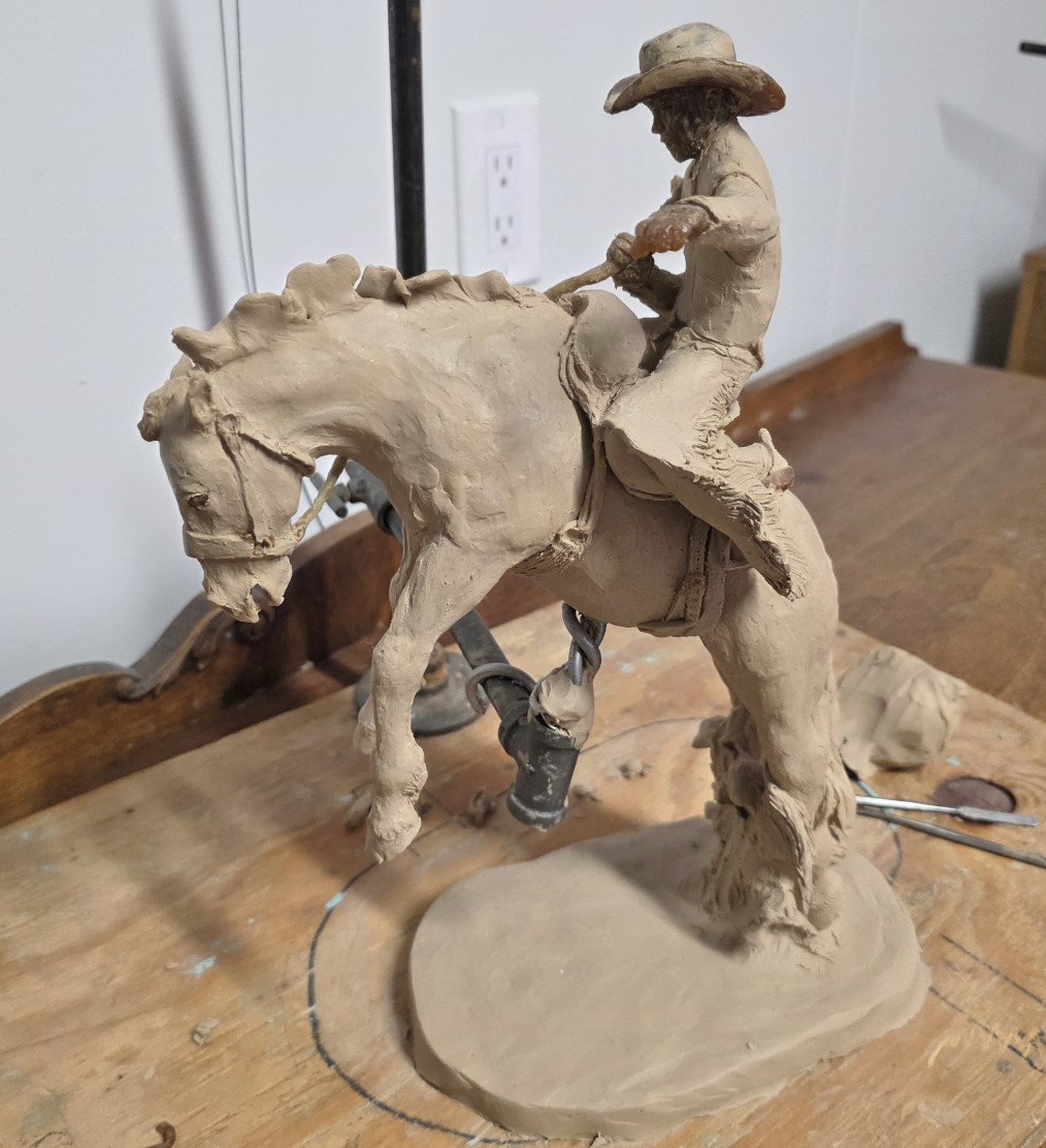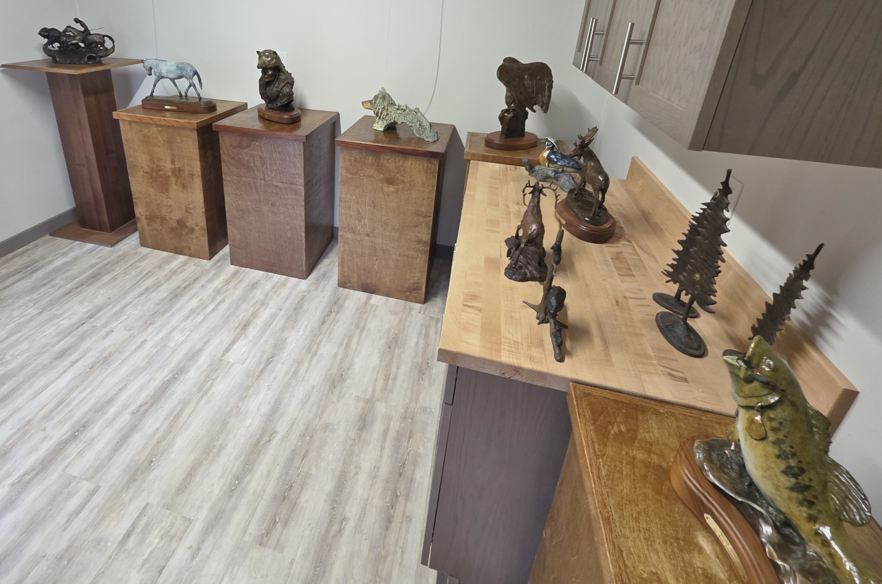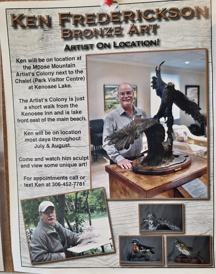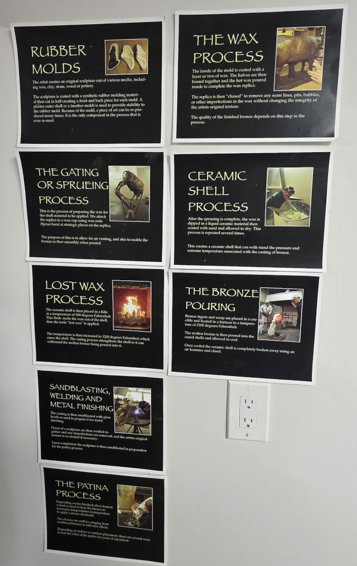 The next morning, we had really heavy rain (our first of this trip) so it stopped our plan to go Mountain Biking. Finally in the afternoon it cleared so we got the bikes out and rode to the Visitor centre. There were some artists in residence buildings, and we spent about 40 minutes with a bronze statue artist as he explained all the steps involved in making a bronze statue. It’s quite a fascinating and involved process and if you zoom in on the slide it will show you all the steps. The artist Ken Frederickson actually has made some of the statues/trophies used for the contestants of the Calgary Stampede.